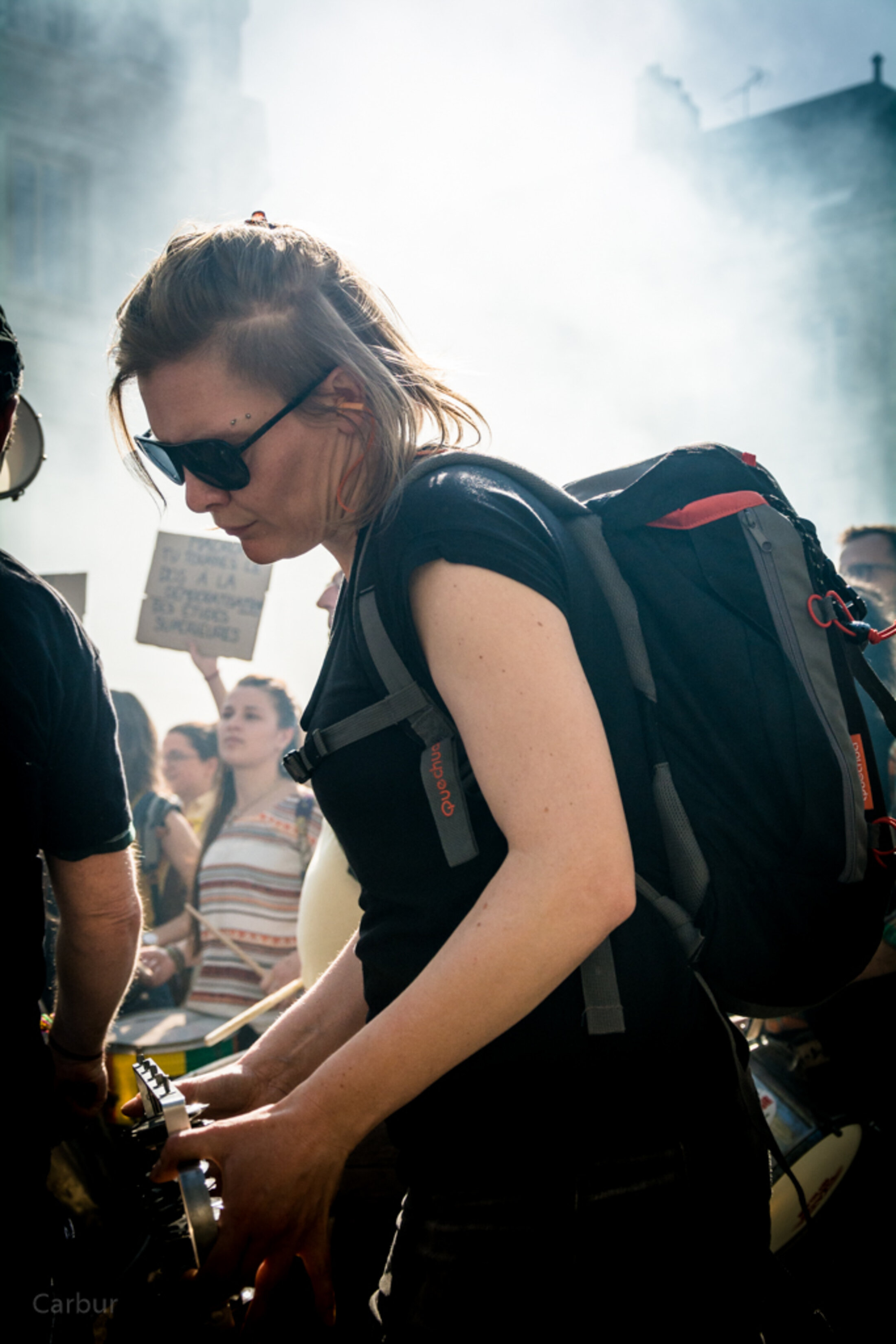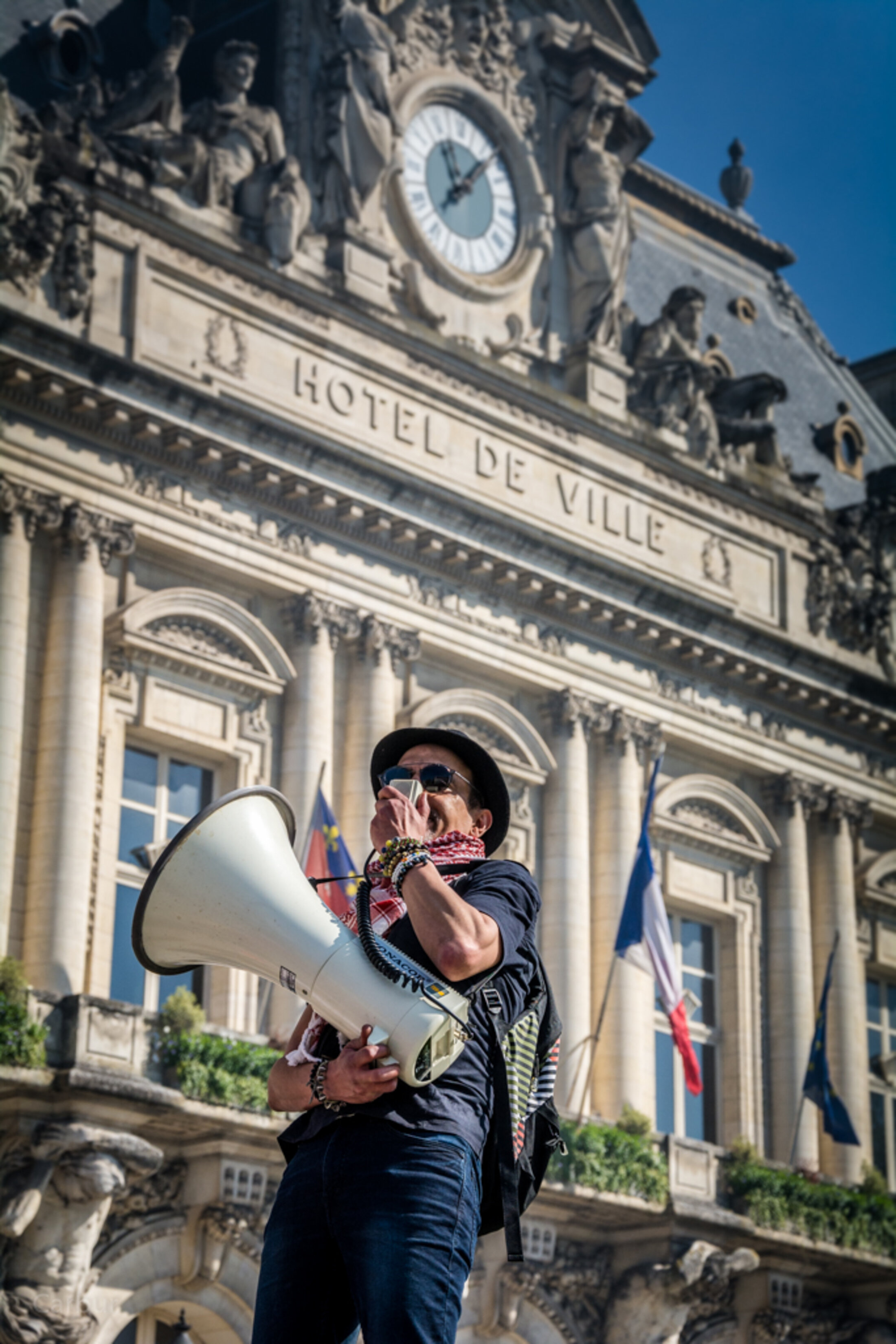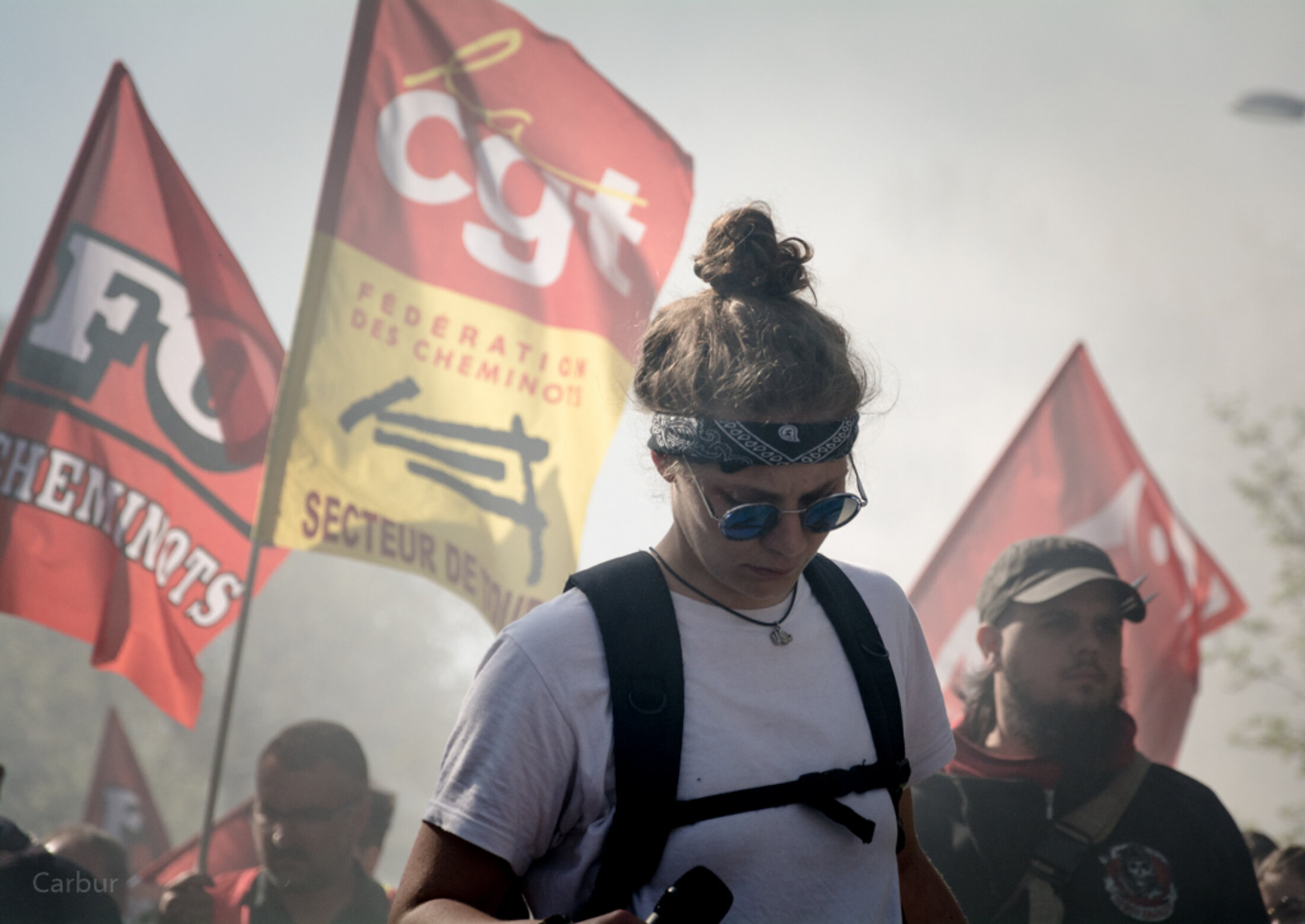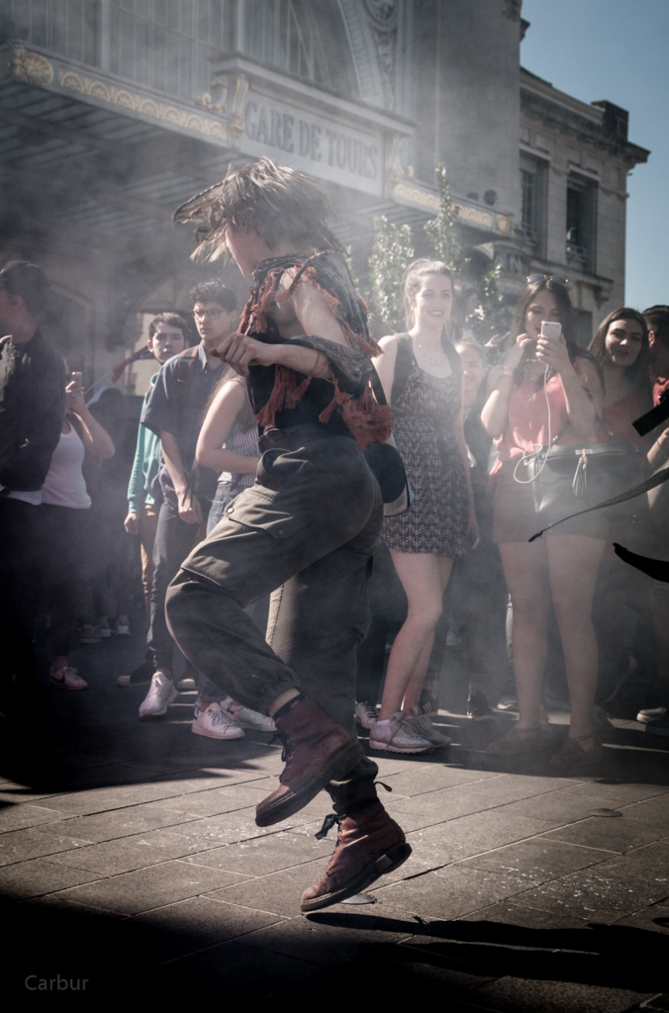 19 avril. Le cortège est arrivé sur le parvis de la gare de Tours, la sono du camion crache de la musique. On danse. Des syndicalistes de la SNCF déclament des discours peu écoutés, des pétards d'avertissement secouent le parvis que quelques policiers en civil surveillent, sinistres.