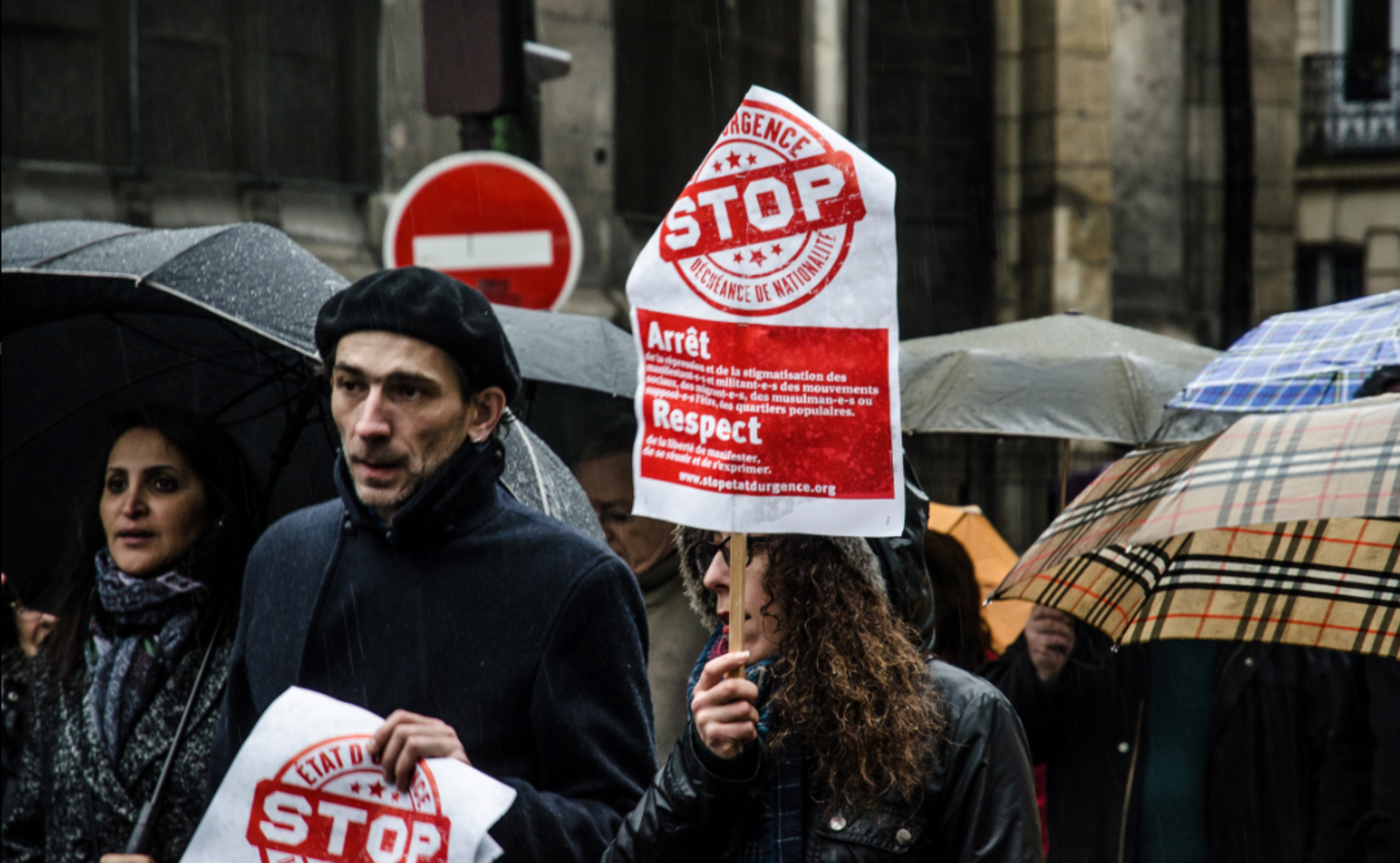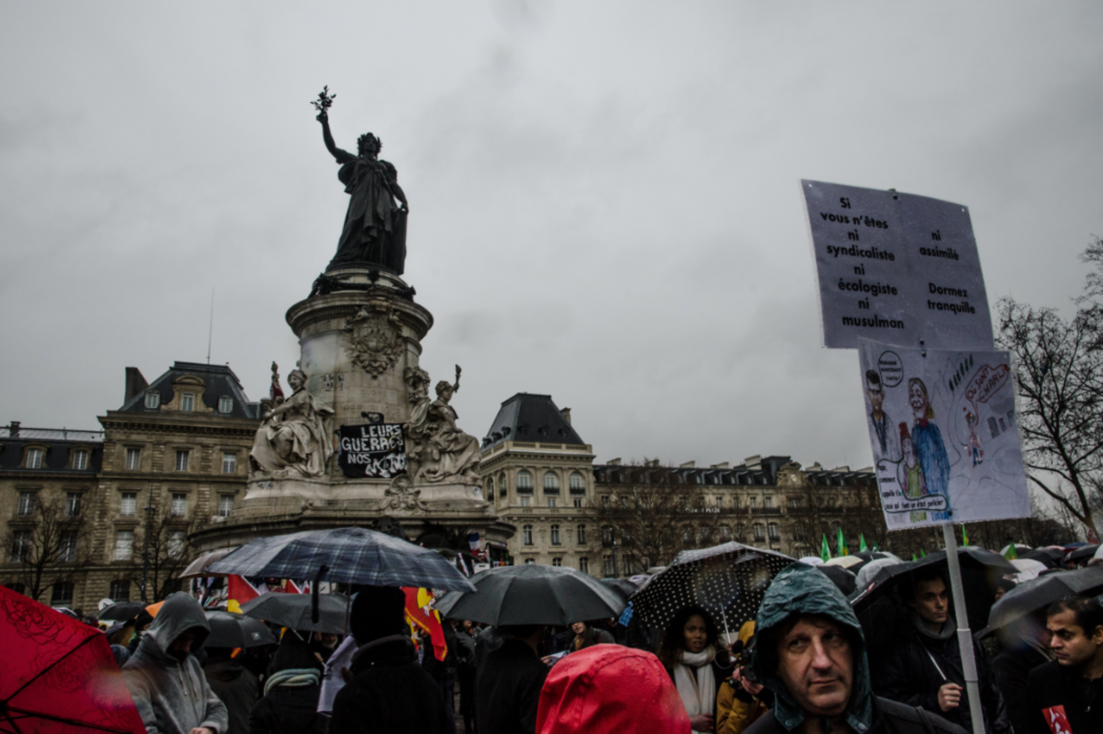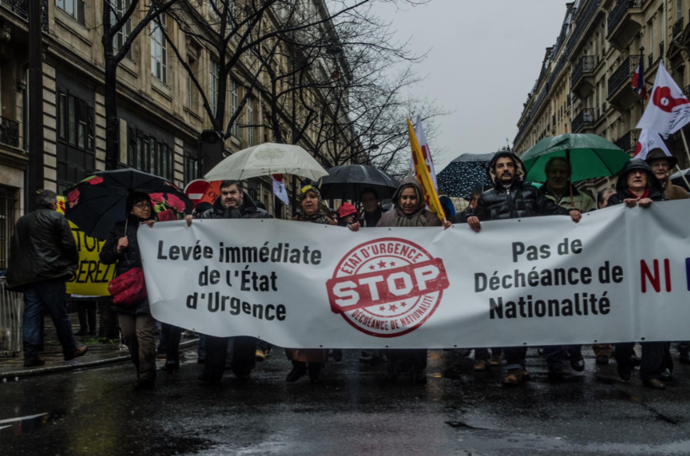 A 14h30, des milliers de personnes se rassemblent Place de la République, à Paris, pour manifester leur opposition à l'état d'urgence et à l'extension de la déchéance de nationalité. Ils répondent à l'appel des collectifs "Stop à l'état d'urgence" et "Nous ne cèderons pas", qui agrègent des dizaines de syndicats et d'associations. Les étendards de la CGT flottent aux côtés de ceux de la Ligue des Droits de l'homme (LDH) et de la Confédération nationale du travail (CNT).