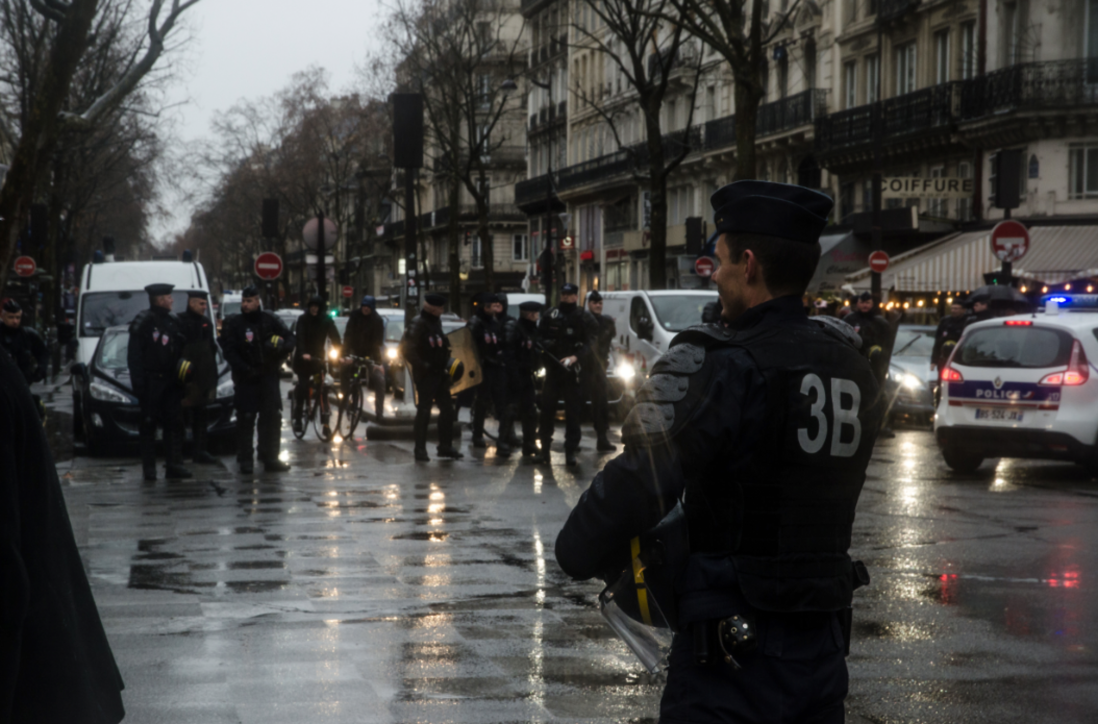 La tête du cortège est précédée d'une importante escorte policière. Des dizaines de camions de CRS, dont un camion anti-émeute. Des cordons de policiers régulent le trafic à mesure que la manifestation progresse.