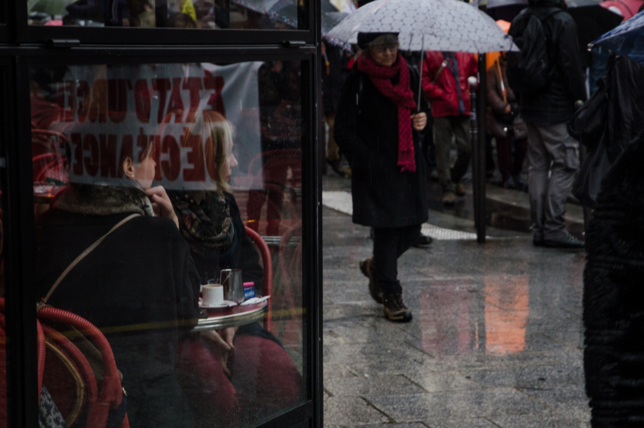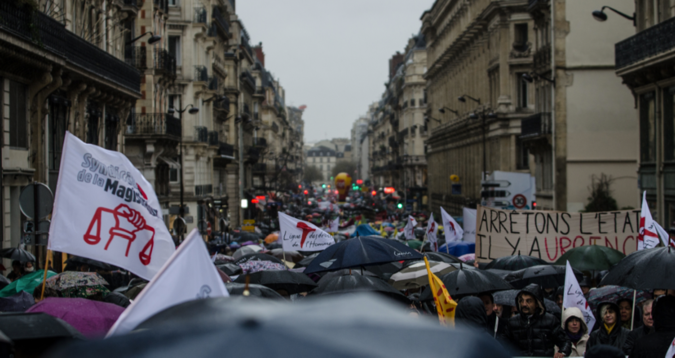 Les parapluies et les banderoles recouvrent la rue Etienne Marcel.
