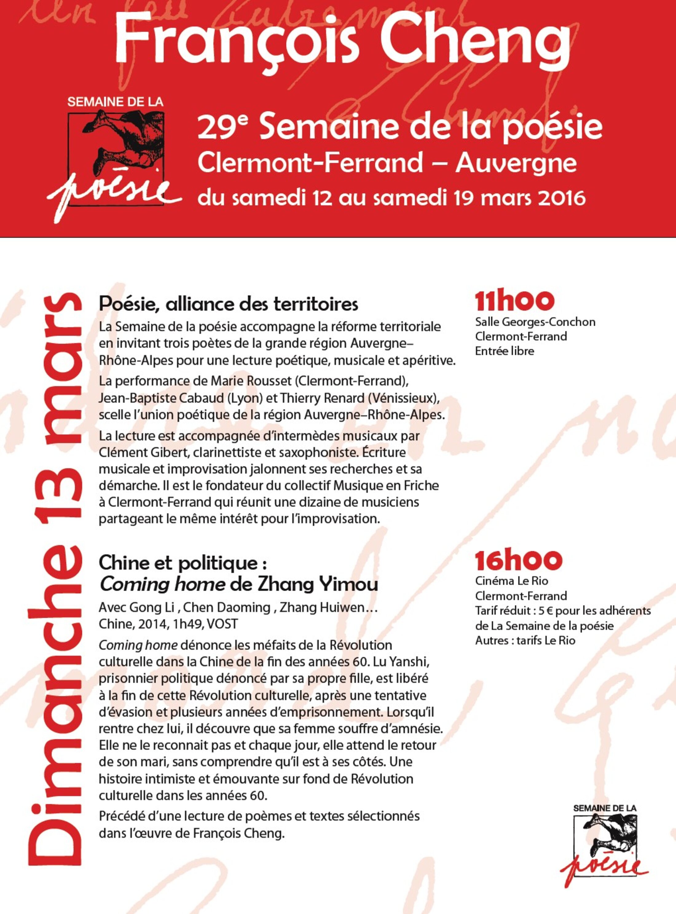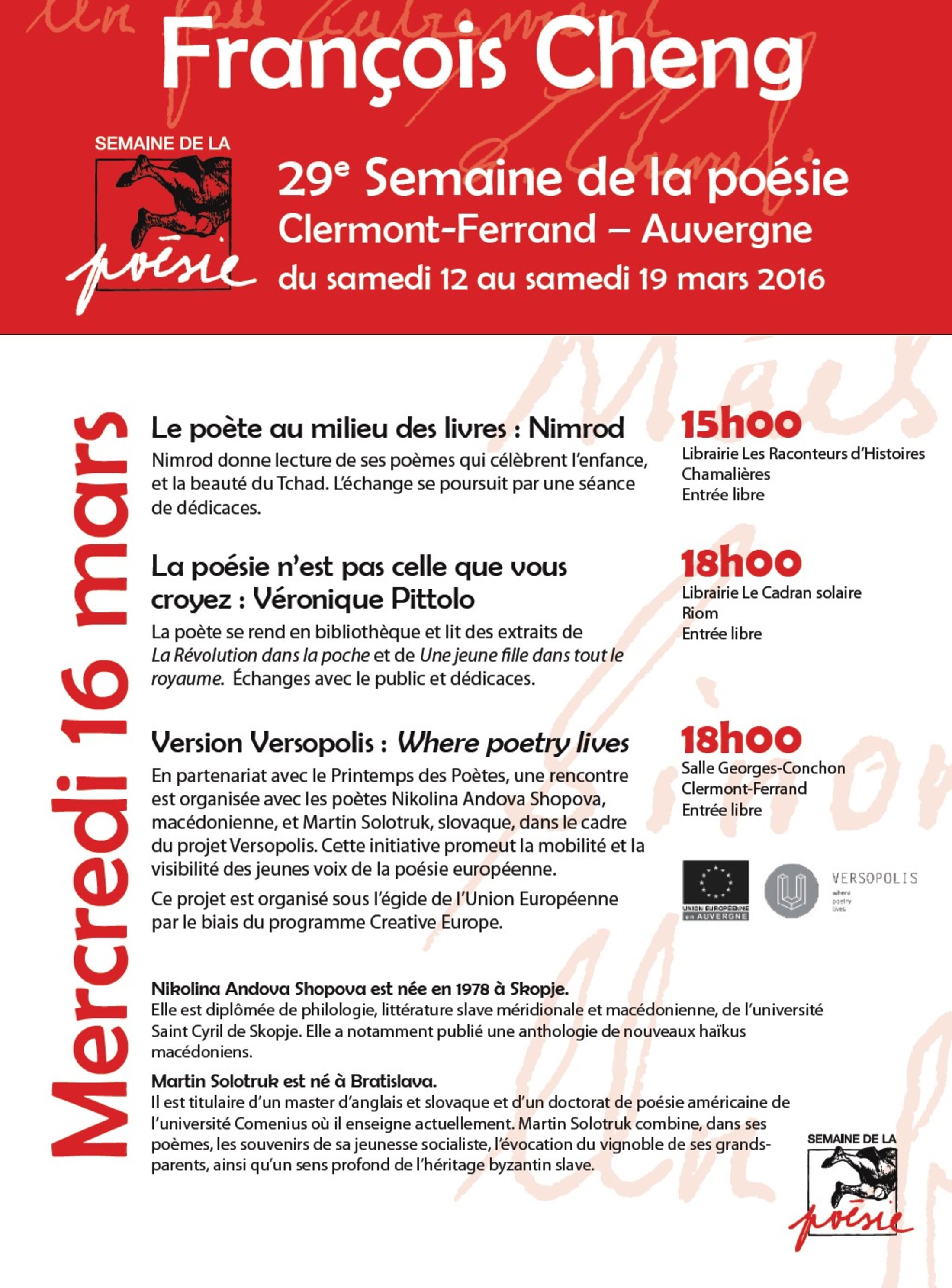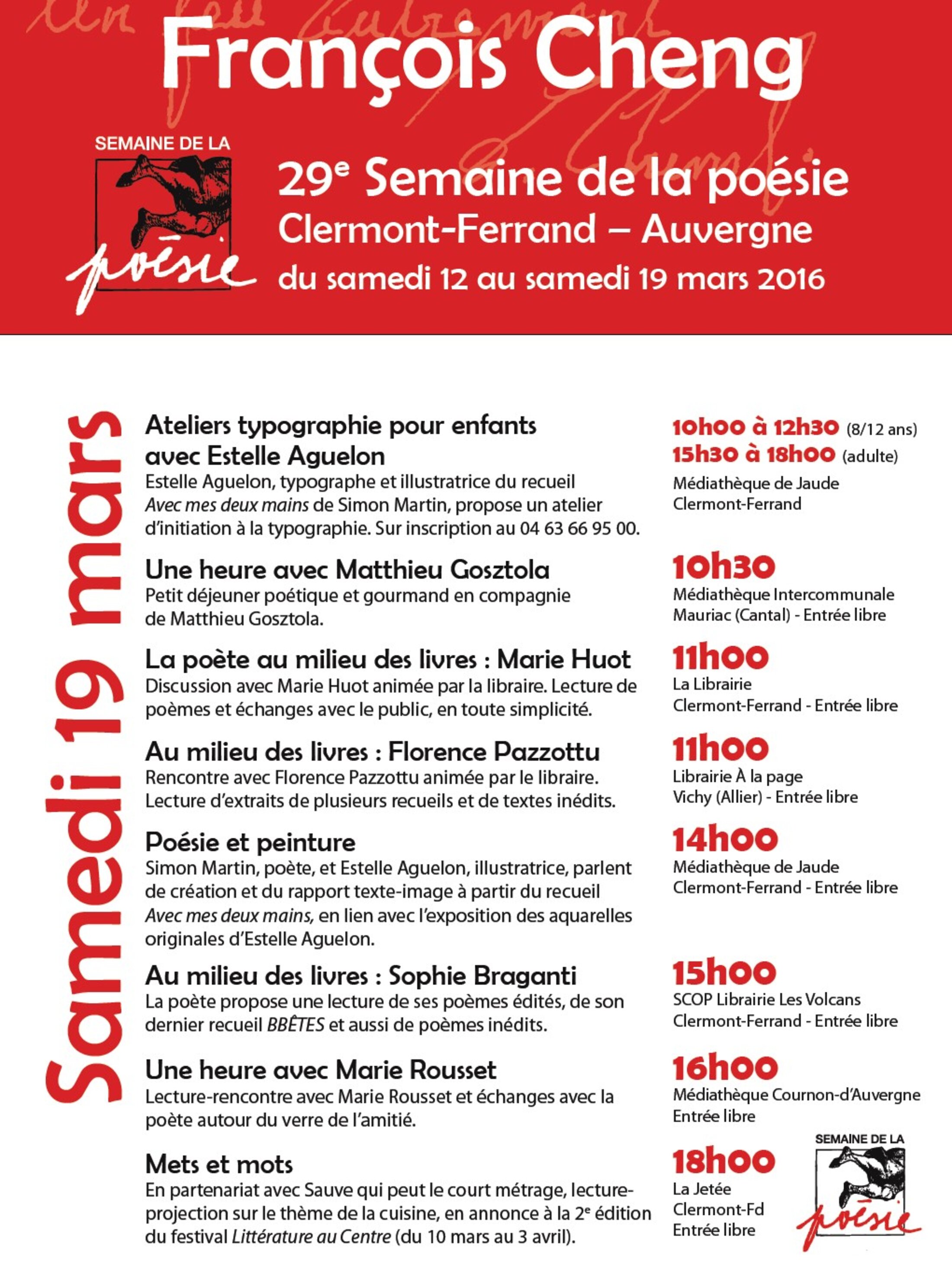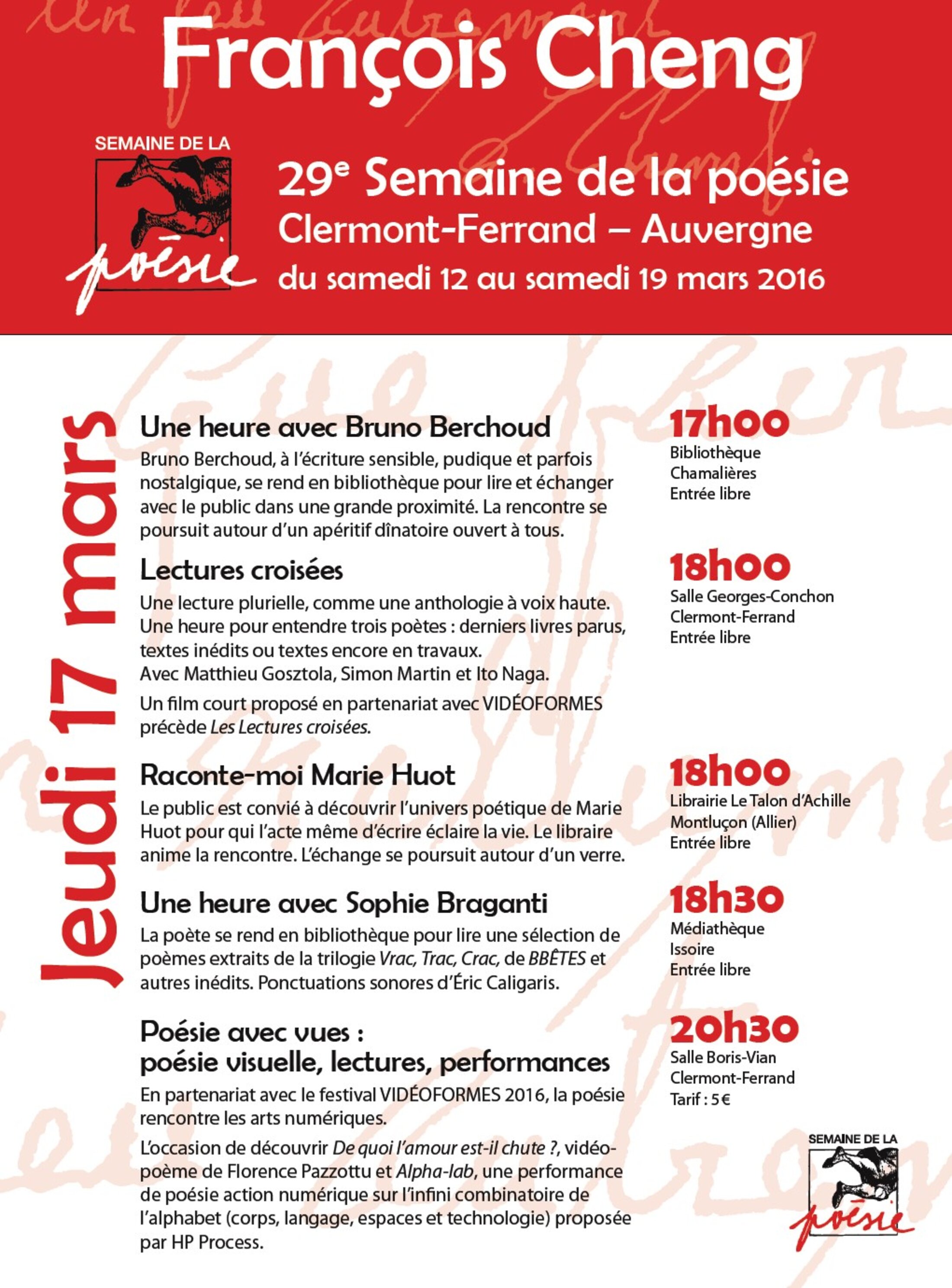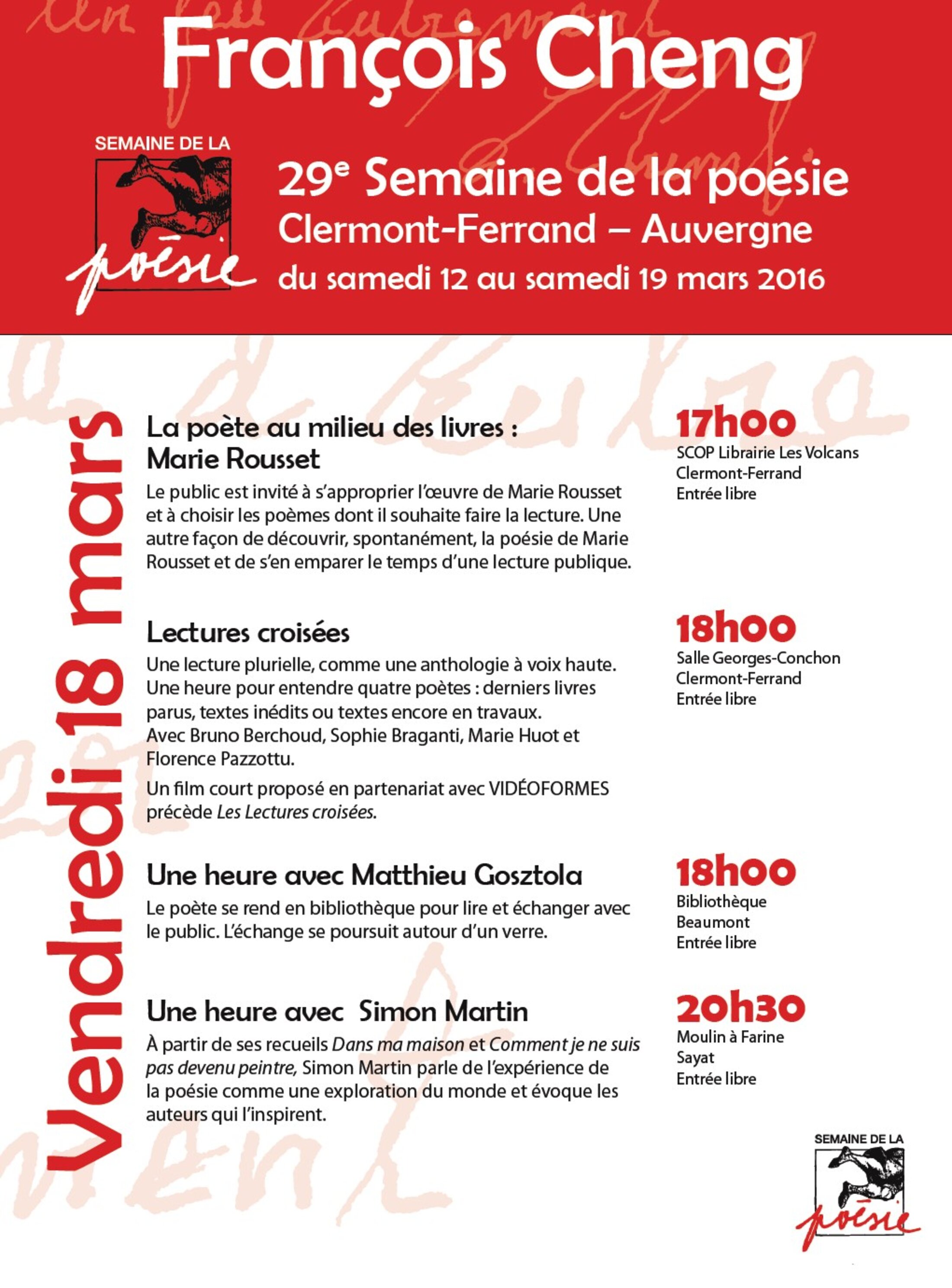 Du 12 au 19 mars 2016, c'est la 29ème édition du festival La Semaine de la poésie à Clermont-Ferrand et dans toute la région. Pendant toute la semaine, la ville vibre au son de la poésie contemporaine.