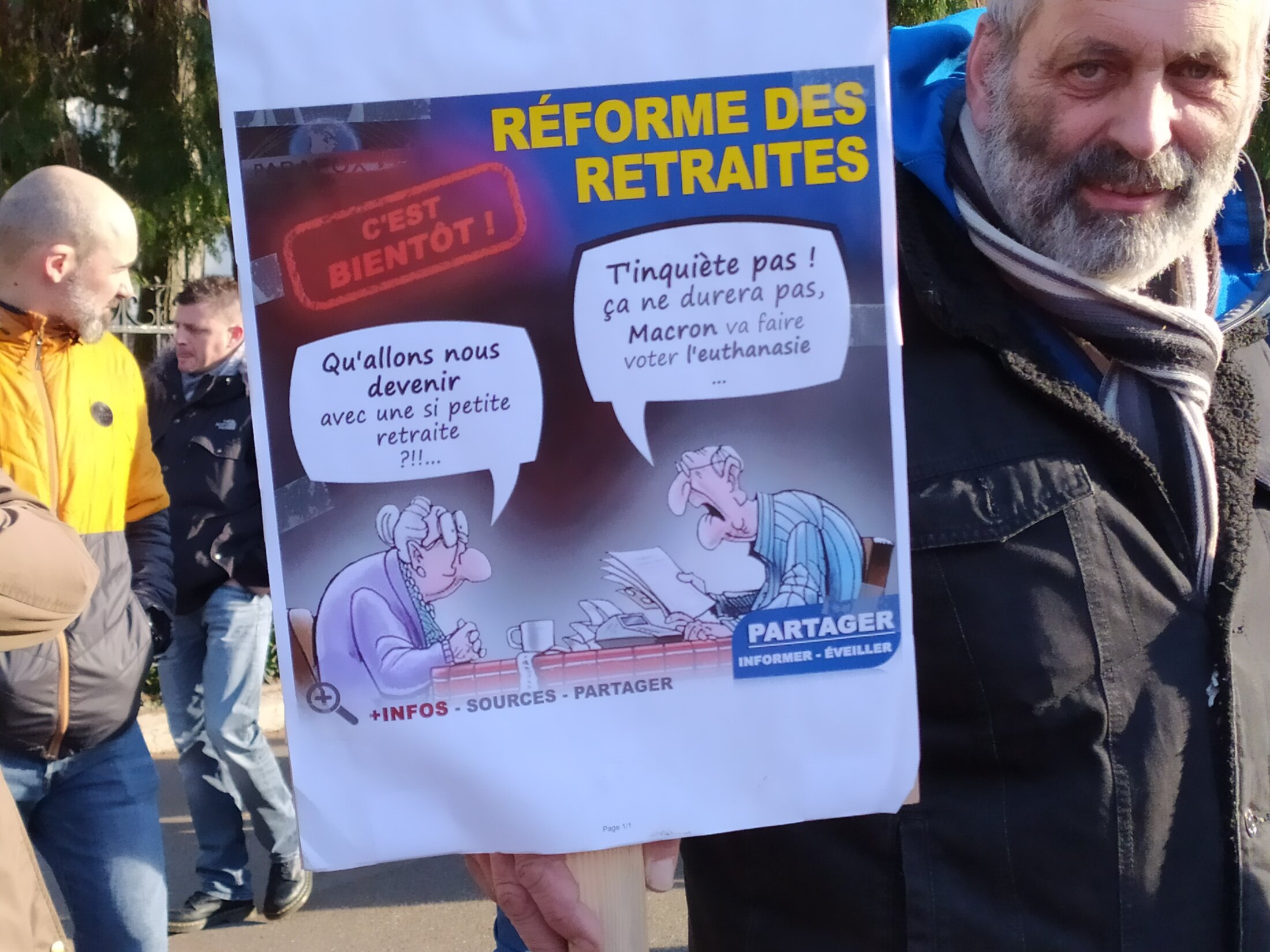 - Agrandissement : Illustration 1  - Banderole de tête : Pour la défense de nos retraites, Retrait de la réforme Macron.