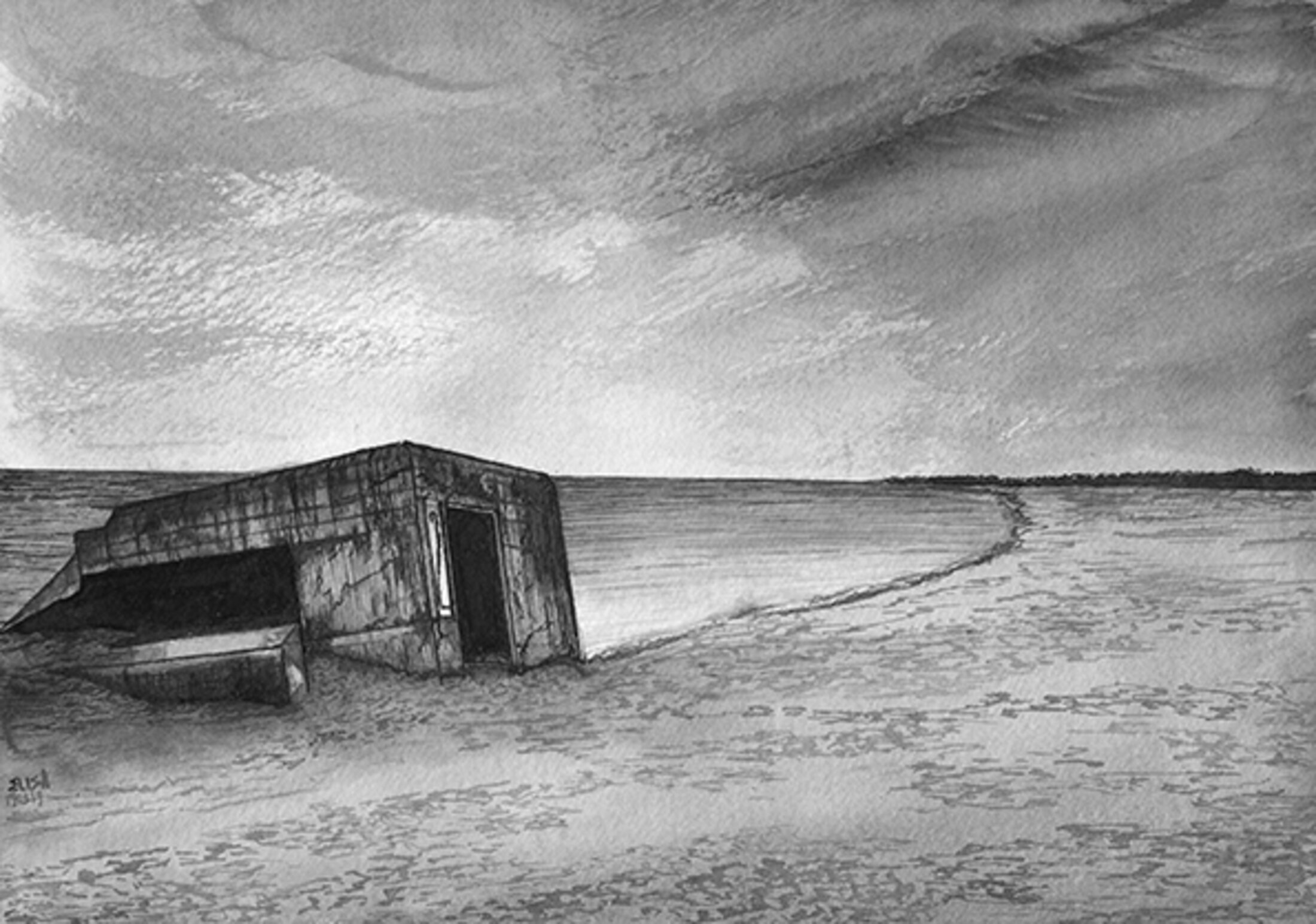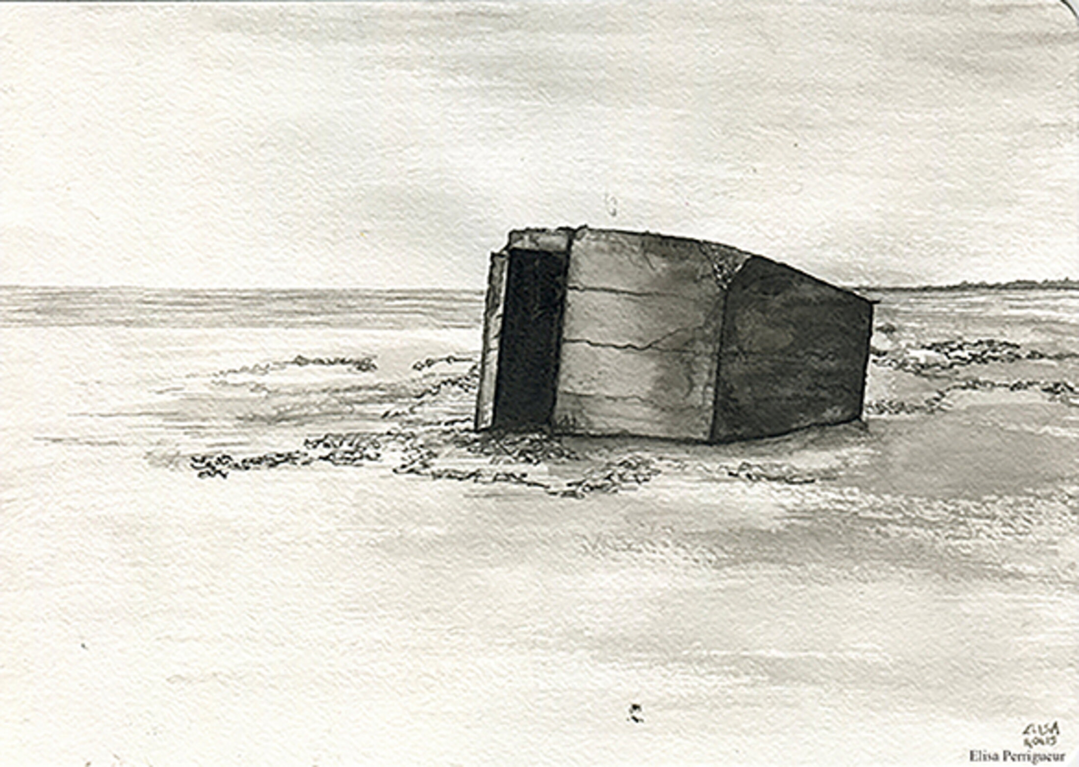 Les blockhaus* parsèment la côte française. Ces édifices massifs figés sont entourés d'une nature mouvante qui, elle, poursuit son oeuvre. Conçus par l'armée allemande, ils sont nés d'un processus d'accélération de l'Histoire : accélération de la destruction, de la mort, de la création d'armes de défense... donnant une esthétique particulière aux paysages désertiques.