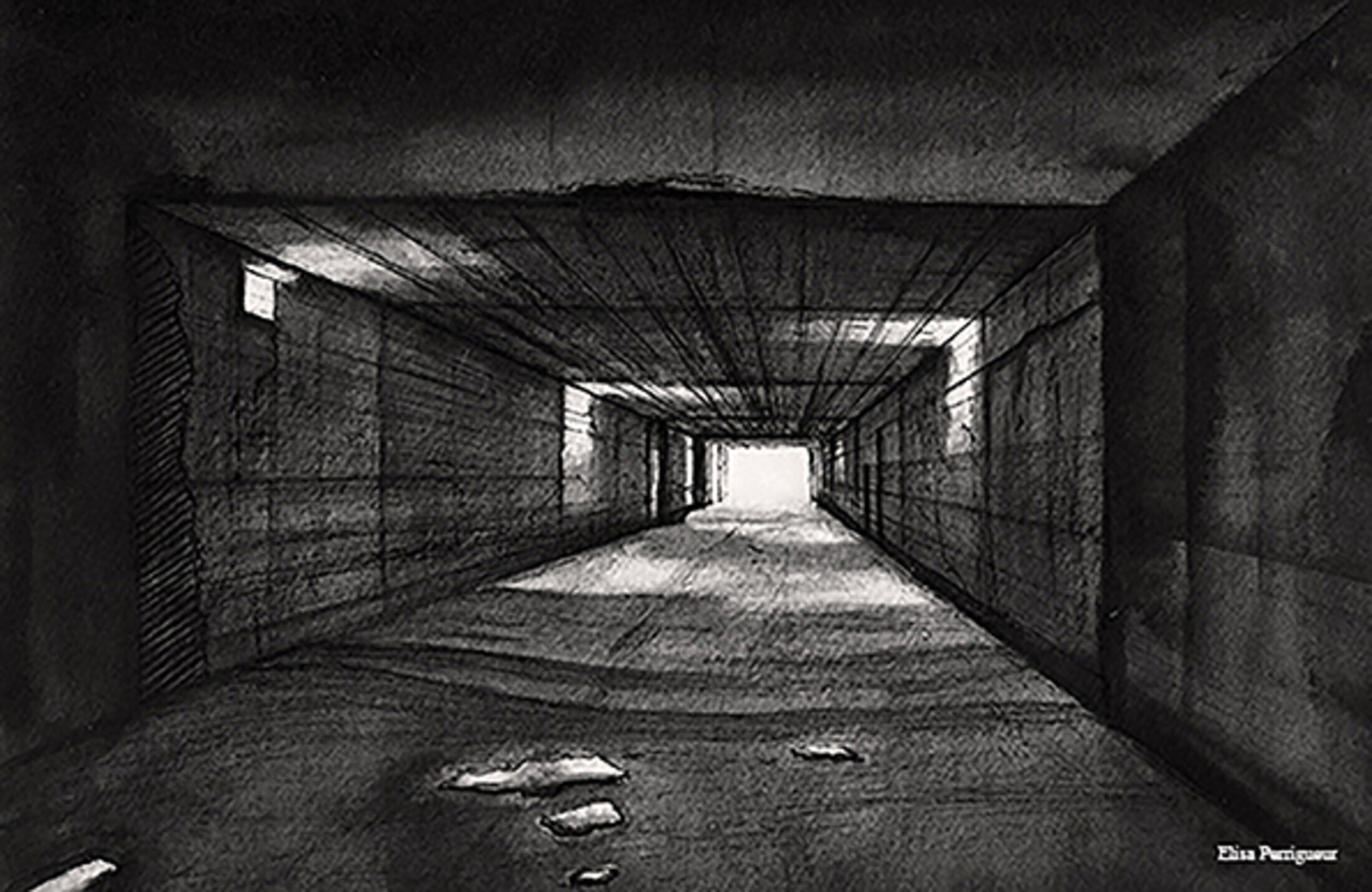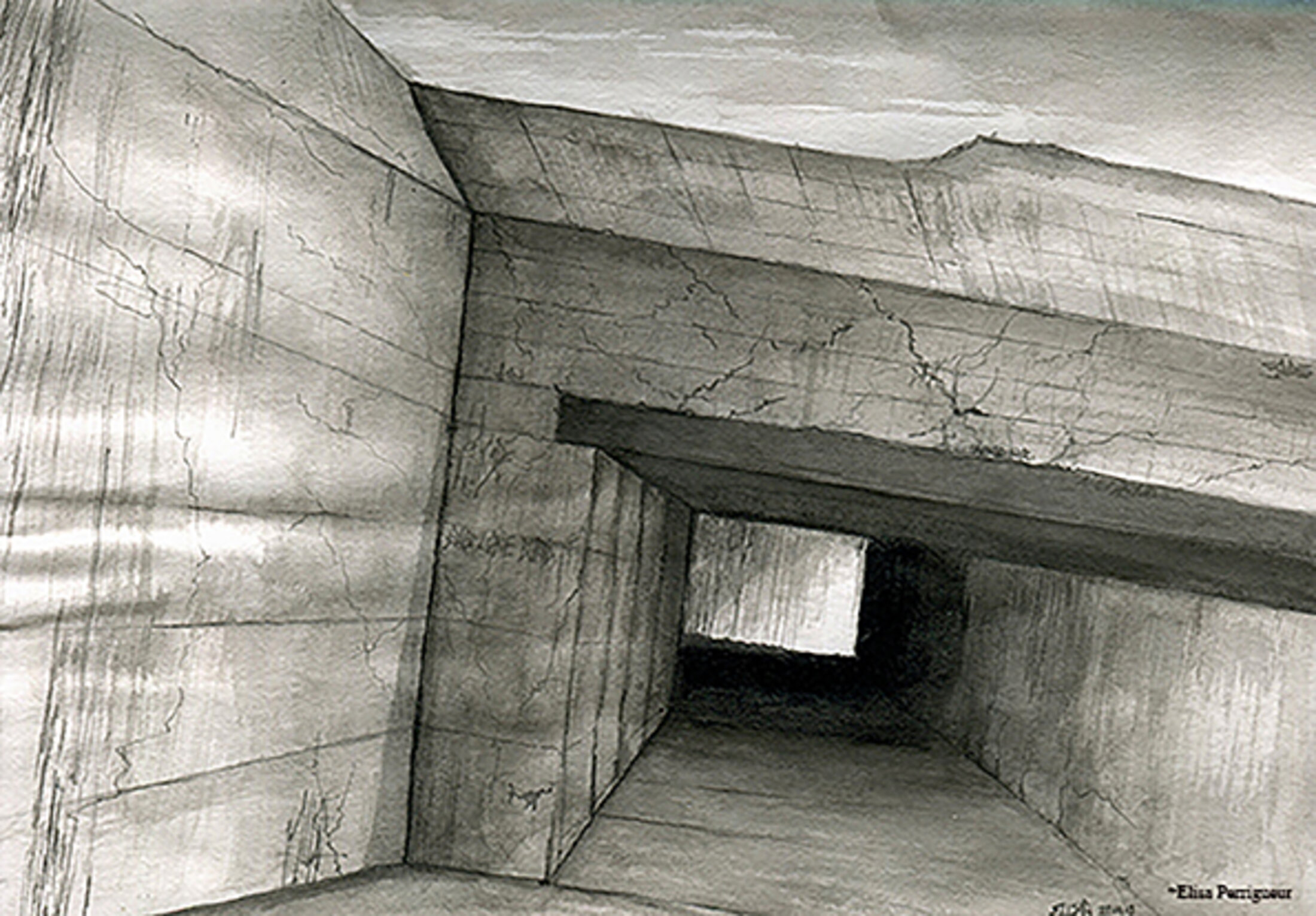 "Le plus impressionnant fut pour moi immédiatement la sensation, à la fois interne et externe, d'écrasement. Les murs à fruits qui s'enfonçaient dans le sol et faisaient de ce petit blockhaus un socle solide, la dune avait envahi l'espace intérieur et l'étroitesse du local était encore accentuée par l'épaisseur de sable qui noyait la surface du plancher". Paul Virilio, Bunker Archéologie