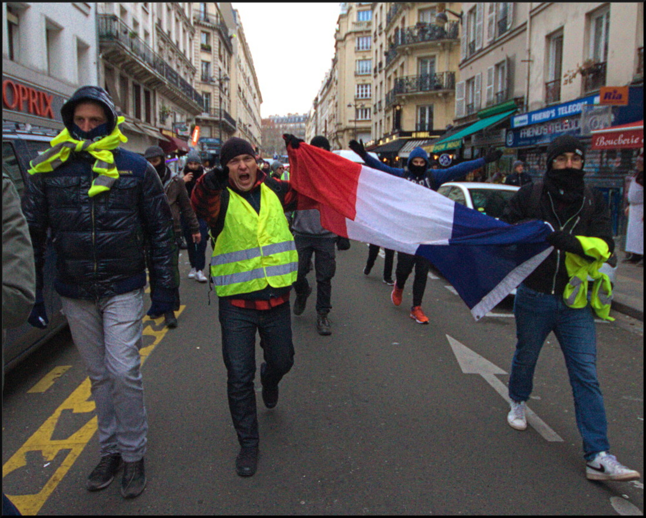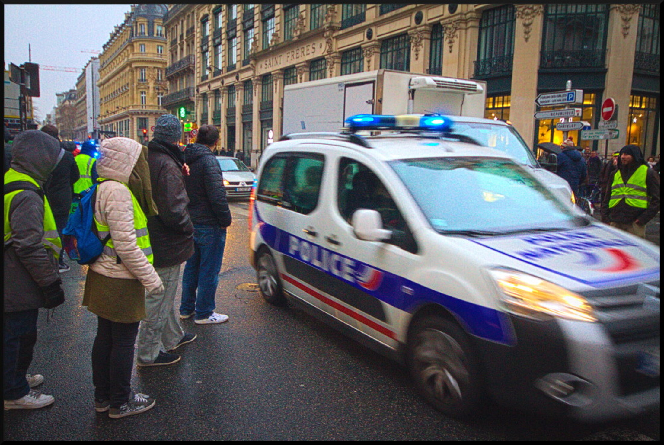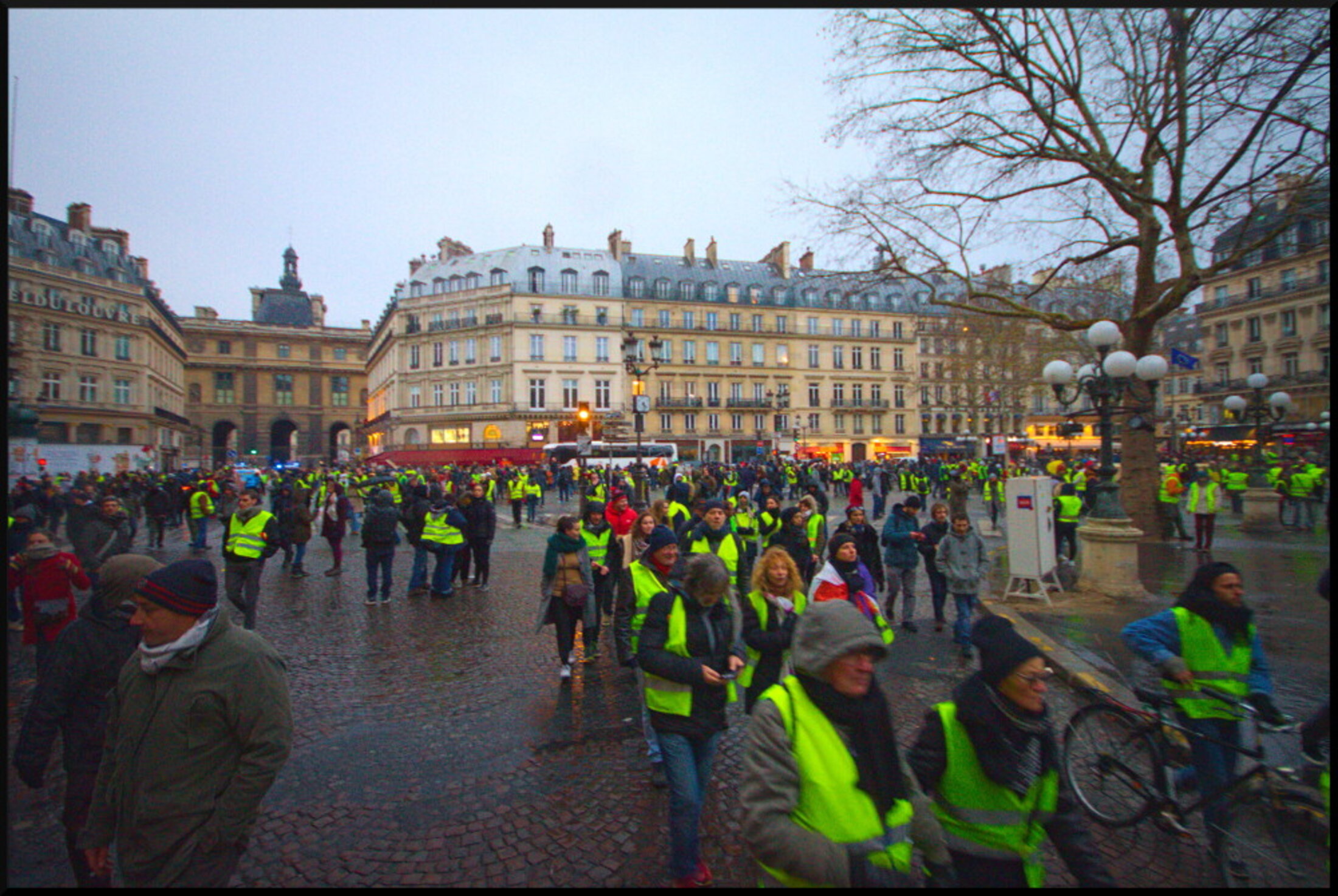 Saint Lazare et Opéra "nassés", Champs Elysées bouclés, police nulle part Gilets Jaunes partout. Avec les Gilets Jaunes mobilisés, bravant le froid et la pluie, dans le Paris populaire et le Paris guindé.