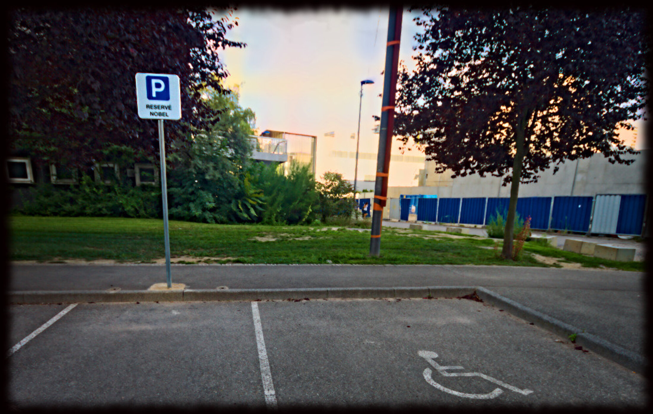 A gauche (en haut) "Parking réservé Nobel", à droite (en bas) ...