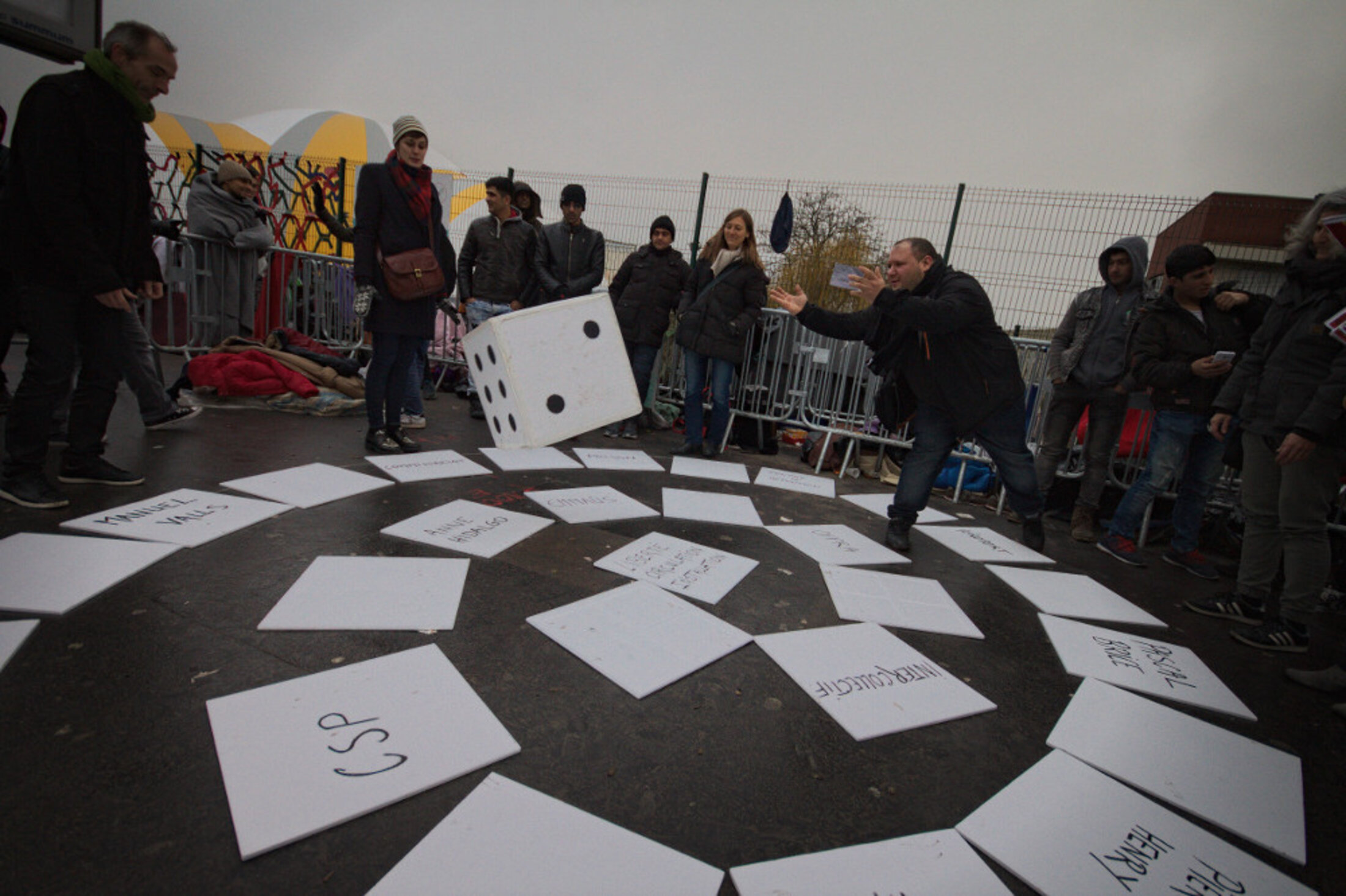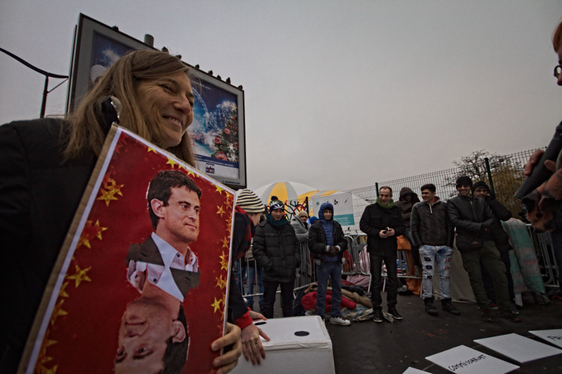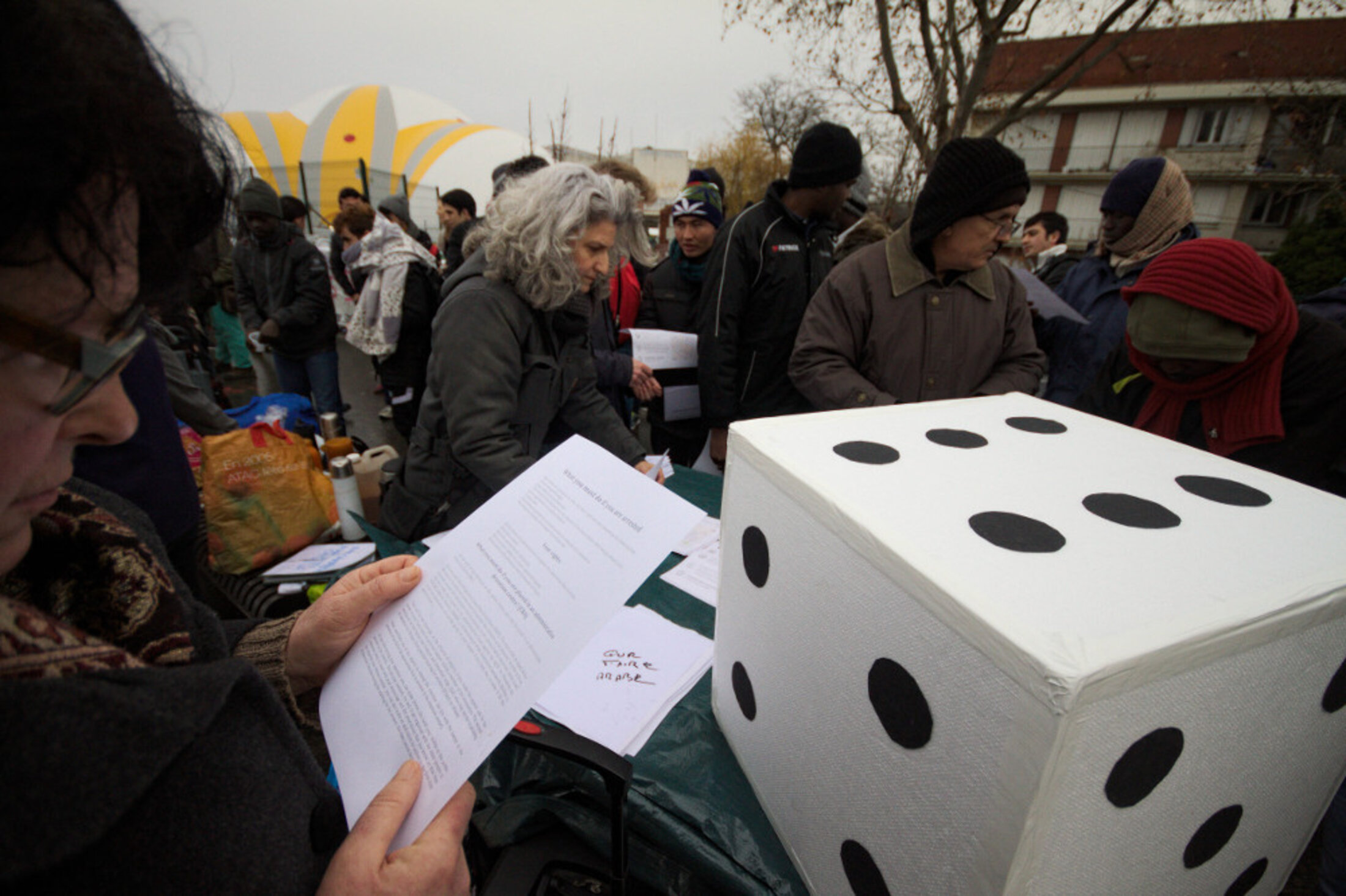 Paris, 23 décembre 2016, Porte de la Chapelle. En cette veille de Noël 2016, en ce lieu du centre d'accueil des migrants, de séjour aléatoire de migrants mineurs, lieu de honte pour le traitement qui est fait à ces derniers aussi, les militants associatifs de la porte de la Chapelle ont organisé un jeu de l'oie pour dénoncer la logique absurde qui régit le traitement des migrants sur notre sol.
