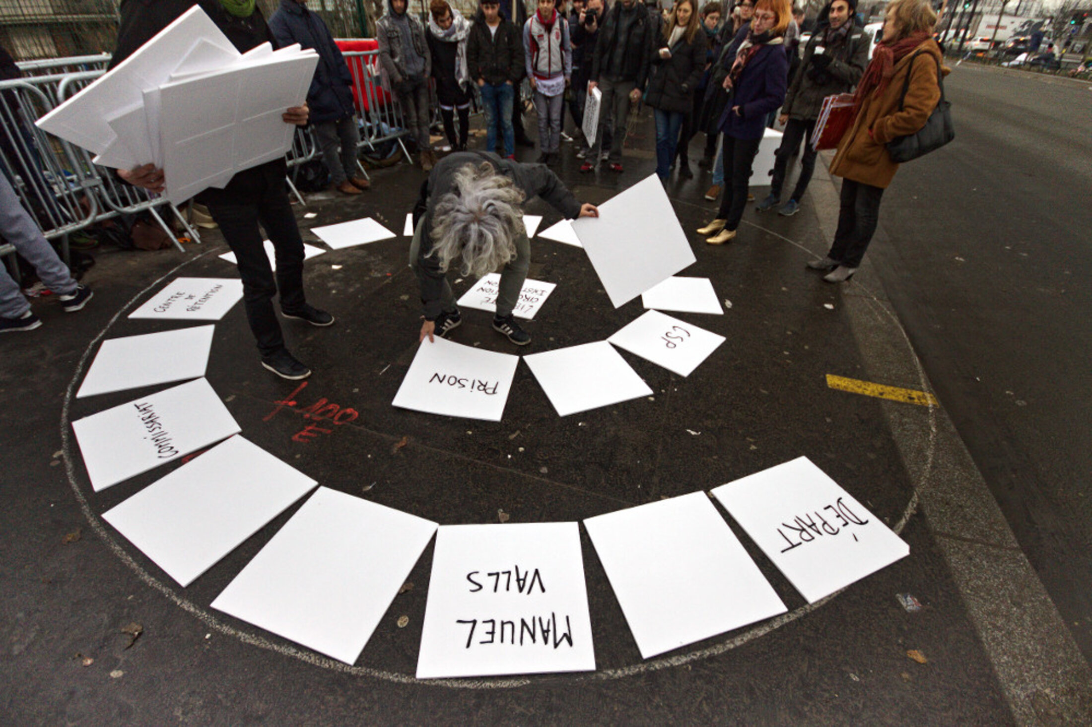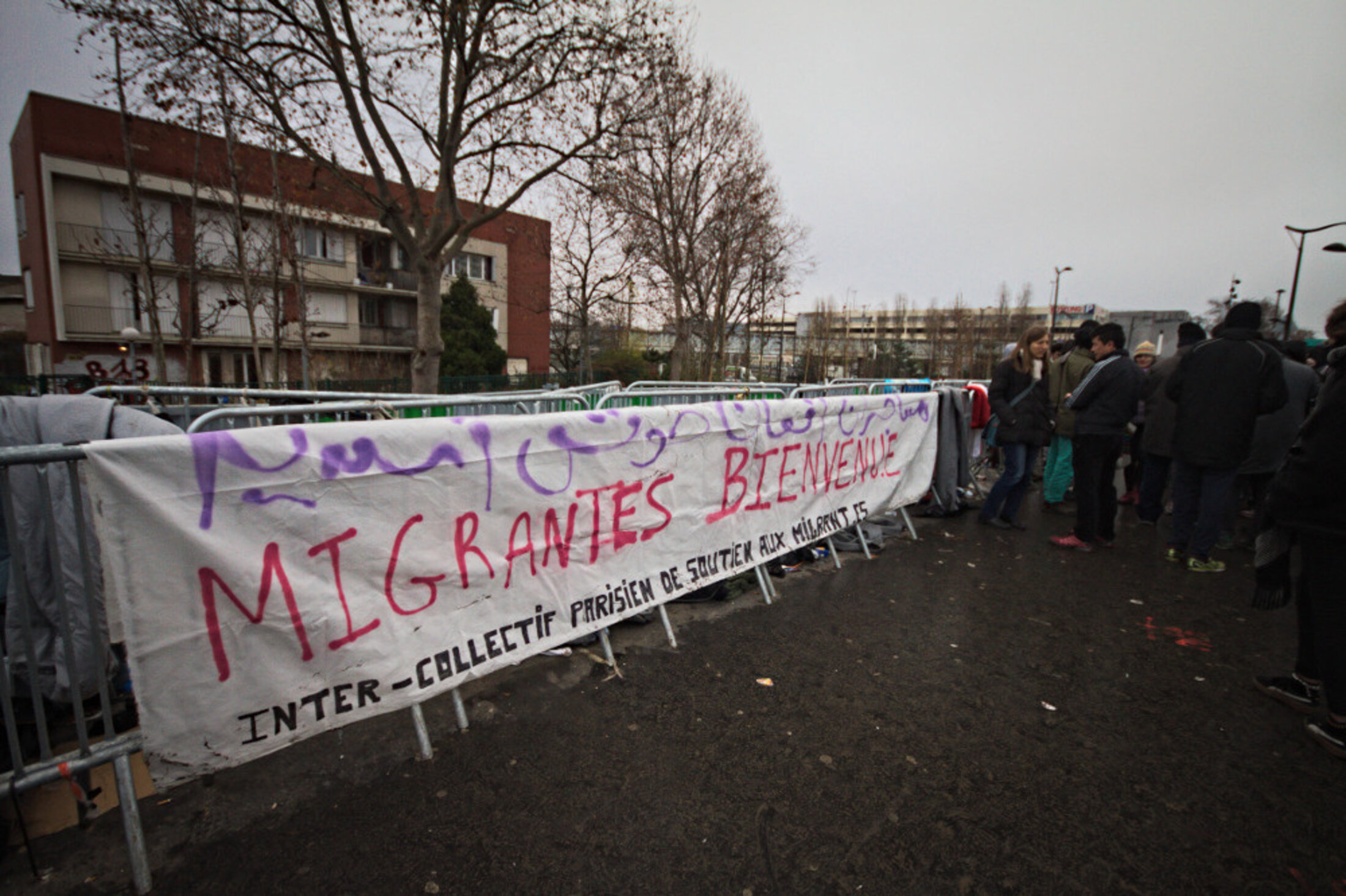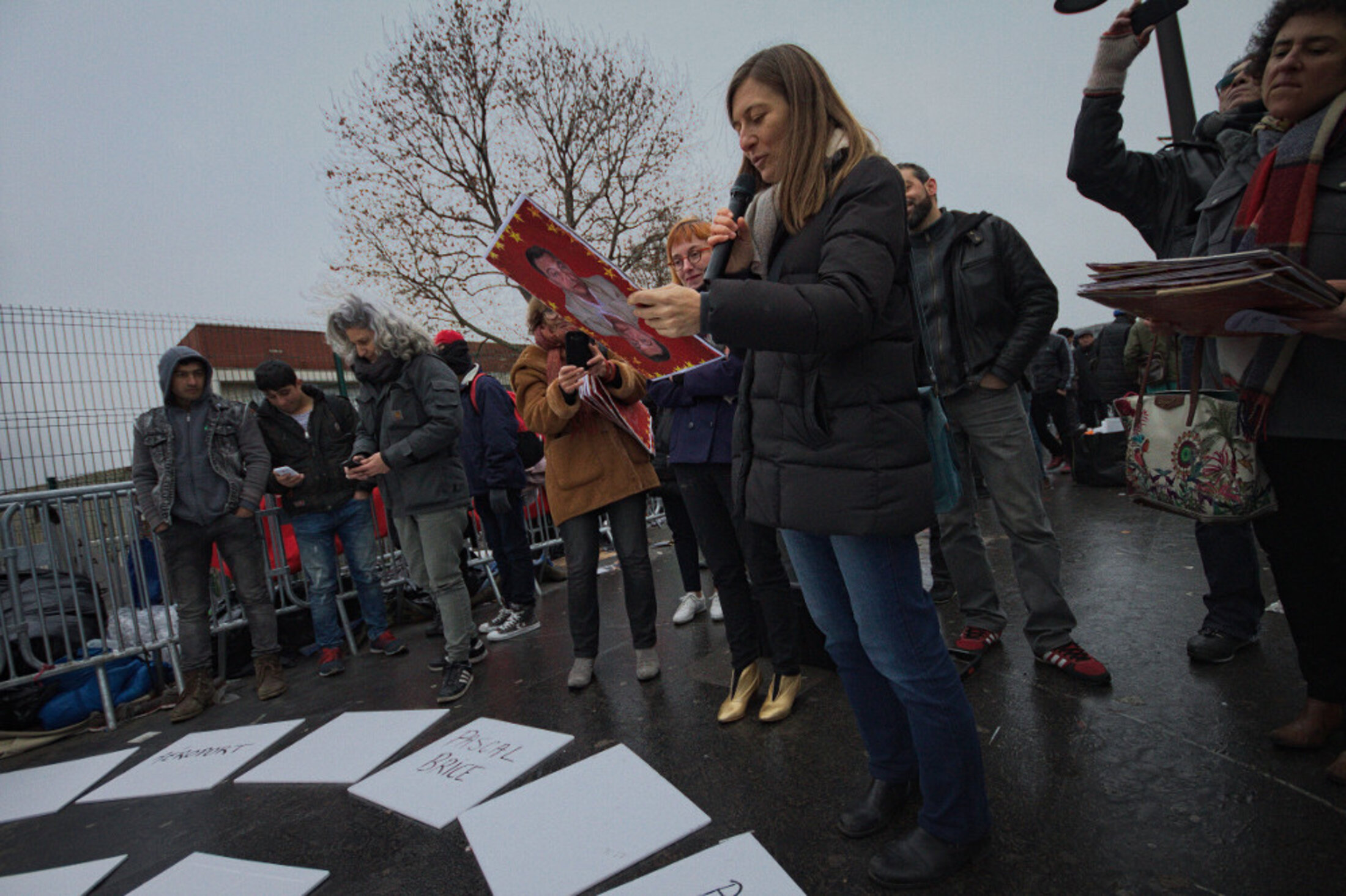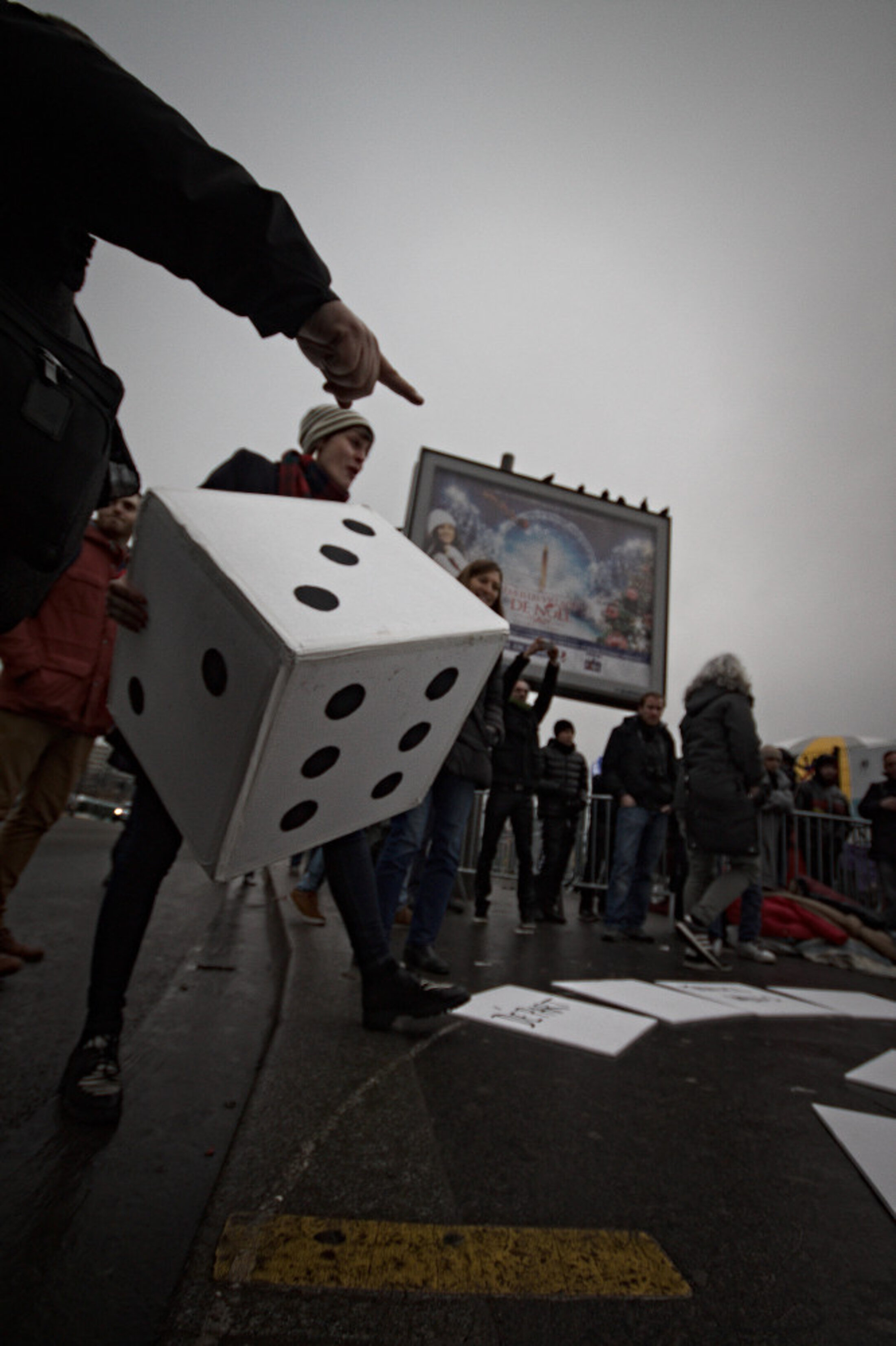 Paris, 23 décembre 2016, Porte de la Chapelle. En cette veille de Noël 2016, en ce lieu du centre d'accueil des migrants, de séjour aléatoire de migrants mineurs, lieu de honte pour le traitement qui est fait à ces derniers aussi, les militants associatifs de la porte de la Chapelle ont organisé un jeu de l'oie pour dénoncer la logique absurde qui régit le traitement des migrants sur notre sol.