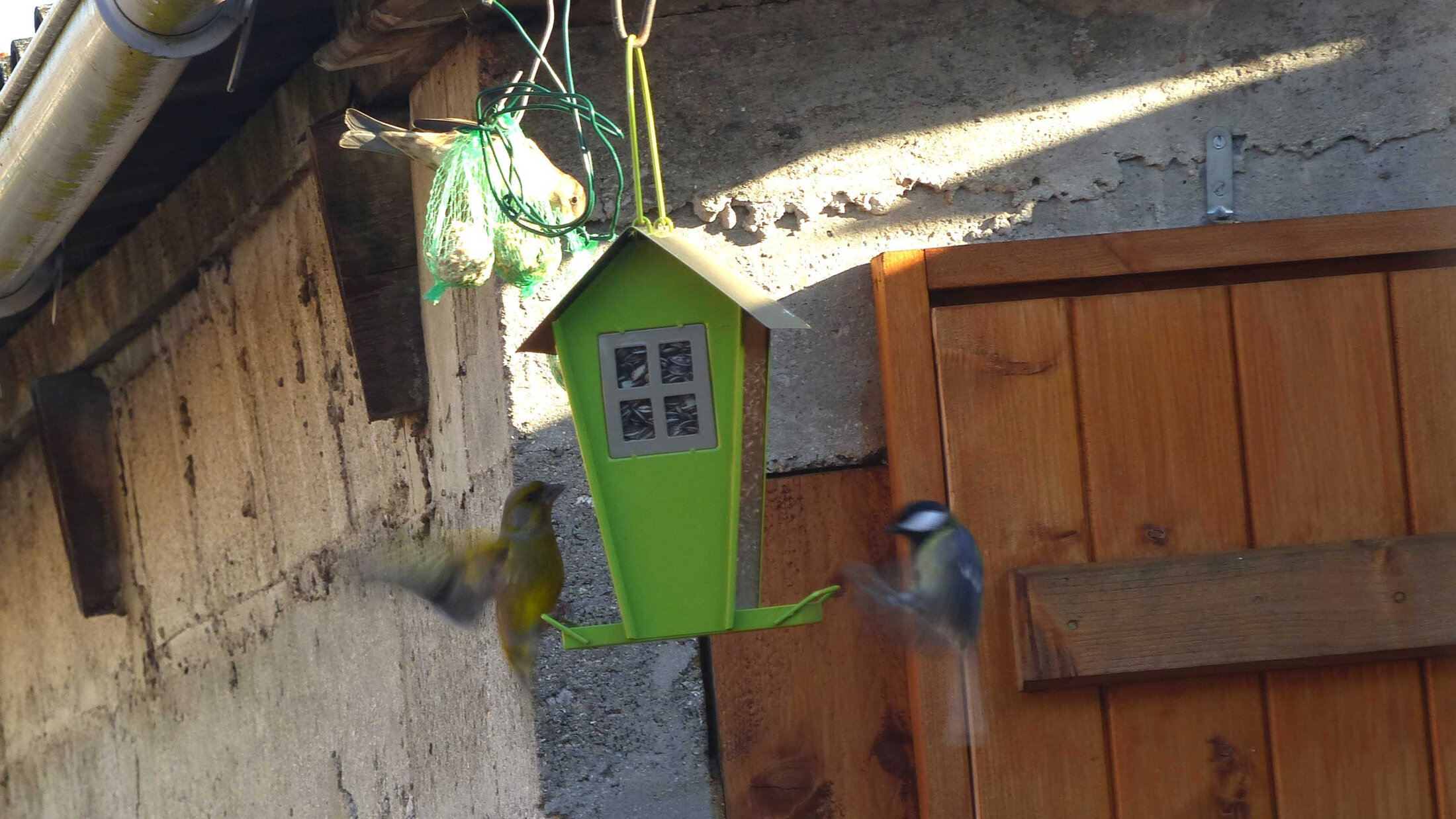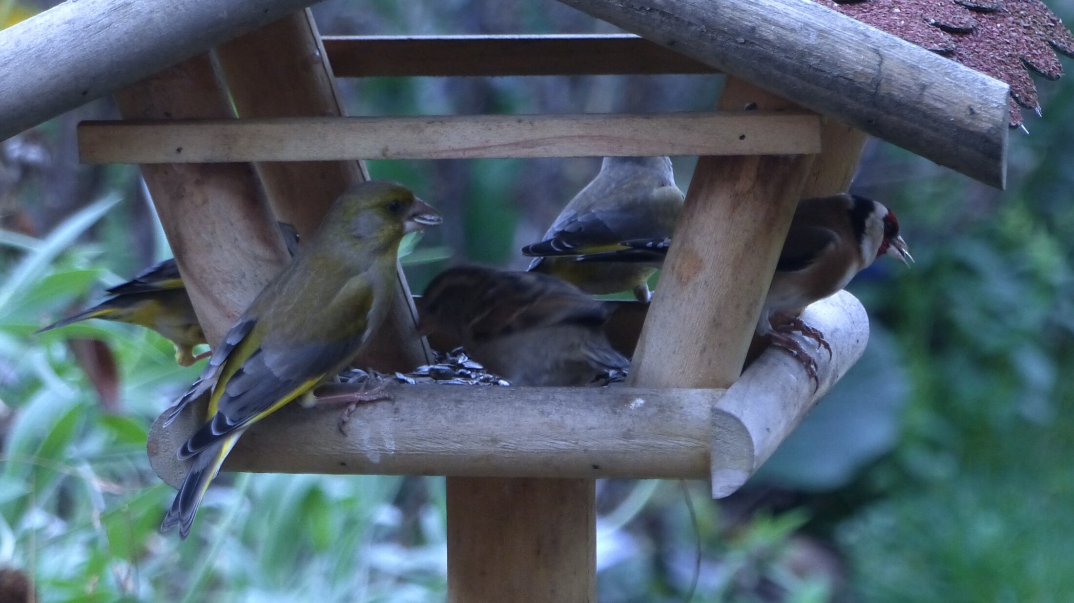 Repas en commun : Chardonneret, verdiers et moineau domestique.