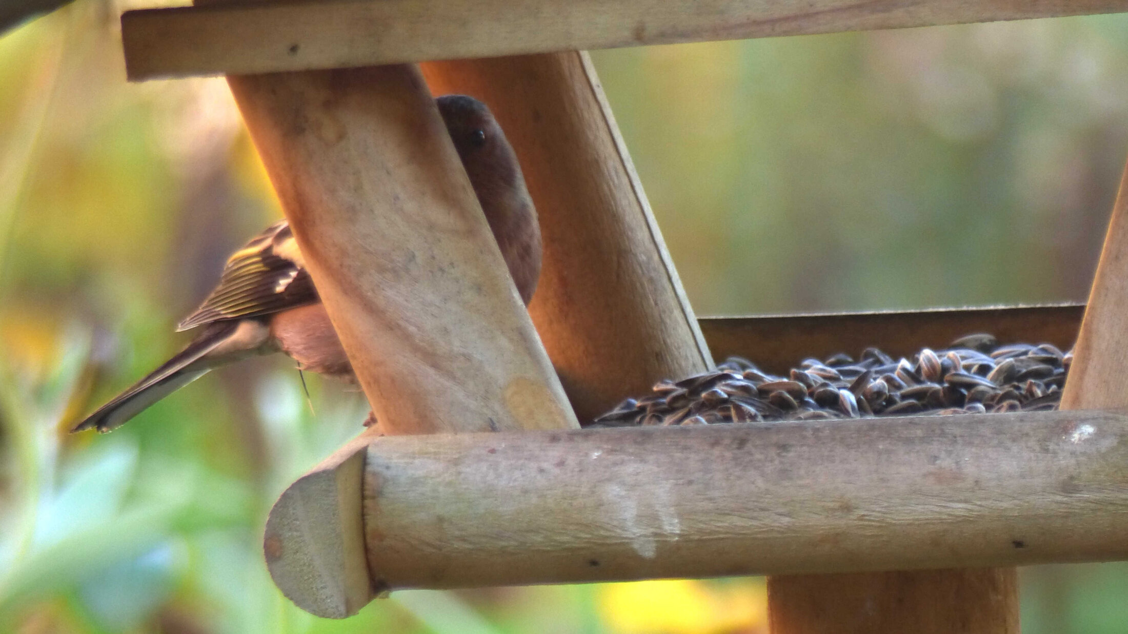 Dans ma cour, migrants tout juste arrivés et autochtones partagent les même mangeoires. (photos prises derrière une vitre de mon salon)