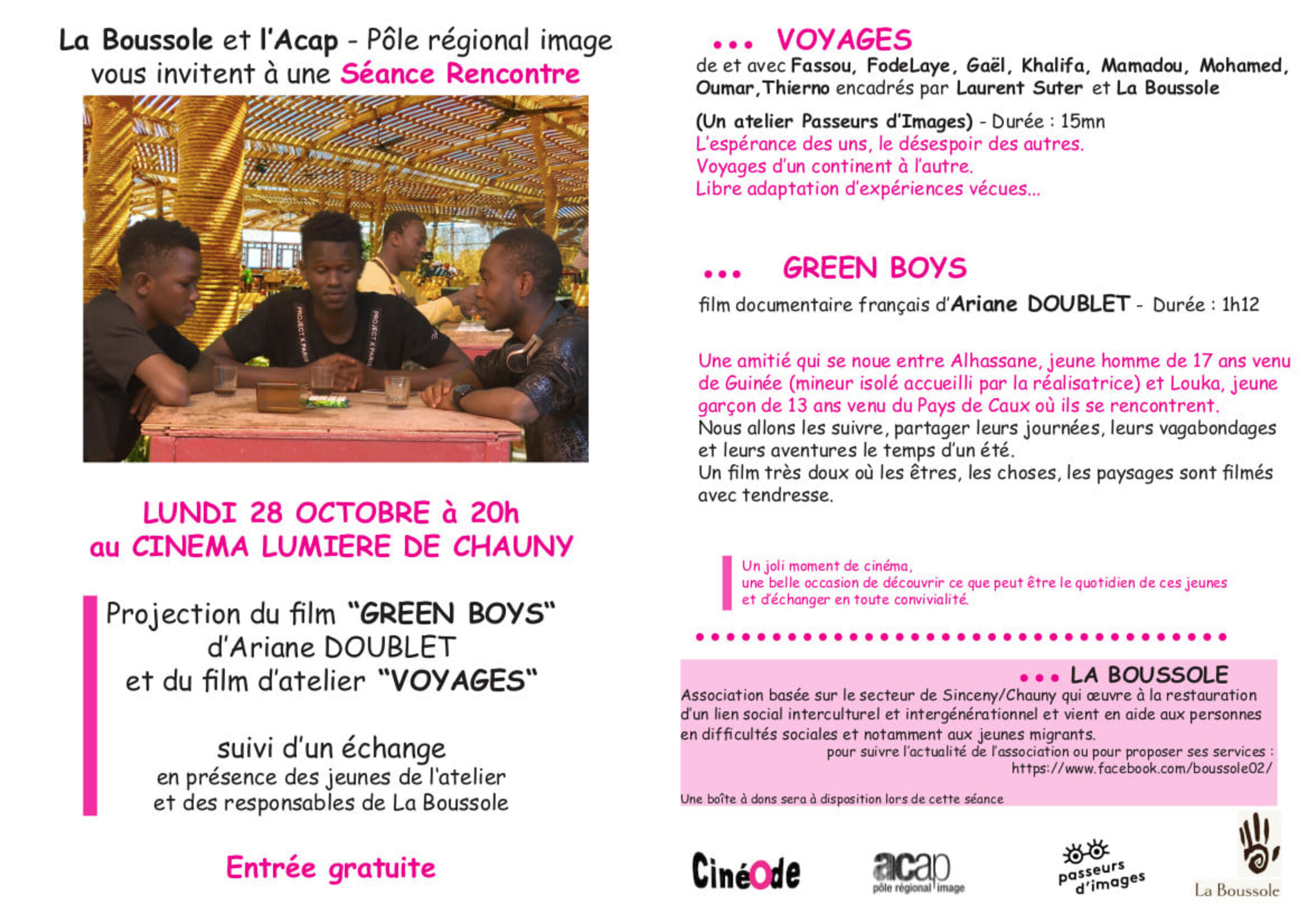 Projections du film "green Boy" d'Ariane Doubet et du film d'atelier "Voyage" en présence des jeunes de l'atelier et des responsables de l'association La Boussole (02)