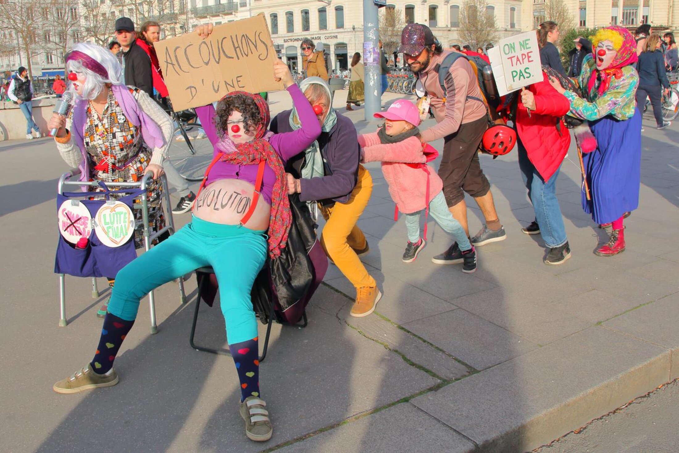 Les passants sont invités à pousser pour qu'une femme puisse enfanter d'une Révolution.