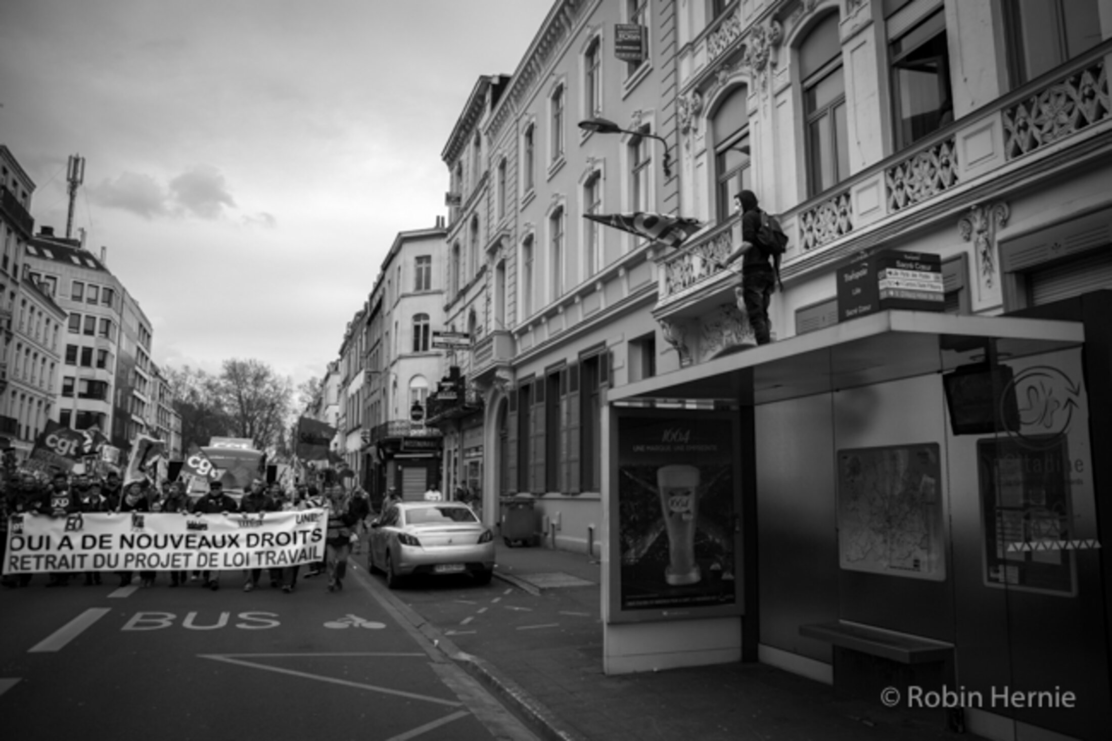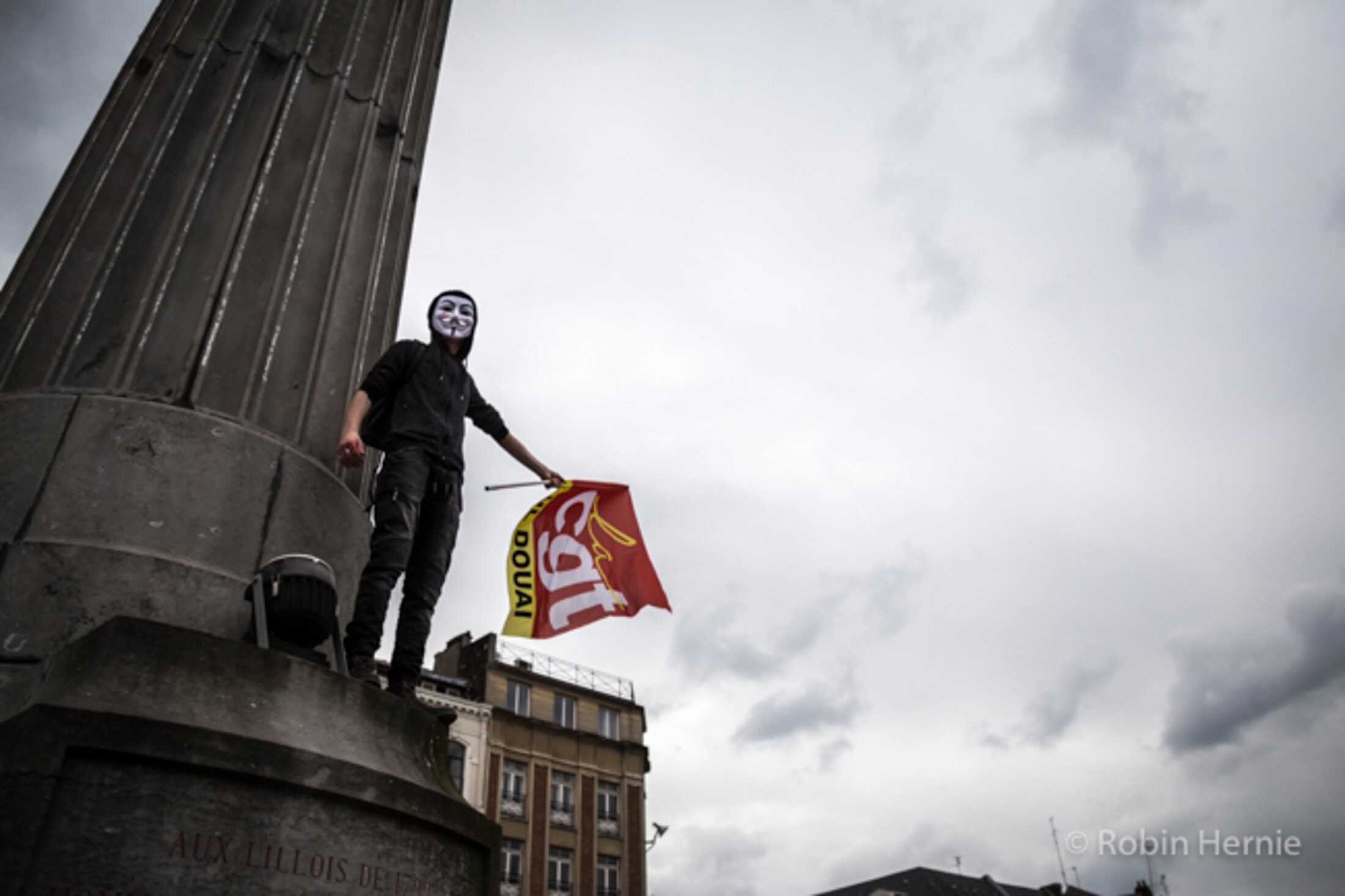 Un militant CGT, perché sur la colonne de la Déesse, Grand-Place.