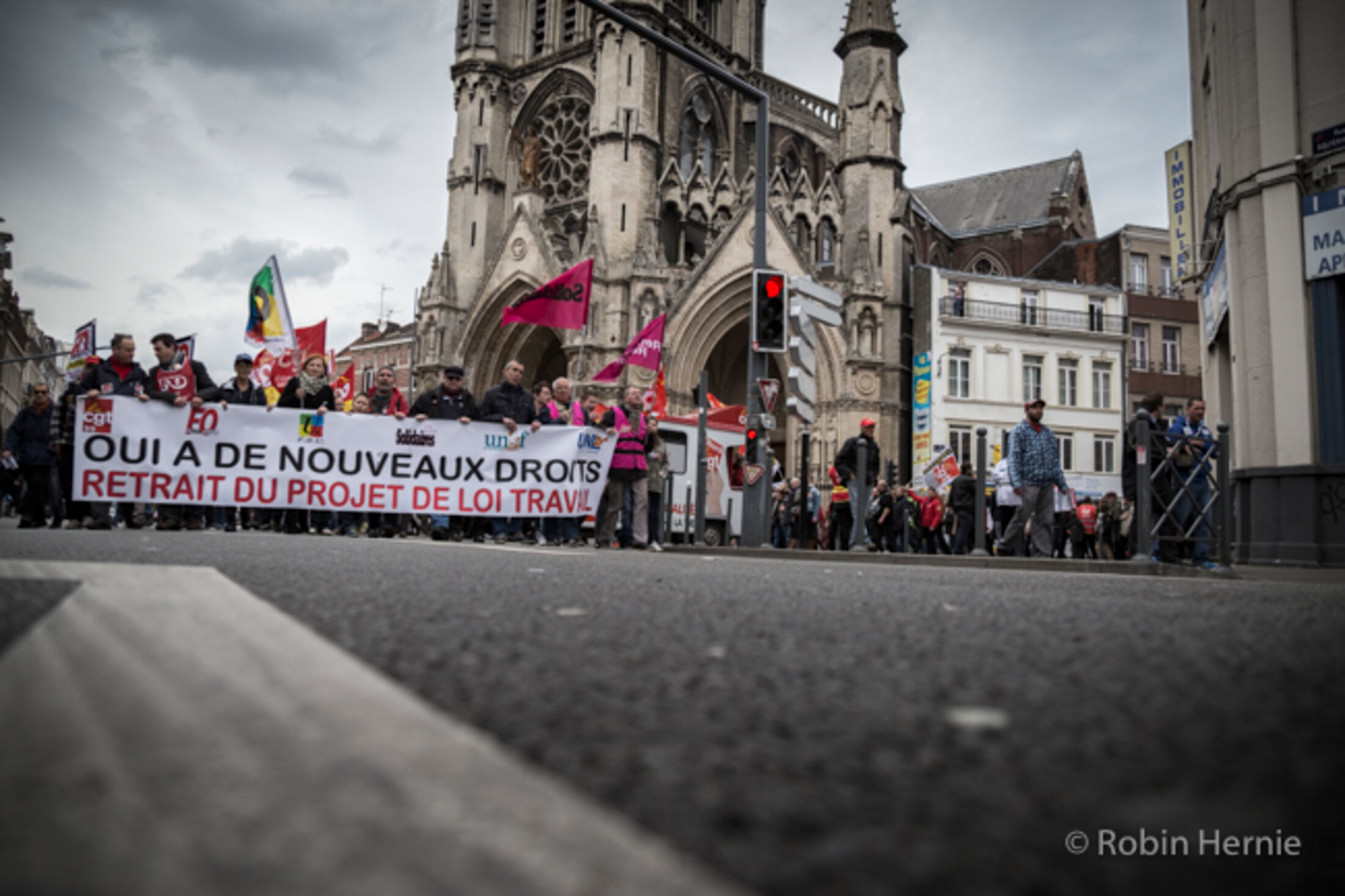 Devant Notre-Dame de Pentecôte, le cortège empreinte la rue Solférino, en direction de la première #NuitDebout lilloise.