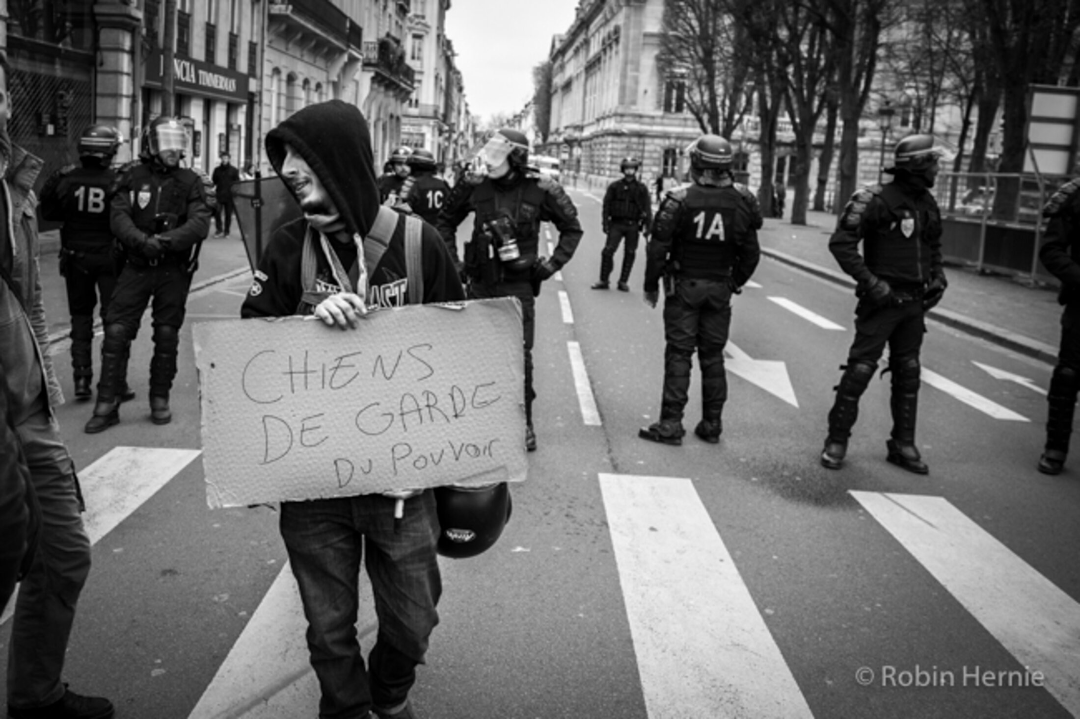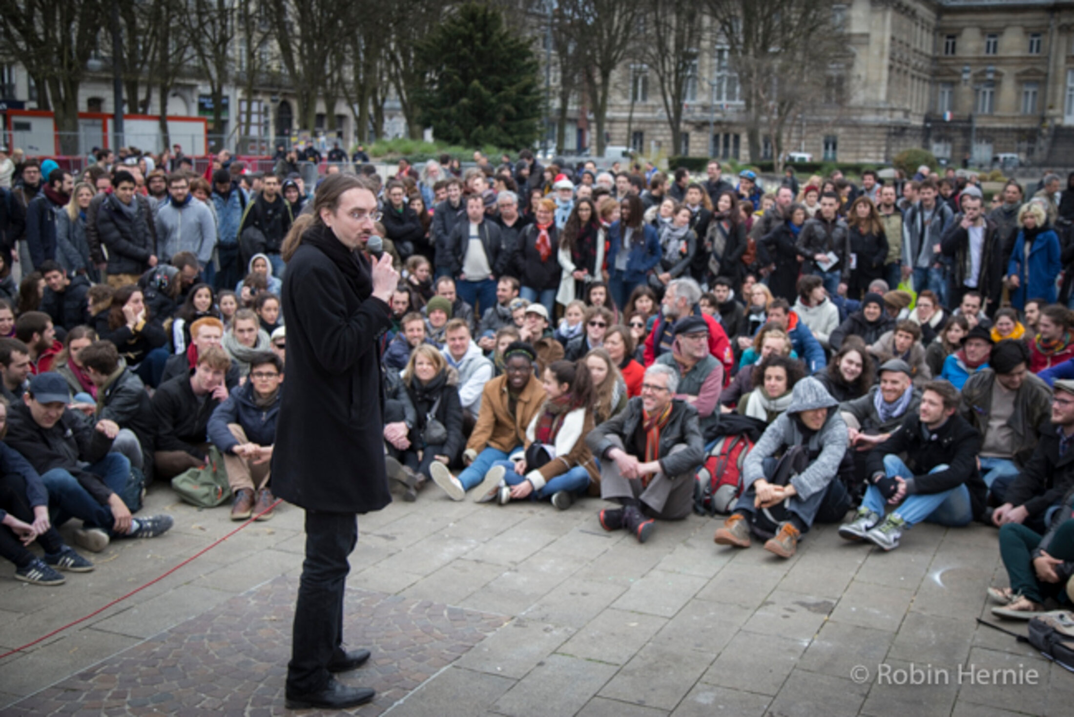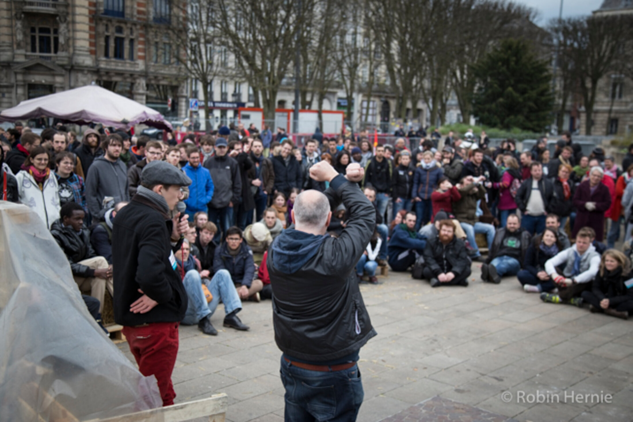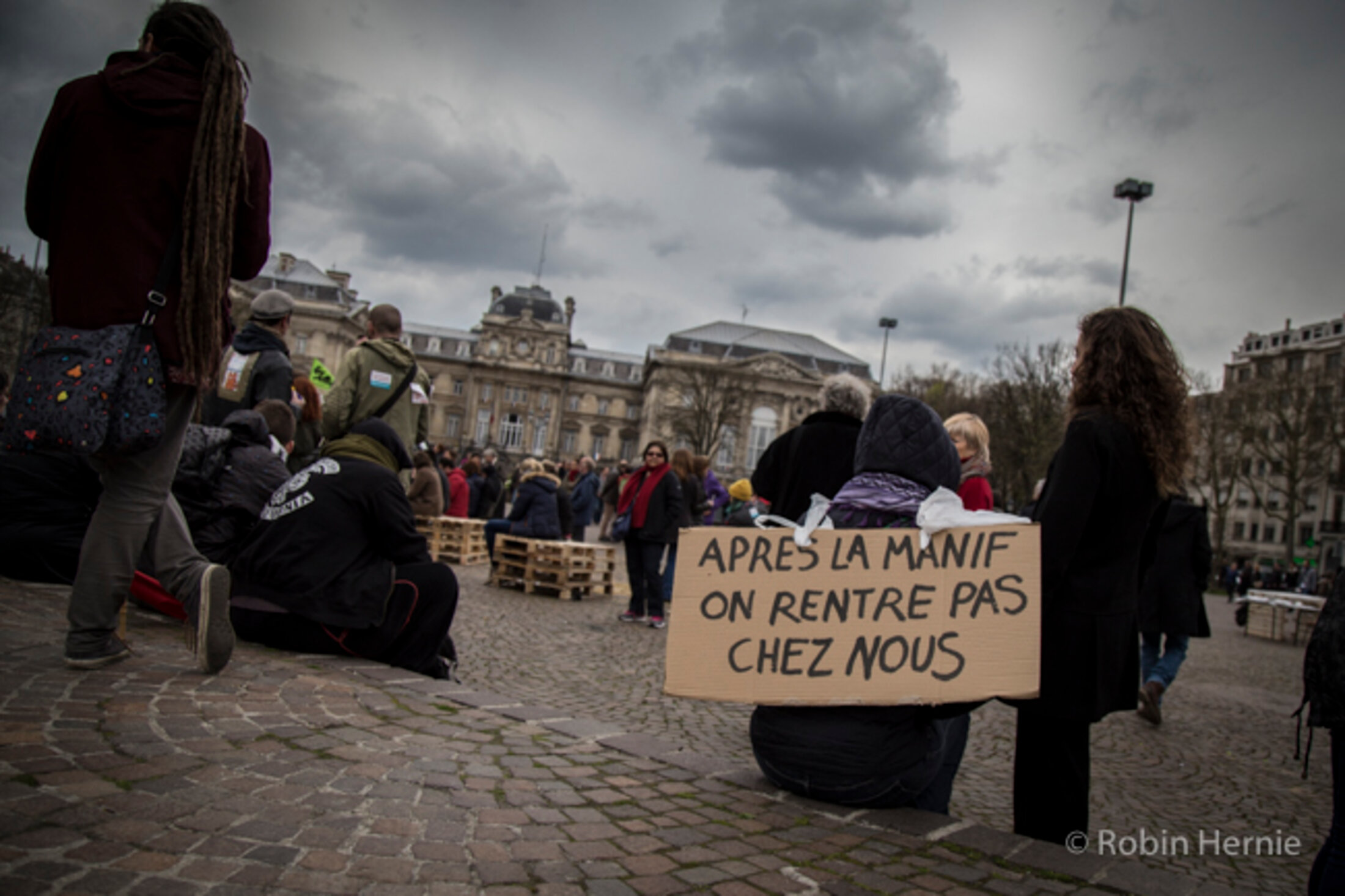 Les manifestants sont accueillis place de la République par une rangée de CRS qui se fera finalement très discrète. Si, au départ, ceux-ci empêchaient les gens d'emprunter la rue en parallèle, ils laisseront finalement les passants, après quelques dizaines de minutes, circuler librement.