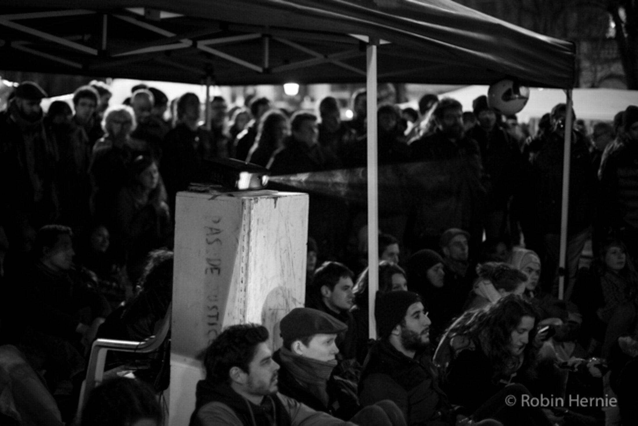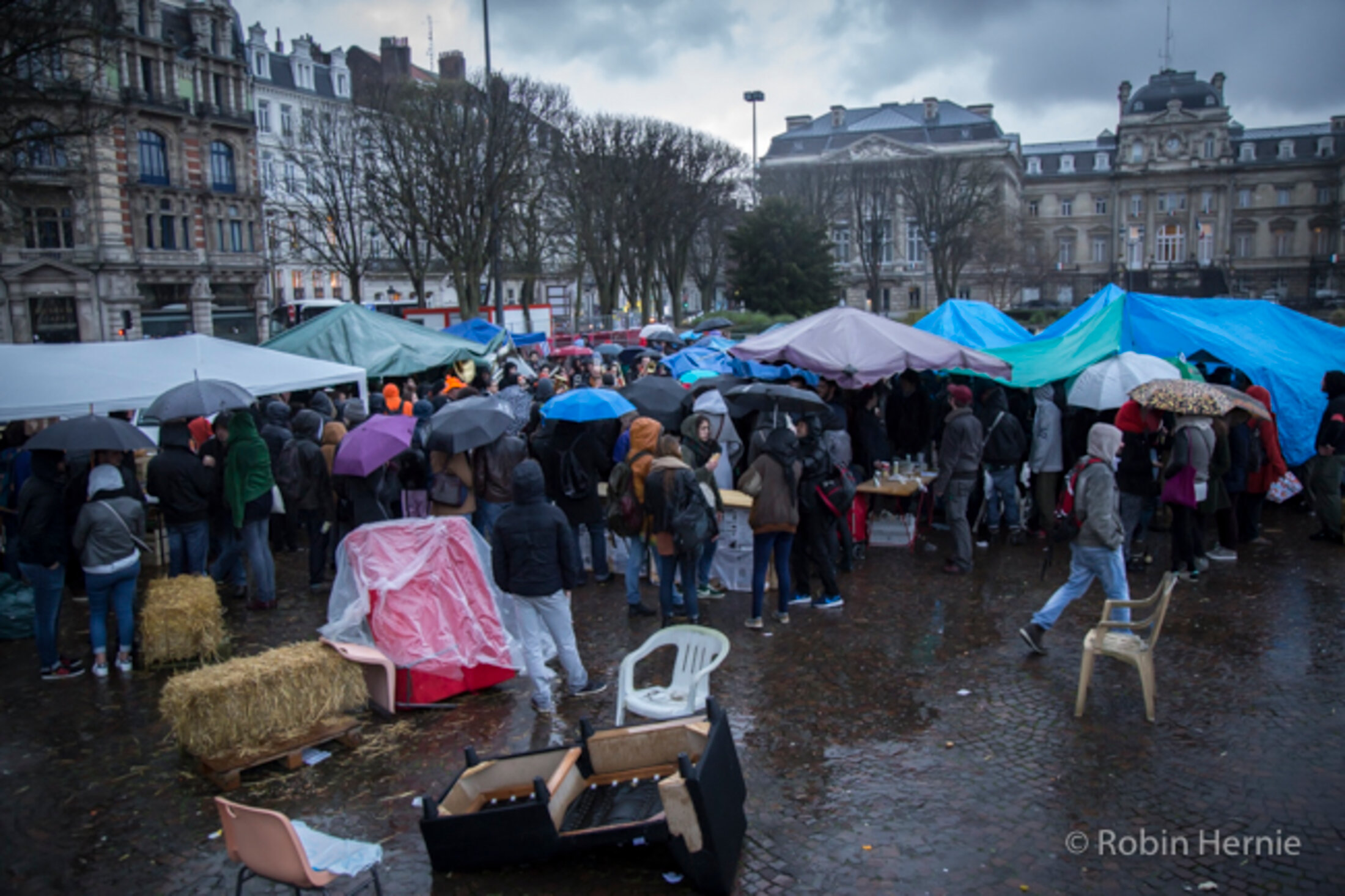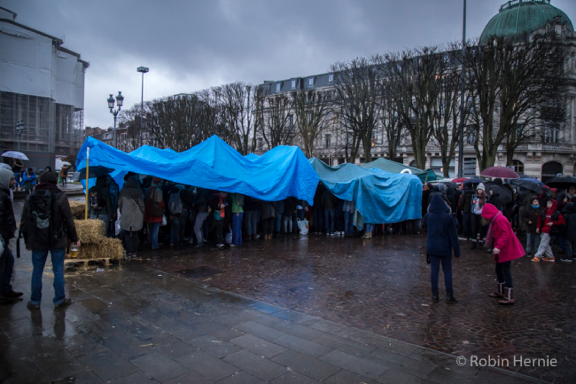 Rapidement, les gens s'organisent ; des bâches sont mises à disposition afin de s'abriter.
