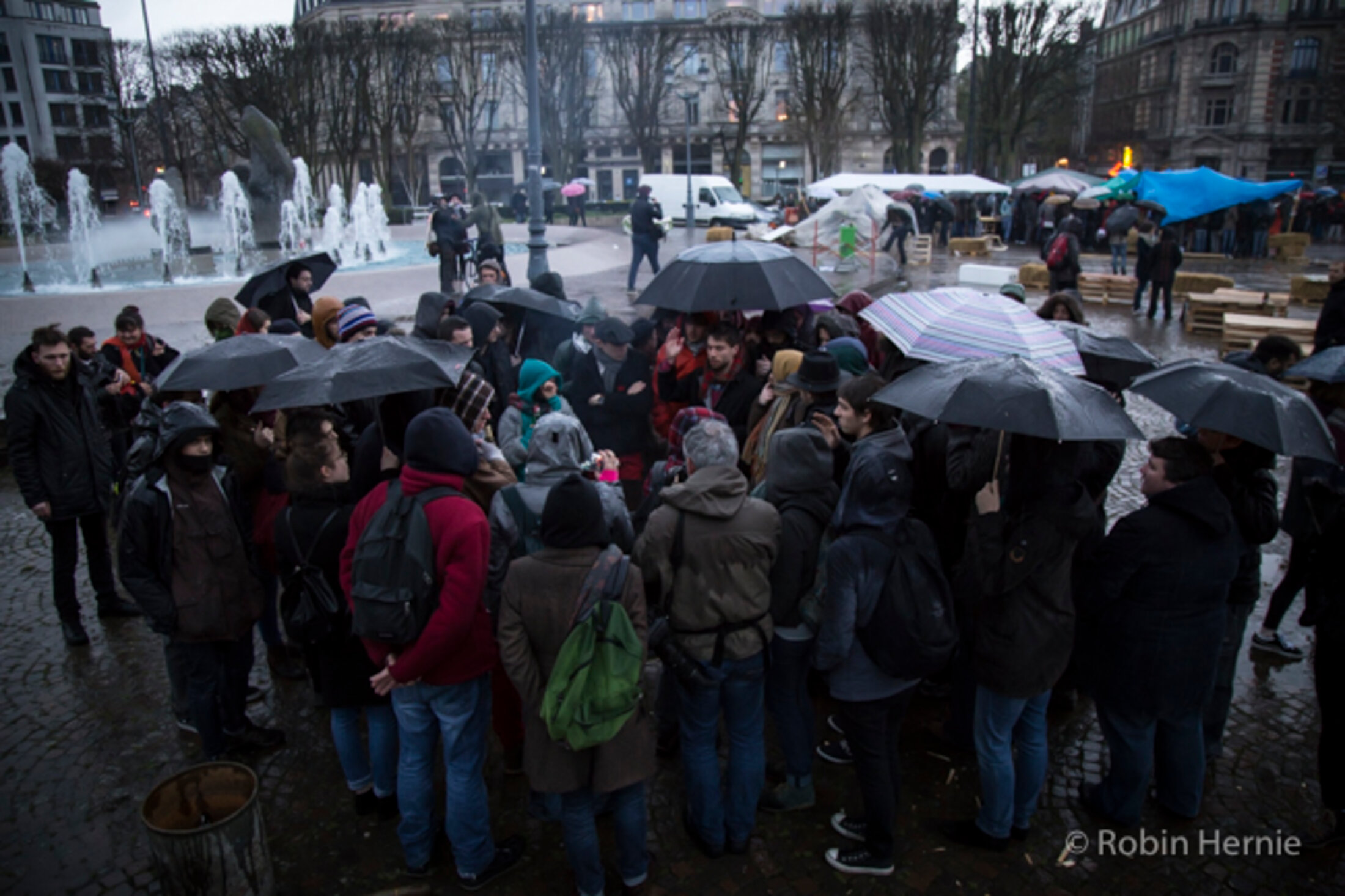 La nuit tombe, la pluie est éparse, mais il y a toujours autant de monde sur la place de la République.