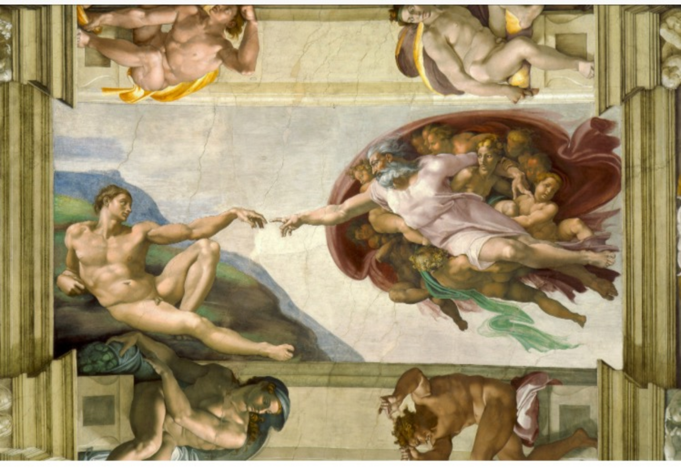 Michel-Ange, la création d'Adam, 1505-1512, fresque 280-570, au plafond de la Chapelle Sixtine, Vatican.