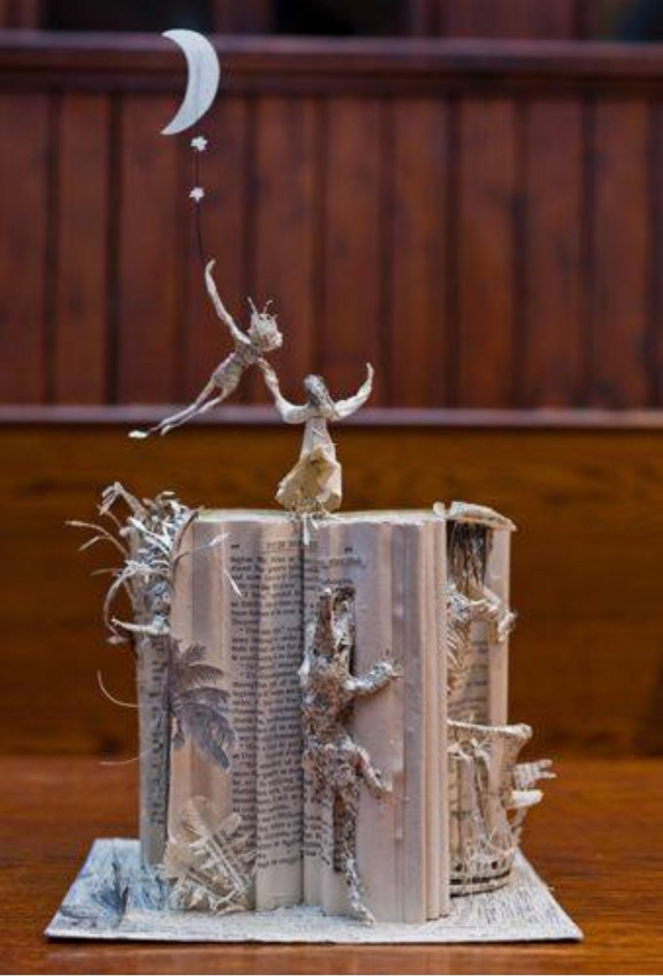 "Sculpture de papier Peter Pan, l'artiste mystère resté, œuvre retrouvée sur le lieu de naissance de J.M. Barrie à Kirriemuir en Écosse"; remontée de The Gardian via pour Book Gallery, en partage de Rose Brandt, vive féeuse aux livres, dépoussiéreuse de bibliothèques, alpagueuse d'arcanes; insufflant confiteor aux vergeures d'un édifice d'ivresses et d'éveil infini. E'M.C.