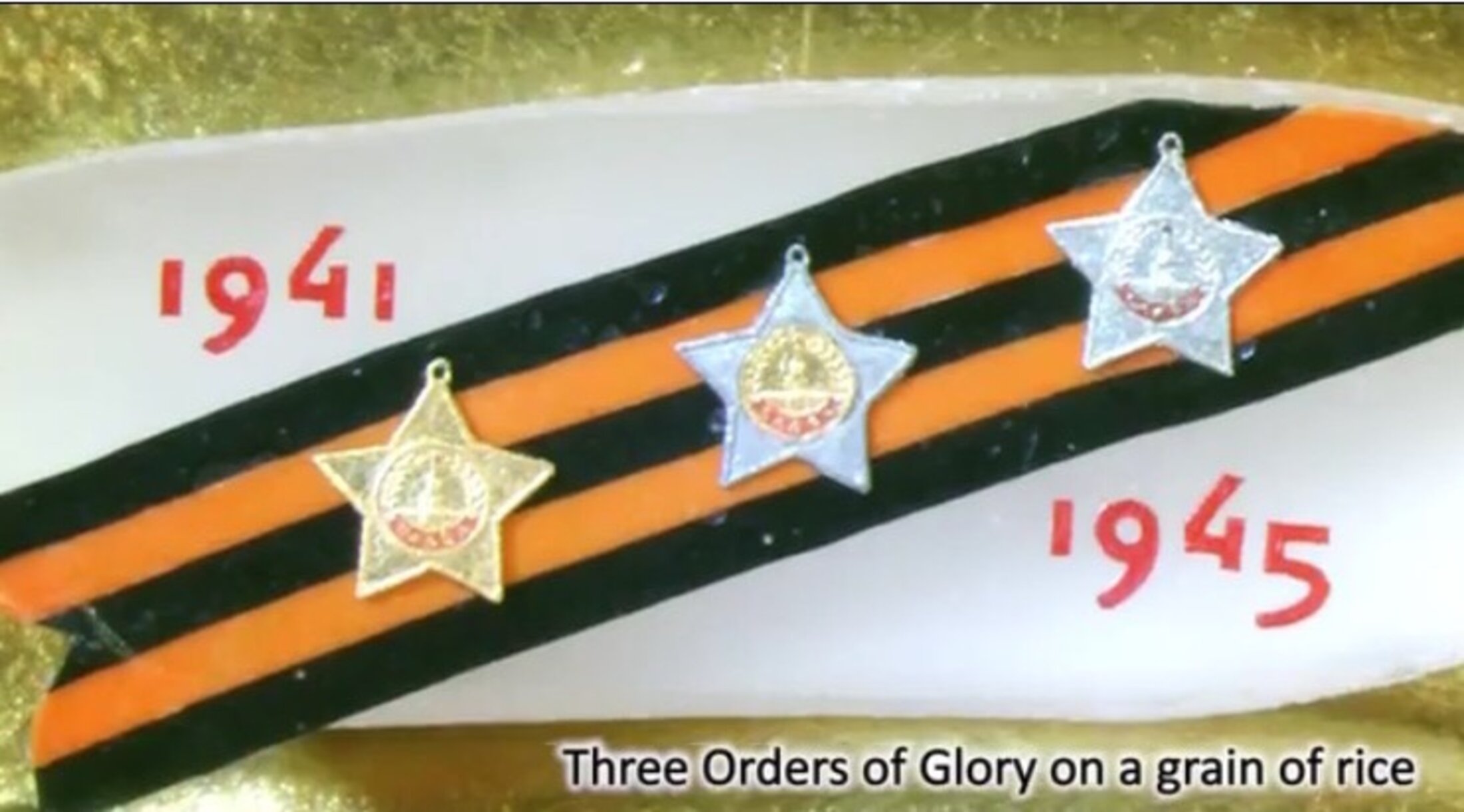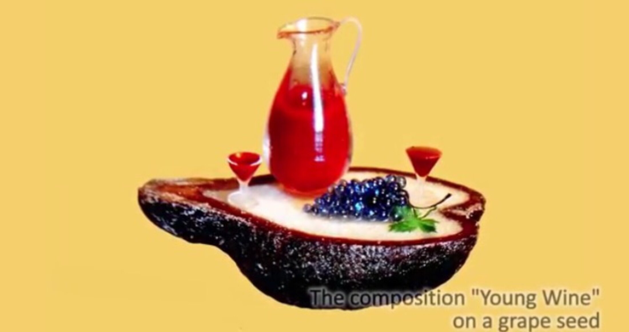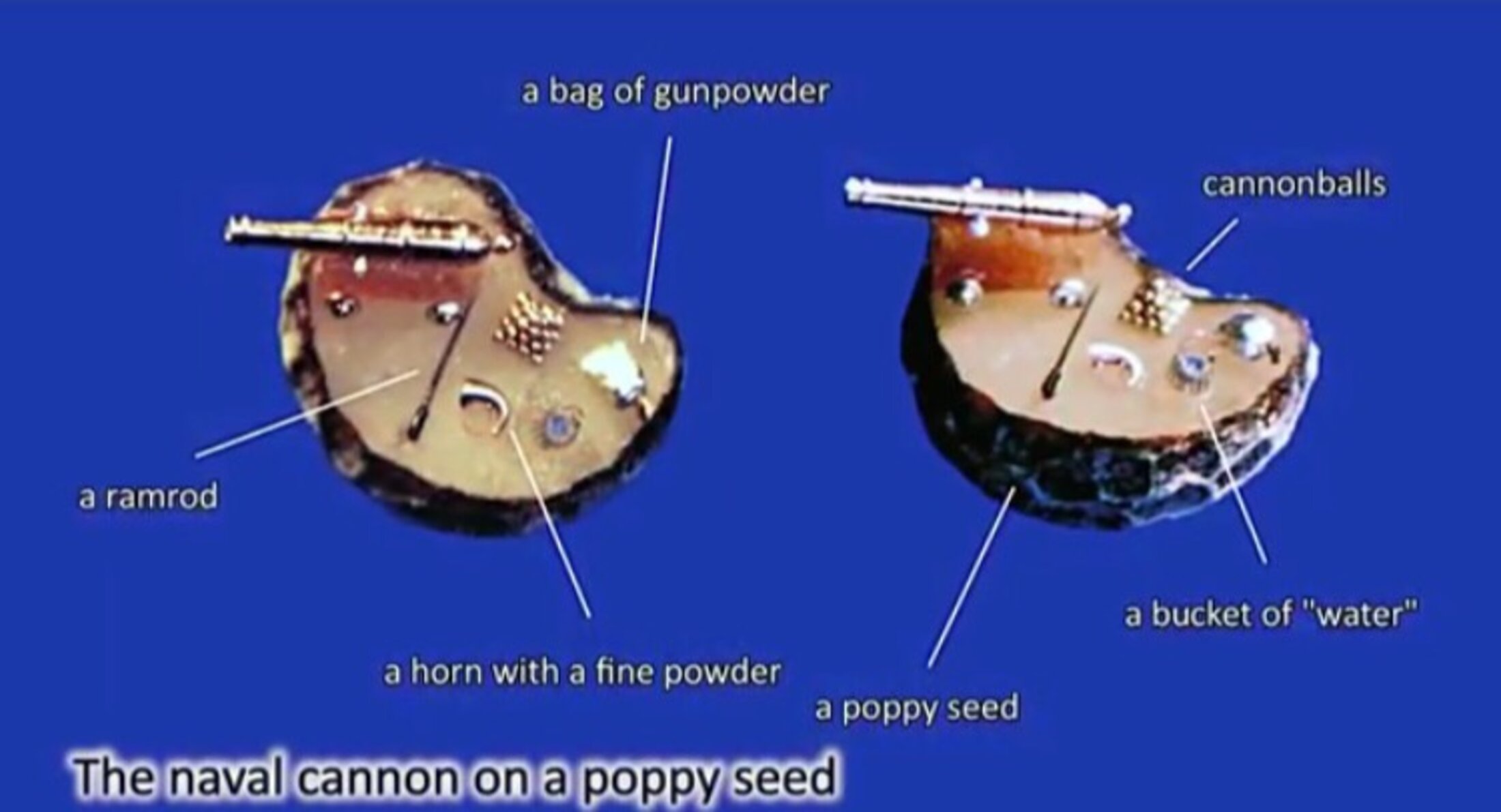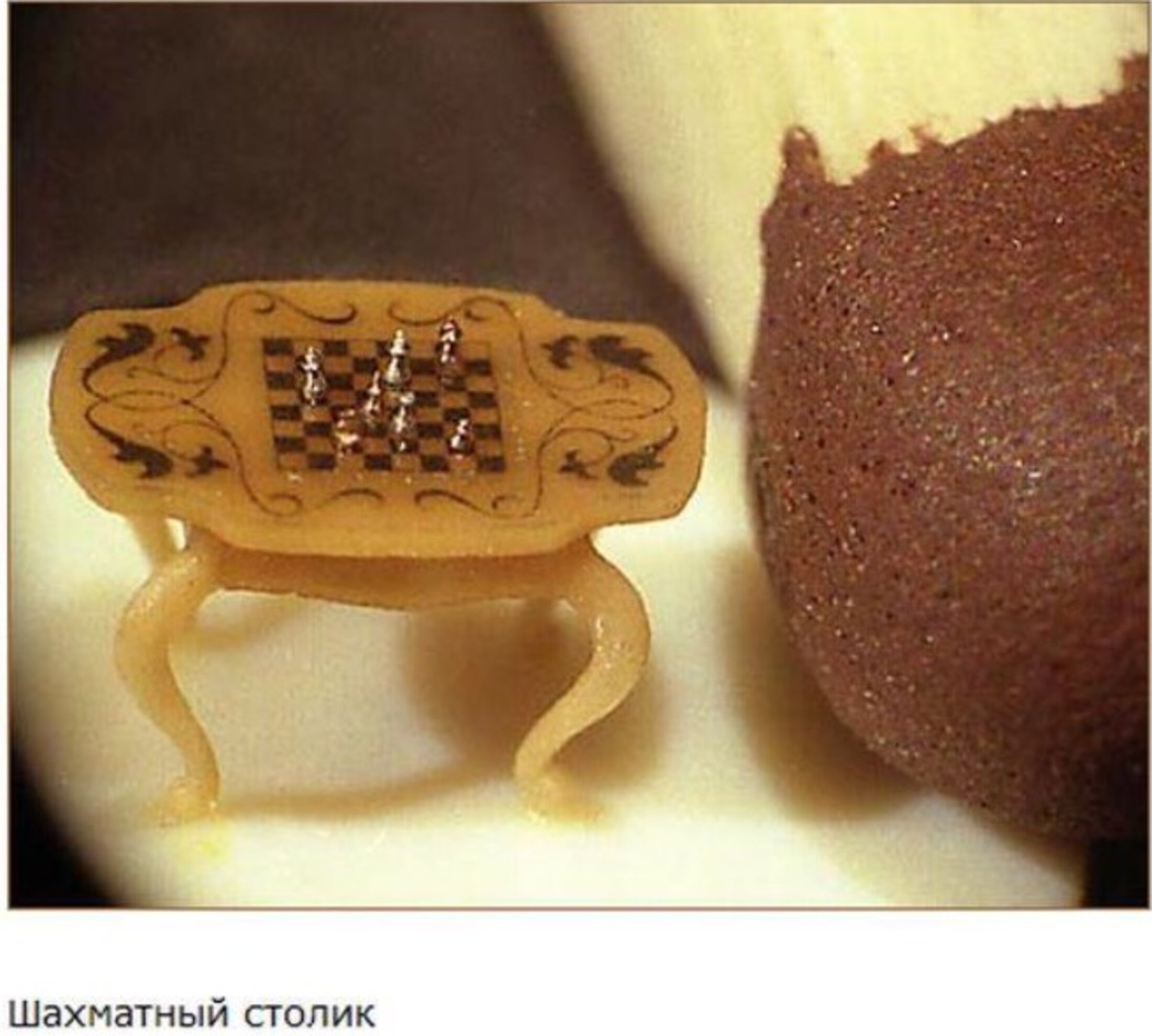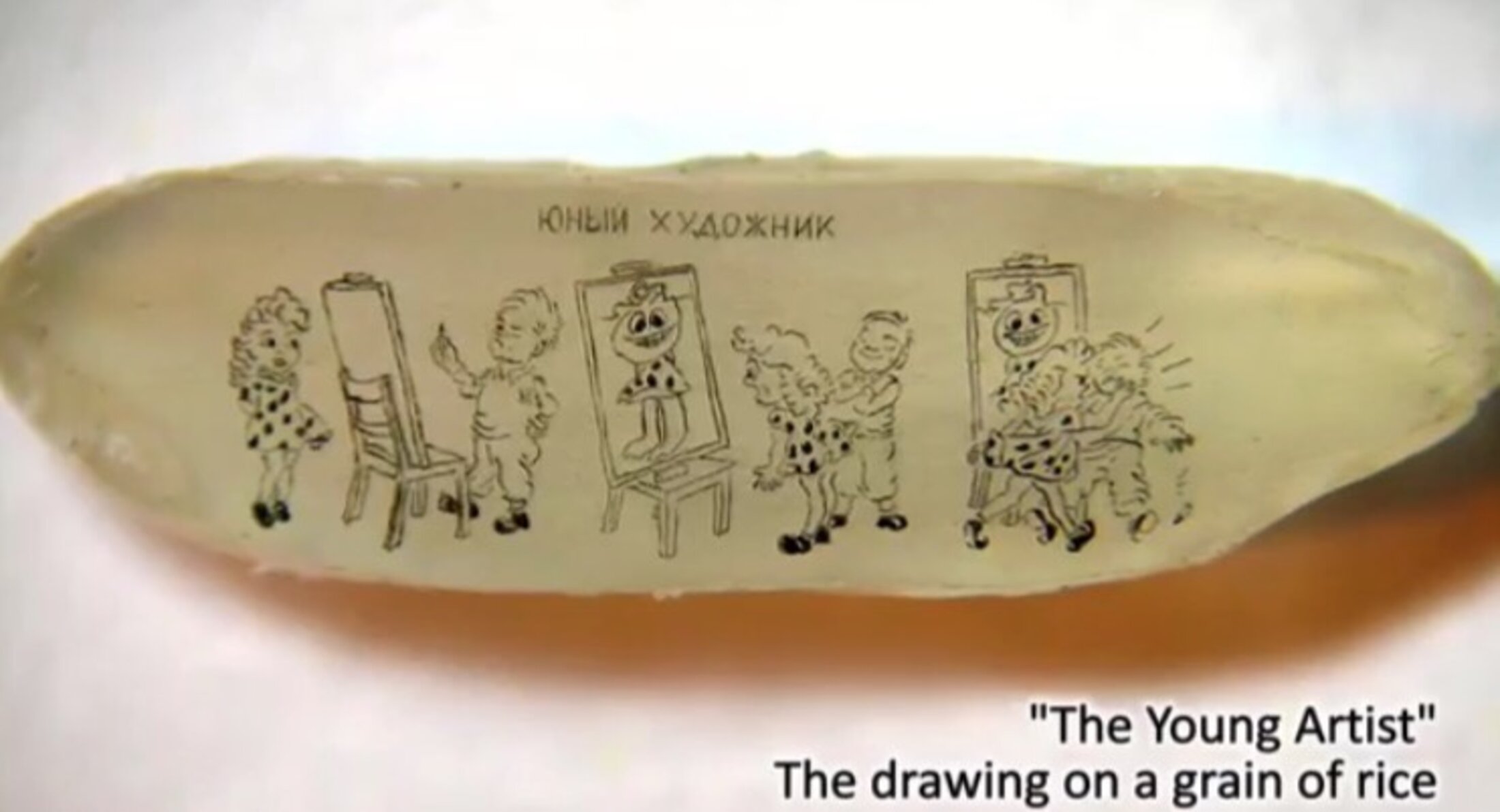 Vladimir Aniskin, jeune artiste sibérien, est l'un des seuls au monde à créer des œuvres d'art aussi petites, exquises minusculeries (de l'ordre d'un micron) qui tiennent sur une graine de pavot, un grain de riz, ou un pépin de raisin.