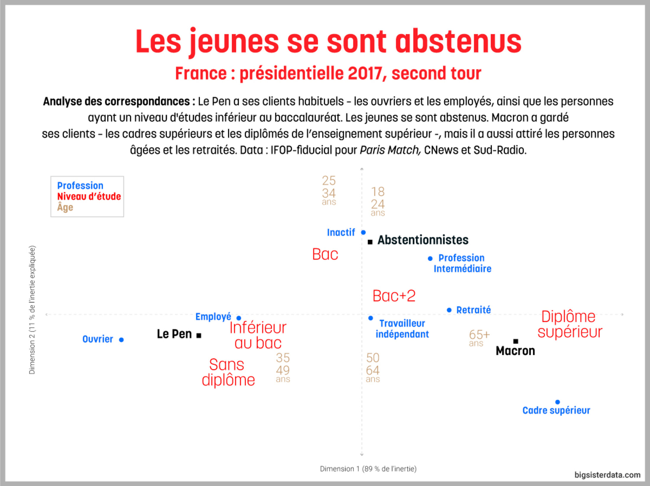 Profil des électeurs qui se sont abstenus au second tour de l'élection présidentielle. Analyse des correspondances avec les données du sondage d'IFOP-fiducial pour Paris Match, CNews et Sud-Radio du 7 mai 2017.