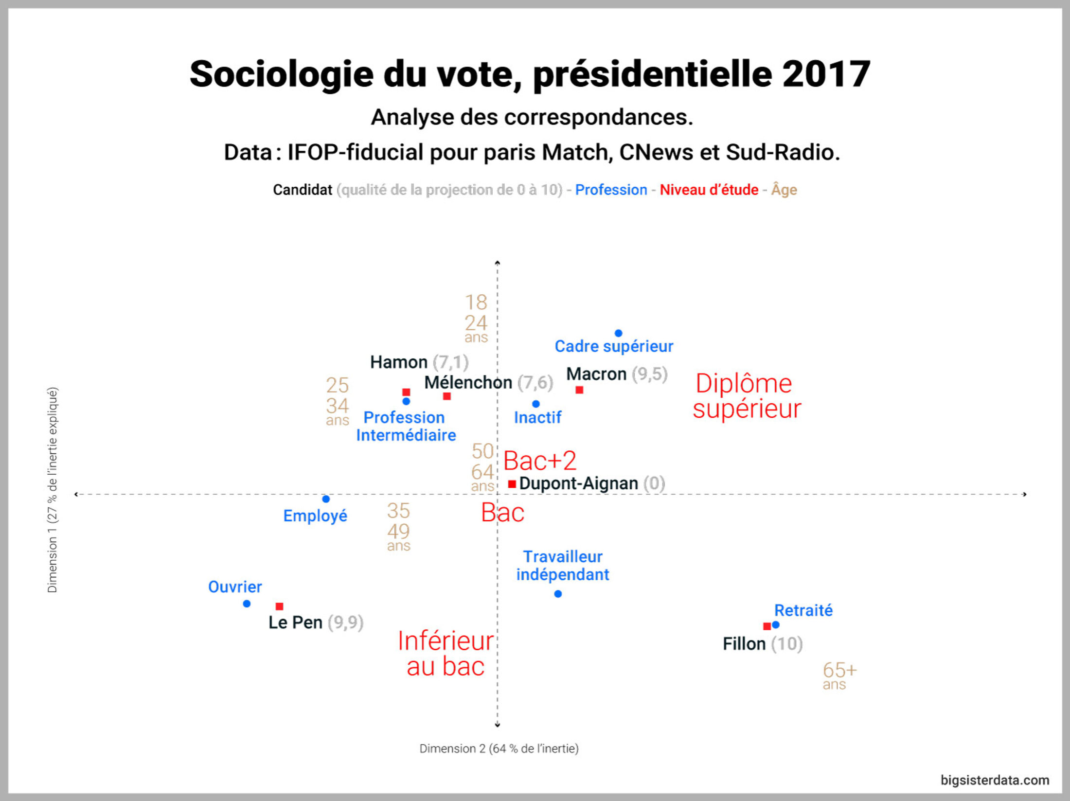 Sur la carte, on voit bien les associations suivantes : les jeunes votent Hamon et Mélenchon (tout deux très proches). Les personnes âgées et les retraités votent Fillon. Les ouvriers, les employés et les personnes sans diplôme votent Le Pen. Opposé à le Pen, Macron a les votes des CSP+ et des diplômés.