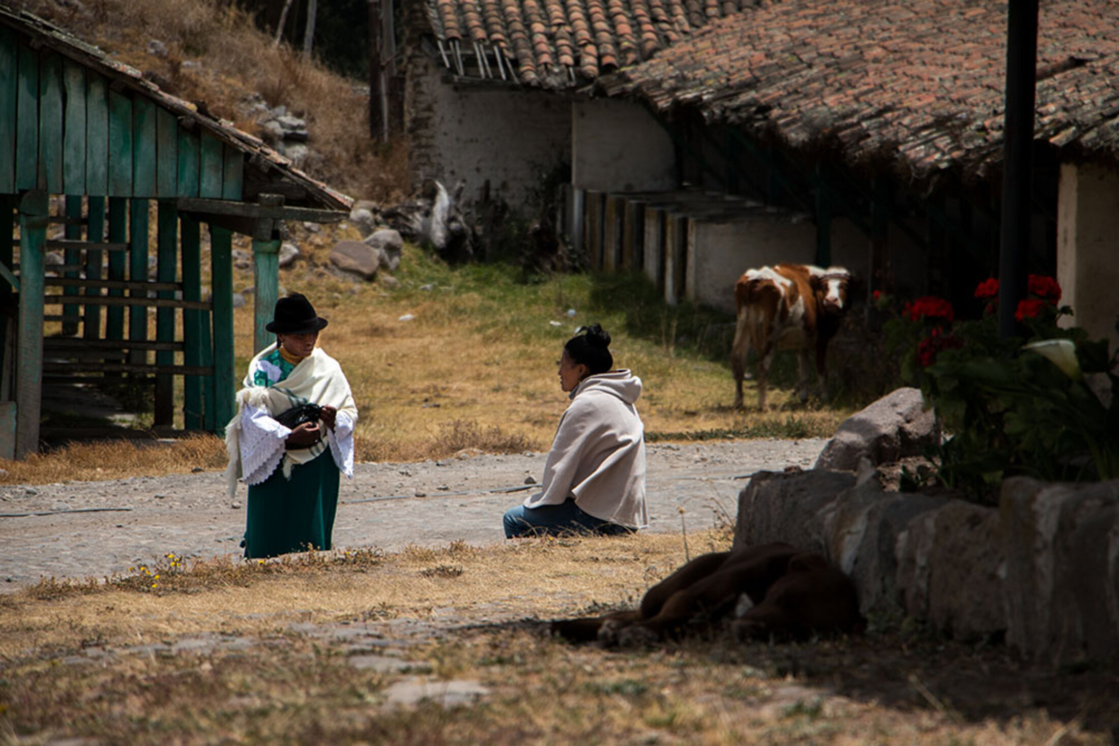 Devant le centre culturel, Maura Necpas s’entretient avec une femme de la communauté portant les habits traditionnels. Responsable du centre, Maura a à coeur de transmettre l’histoire de sa communauté et de Transito Amaguaña.