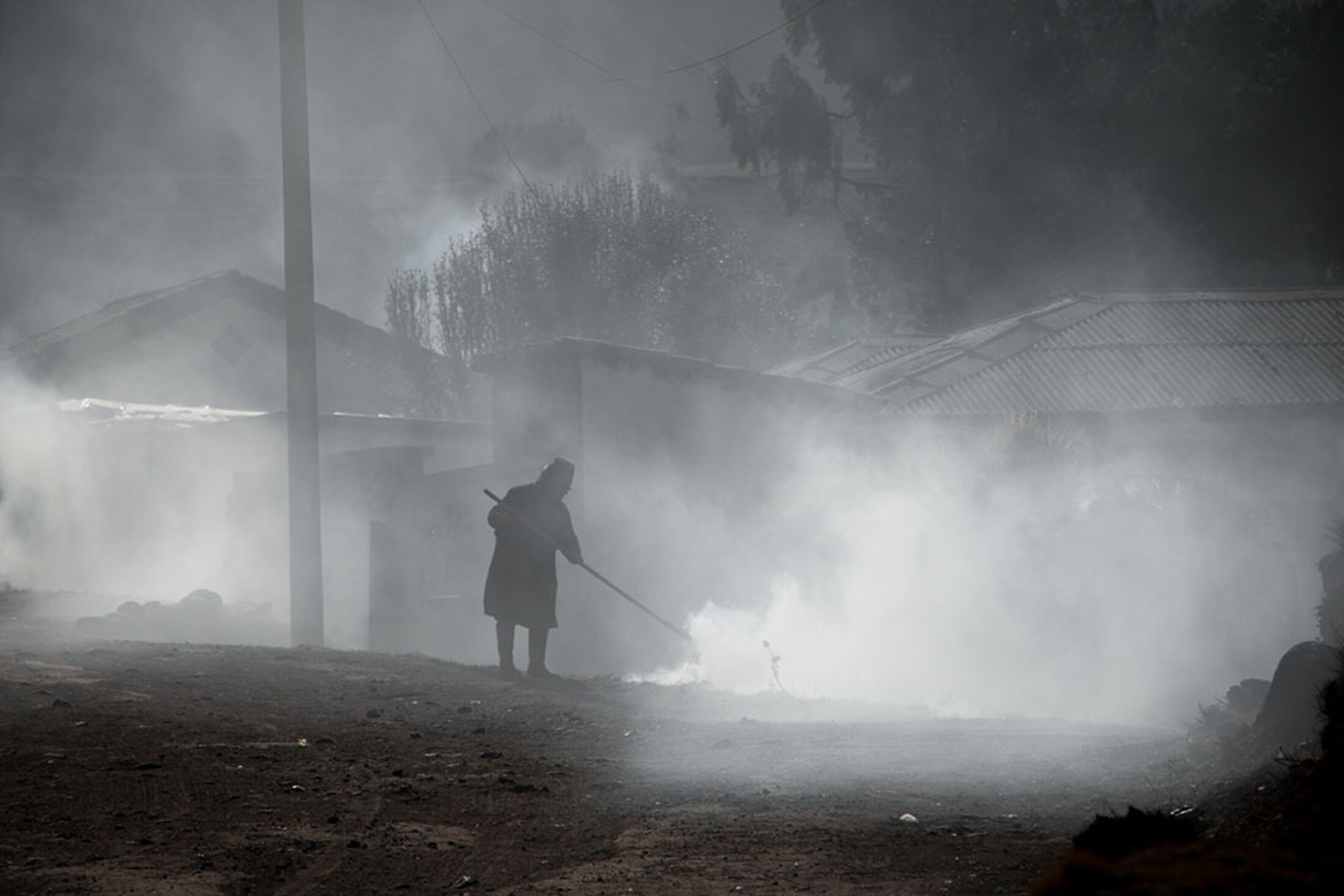 Dona Germina est la dernière proche (« companera ») de Transito Amaguaña encore en vie à la Chimba. Lorsque Maura nous a conduit à sa rencontre, elle revenait des champs vêtue de ses habits de travail. Elle voulait être photographiée dans la tenue traditionnelle des femmes de la Chimba. Elle nous montre le bâton derrière elle, “pour chasser les gringos s’ils attaquent !”