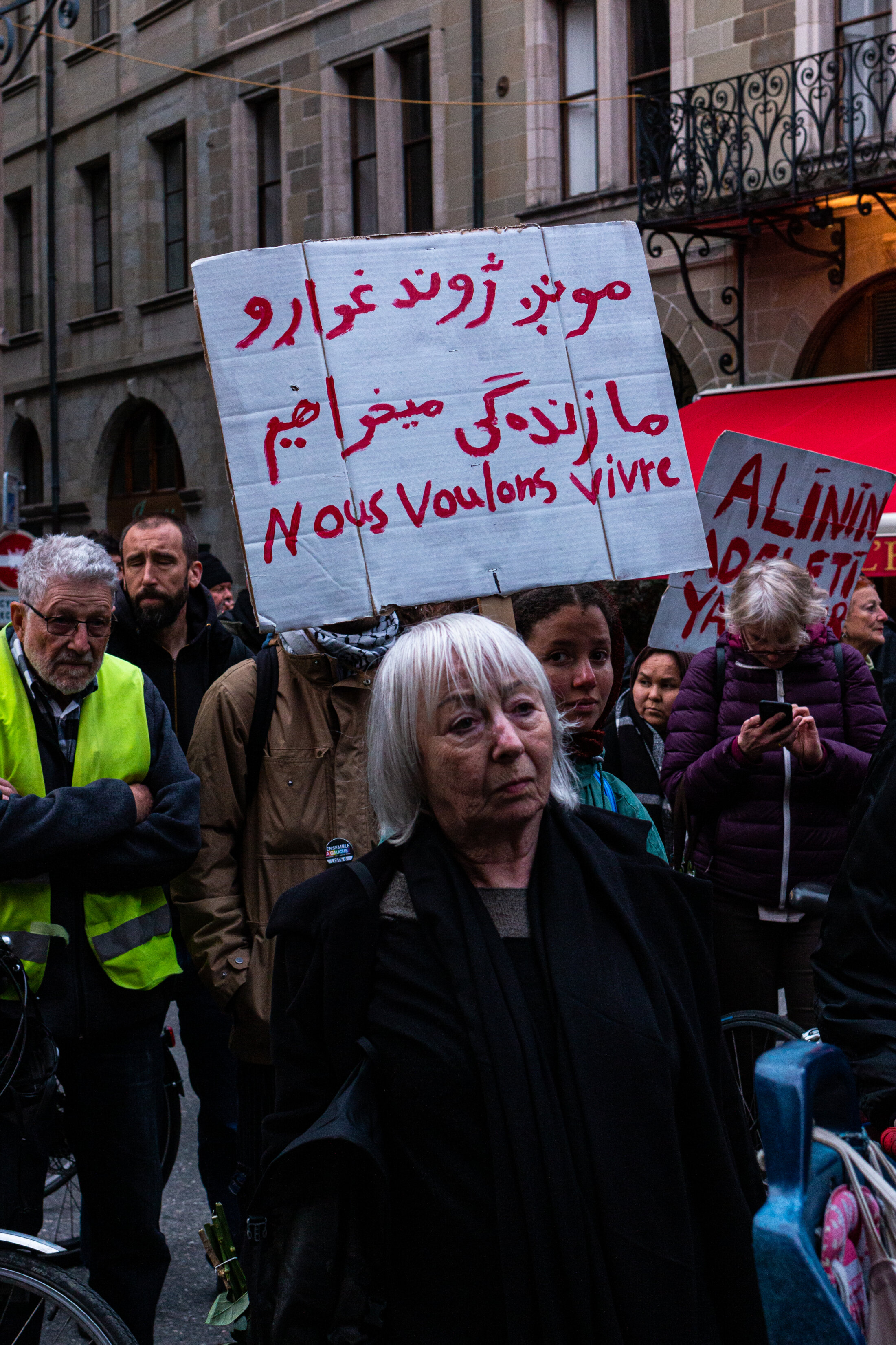 À mesure que la manifestation s'engouffre dans les hauteurs de la vieille ville, les ruelles se font plus étroites. Les vitrines des magasins reflètent le défilé, gonflant subrepticement le nombre de participant·es. Sur les terrasses, la clientèle des cafés et des restaurants observe, incrédule, le cortège qui s'étire.