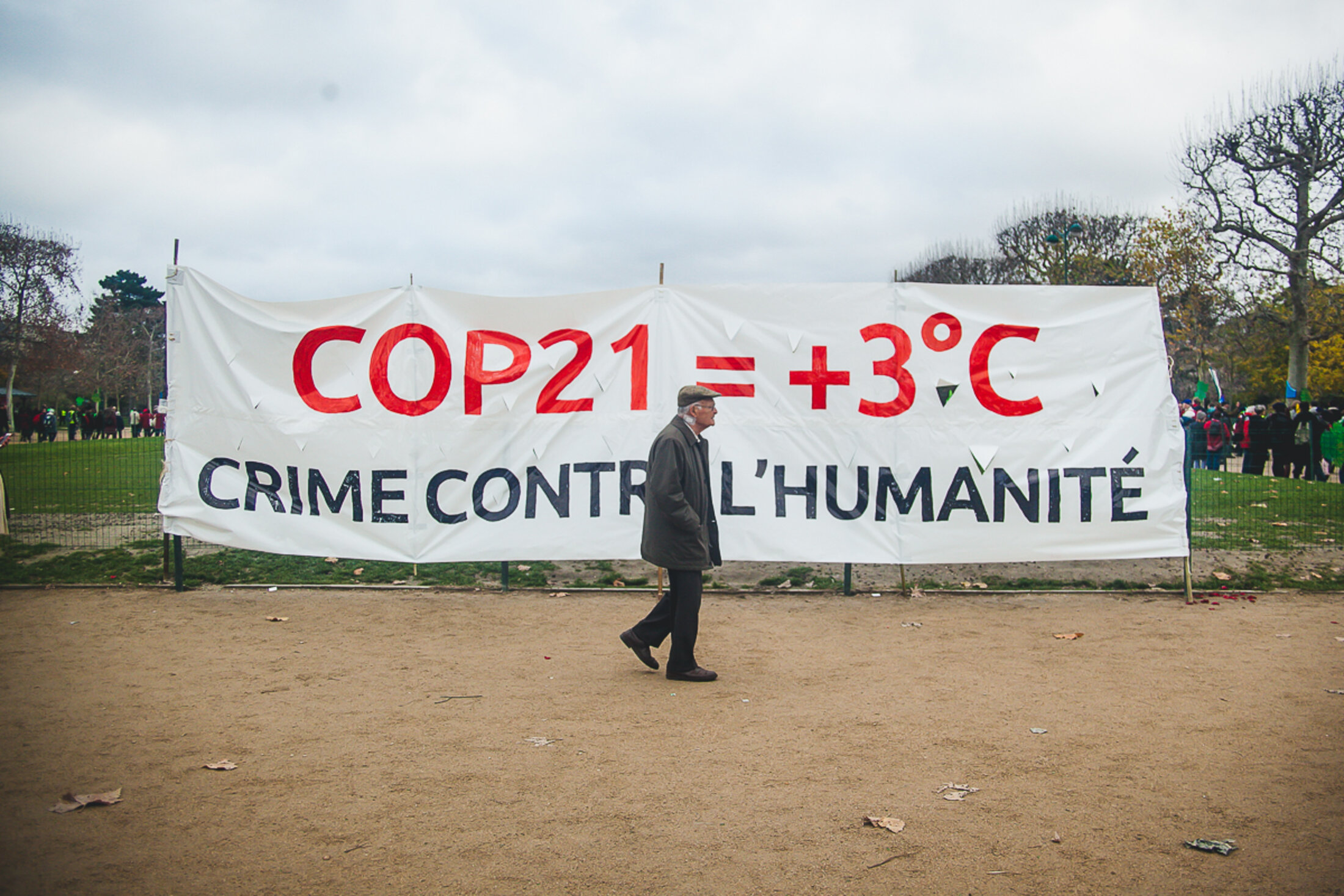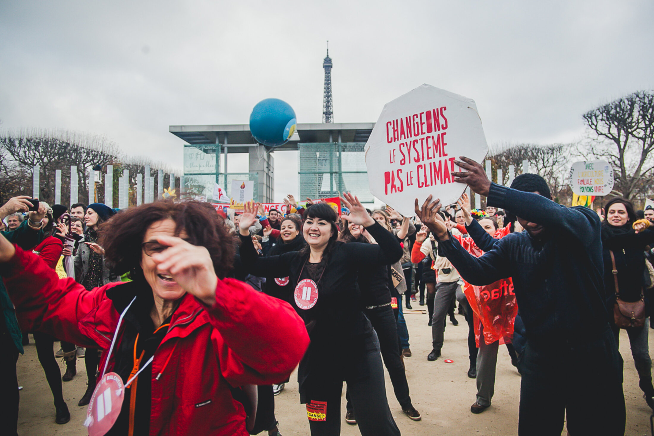 Plusieurs milliers de personnes se sont rassemblées sur le Champ-de-Mars à Paris, le 12 décembre 2015, pour marquer la fin des négociations sur le climat de la COP21 et défendre la protection de l'environnement. https://www.flickr.com/photos/foretfantome/albums/72157662150543432 reportage complet https://www.facebook.com/media/set/?set=a.966473833399420.1073741850.159191670794311&type=3