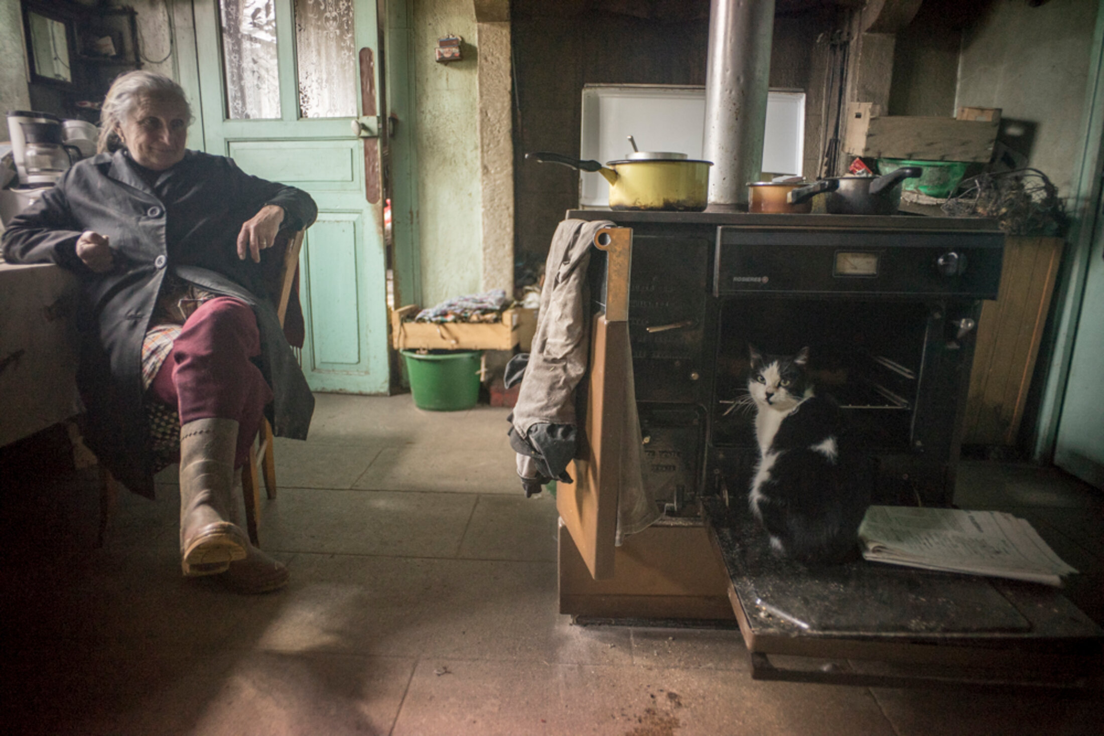 Nous avons une ferme familiale. Nous avions une chambre dans les deux maisons familiales. On a fait cela pour conserver les deux fermes. Et pour faire quoi ? : zéro. La ferme, c’est que du travail. Je travaille toujours, il faut bien aider avec les bêtes; on ne fait pas toujours ce qu'on veut. Un bébé peut se mettre après vous. Une vache qui veule peut vous tuer. Même un bélier, c’est pas grand chose mais attention : en agriculture, il faut aider jusqu'au bout. Il y a different types de tempéraments et il faut toujours faire attention. Nous nous sommes mariés en 1970. Depuis ce temps-là, gouvernement après gouvernemen c'est toujours la même chose. On vend les bêtes comme il y a quarante ans. Ça a changé mais pas en bon pour l'agriculture. Je suis à la retraite depuis 2009. Je ne pouvais plus continuer, l'administratif, il faut tout déclarer... numéro du père, de la mère, quand on arrive à un certain âge… On était même pas au Smic. Quand un bébé péri, vous avez tout perdu. Il y a les chiens qui font des ravages sur les brebis, le renard c'est la volaille. Chacun de nos deux enfants ont repris l'exploitation. L'un celle du père, l'autre celle de la mère. C’est pas fini, pour l'instant ils ont les terrains, ils se sont mis d'accord. C’est nécessaire pour moi de faire mon jardin, mes volailles et mes lapins. S'il fallait acheter tout cela, ce serait vite parti les 600 euros de retraite. J’ai les impôts, l’eau, l’électricité, le téléphone, les assurances, l’essence, l’entretien. Le bois, c’est mon fils. Je cuisine avec ma cuisinière sur la deuxième plaque. Comme cela ça ne hurle pas.