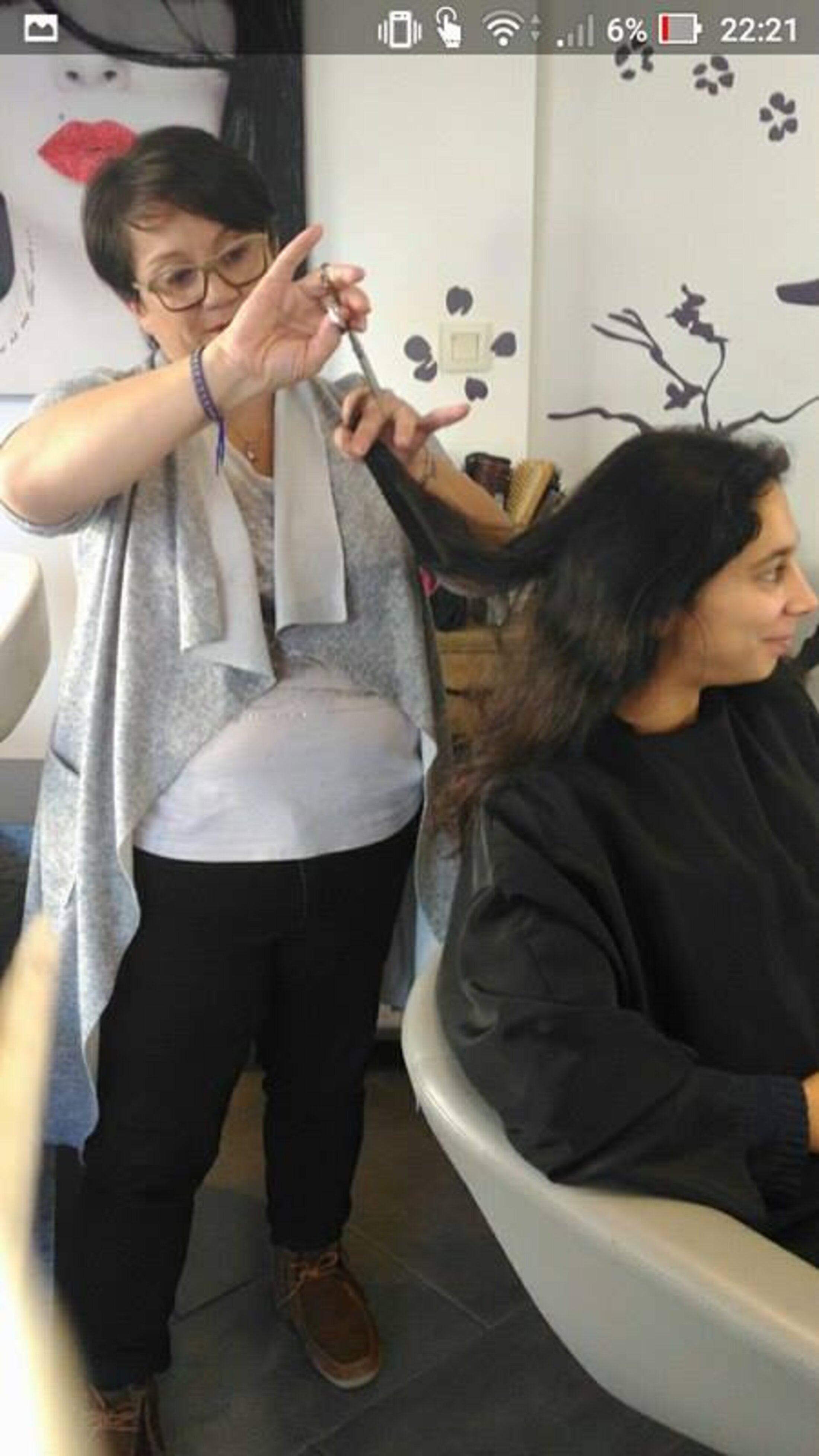 Après avoir démélés cheveux de sa cliente, Mme Miss les coupe, les sèche au séchoir automatique puis au séchoir manuel. Cela a beau être un salon de coiffure biologique, pourtant il n’y a très peu d’outil biologique comparer à tous les produits quelle conserve.