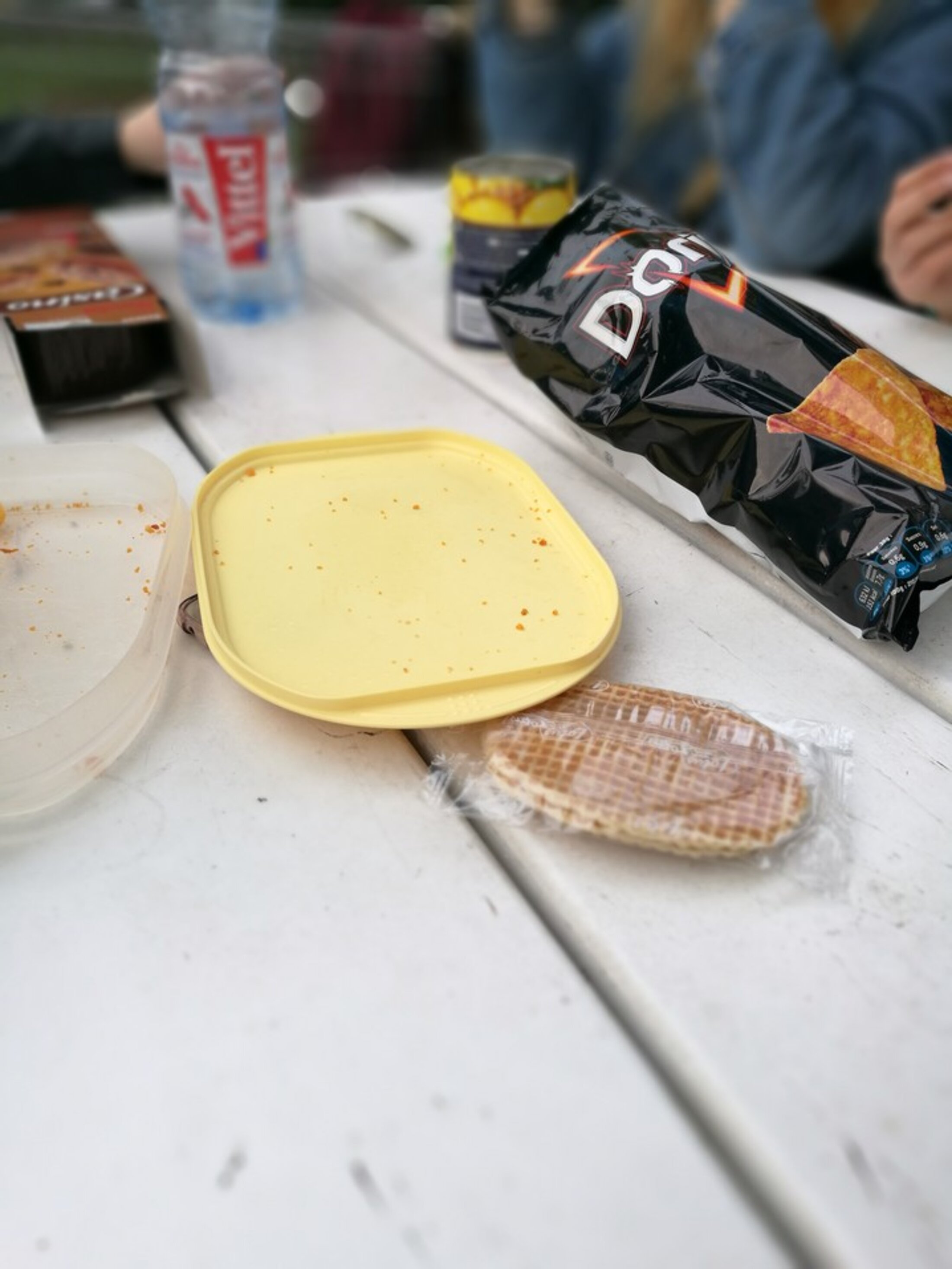 Cette photographie a été prise pendant une sortie entre amis à Montpellier. Le but de ce repas n'est pas d’être équilibré mais goûteux. Il faudrait 1h53 de hockey sur glace pour éliminer les calories apportées par le paquet de chips.