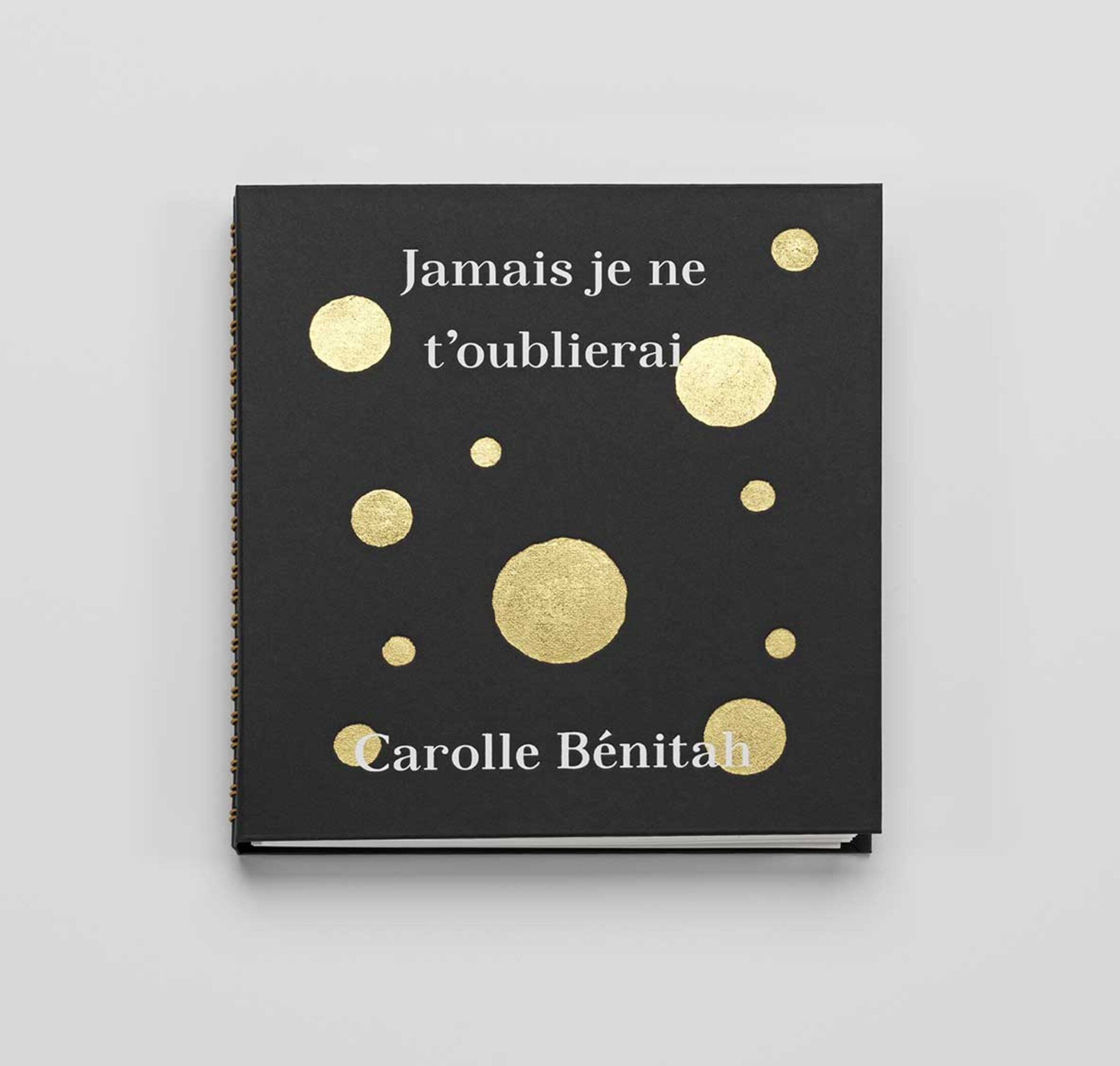 "Jamais je ne t’oublierai est un travail sur la mémoire familiale, heureuse et fantasmée, confrontée à des souvenirs négatifs. C’est un album en creux de mon précédent travail Photos Souvenirs dans lequel je brode sur les photographies de famille où je suis représentée. J’ai réalisé qu’il existait très peu d’images de mes parents avant leur mariage, un désert iconographique expliqué par le fait que mes parents sont nés au Maroc dans les années 1930, une époque dépourvue de confort moderne. Ma grand-mère a gardé les quelques photographies existantes sous clé, afin de ne pas évoquer la tragédie de la perte accidentelle d'un de ses fils. Un angle mort pour cette vie de douleur. Mais le manque de photos m'a fait me sentir orpheline et sans racines. Alors, finalement, j'ai commencé à acheter des photographies anonymes sur les marchés aux puces et je les collectionne depuis. Je suis attiré par le bonheur affiché sur ces photographies, par des personnes que je ne connaissais pas, des personnes qui ont aimé et qui ont disparu. Ce sont des fantômes qui me suivent en silence et je les utilise pour créer un album de famille imaginaire qui répare l’oubli. Je reconstruis la mémoire manquante de ma famille en inventant et en adaptant à partir des images trouvées ce qui a disparu, des gens comme des lieux. J'ai choisi des aspects positifs et idéalisés d'une identité afin d'illustrer toutes ces fables qui ont tendance à être racontées à propos d'ancêtres. Ces souvenirs que j’acquiers pour quelques euros changent de statut par un geste: j’applique une feuille d’or sur la photo. En couvrant certaines parties de l'image, et plus particulièrement les visages de ces «fantômes», je les ouvre aux projections. L'or, ce matériau de fantaisie et d'avidité, est un métal inoxydable. Contrairement à un trou noir qui absorbe toute la matière, la surface dorée et plate est un univers onirique qui rejette la matière. L'or fonctionne à la fois comme un trou de mémoire et une surface brillante sur laquelle nos visages se reflètent. “ Carolle Bénitah