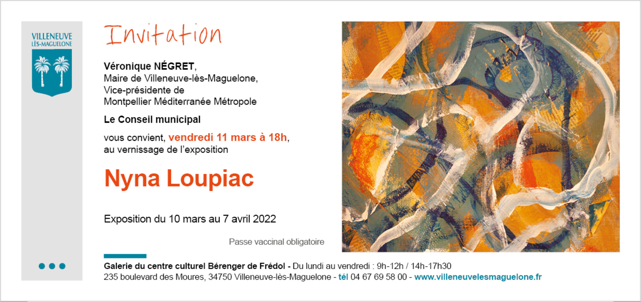 Exposition Nyna Loupiac Vernissage ► vendredi 11 mars 2022, 18h00. Galerie du Centre culturel Bérenger de Frédol. 235, boulevard des Moures. 34750 - Villeneuve-lès-Maguelone -.