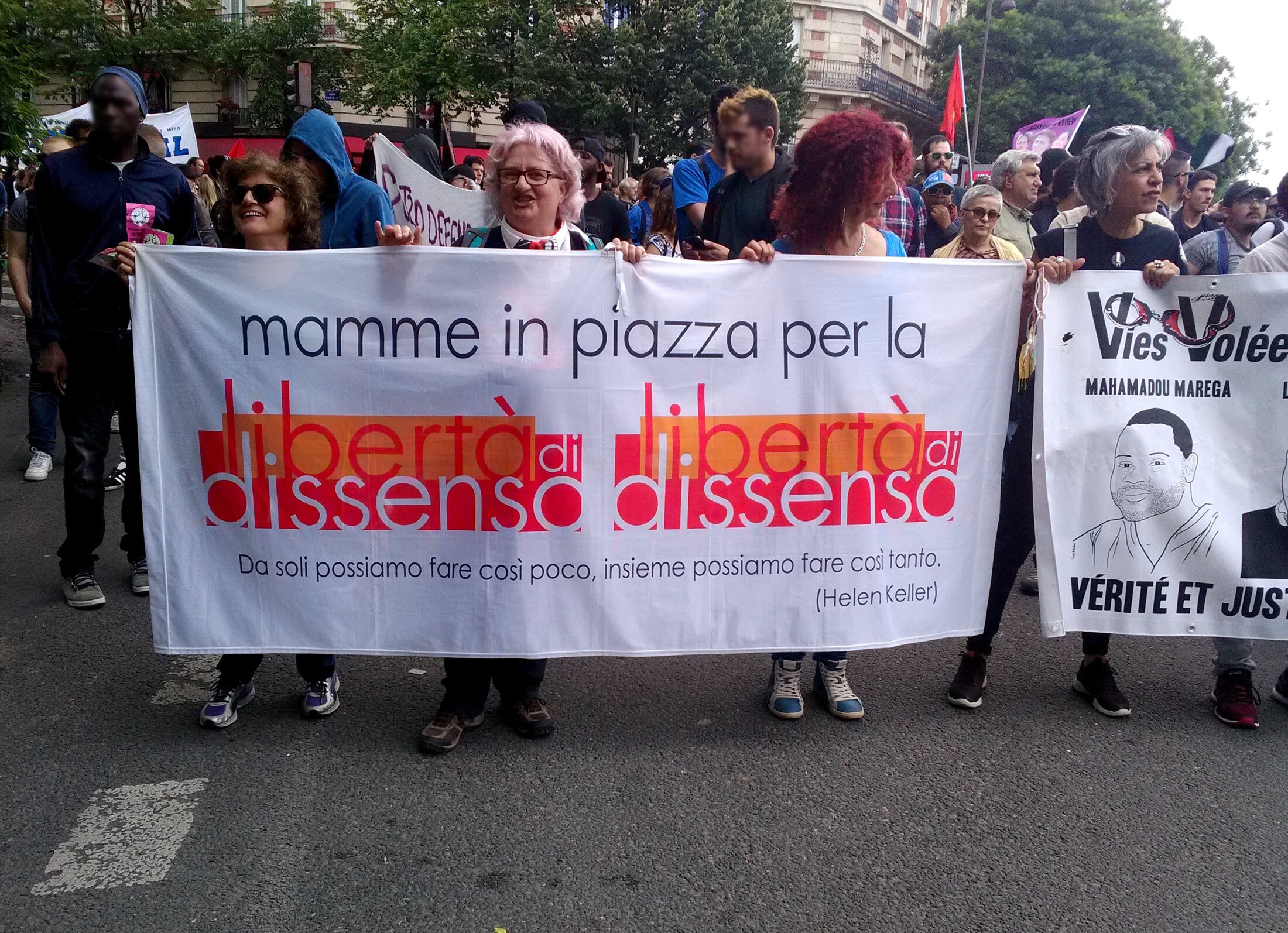 Cette année, la marche donnait toute leur place aux « mères d’antifascistes italiens, espagnols, grecs, français tués ou emprisonnés » qui ont pris la parole au départ. Sur cette banderole d’un des collectifs de mères italiennes « pour la liberté de la dissidence », une citation d’Hélène Keller : « seul.es nous pouvons faire si peu, ensemble, nous pouvons faire tellement ». Étaient aussi présents plusieurs collectifs contre les violences policières, dont le Collectif Vies volées et le Comité Adama, qui sont intervenus.