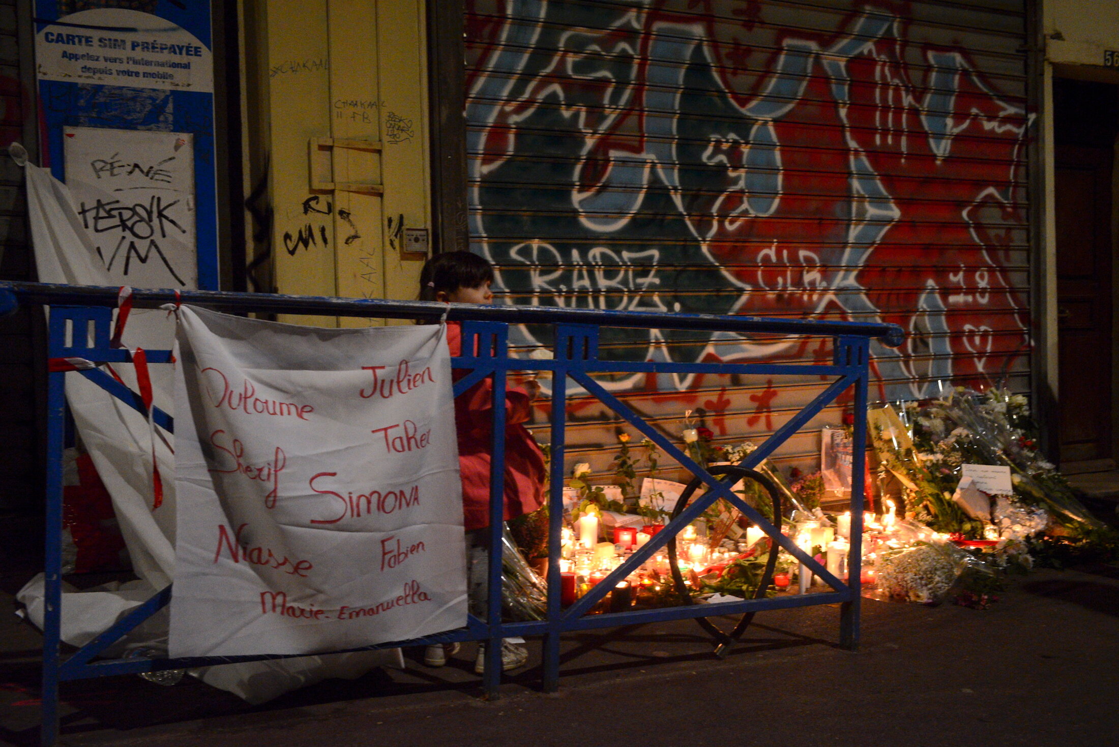 Les noms des 8 personnes mortes dans l'effondrement écrites sur un drap, devant les bougies et leurs photos, rue d'Aubagne, le 10 novembre 2018.