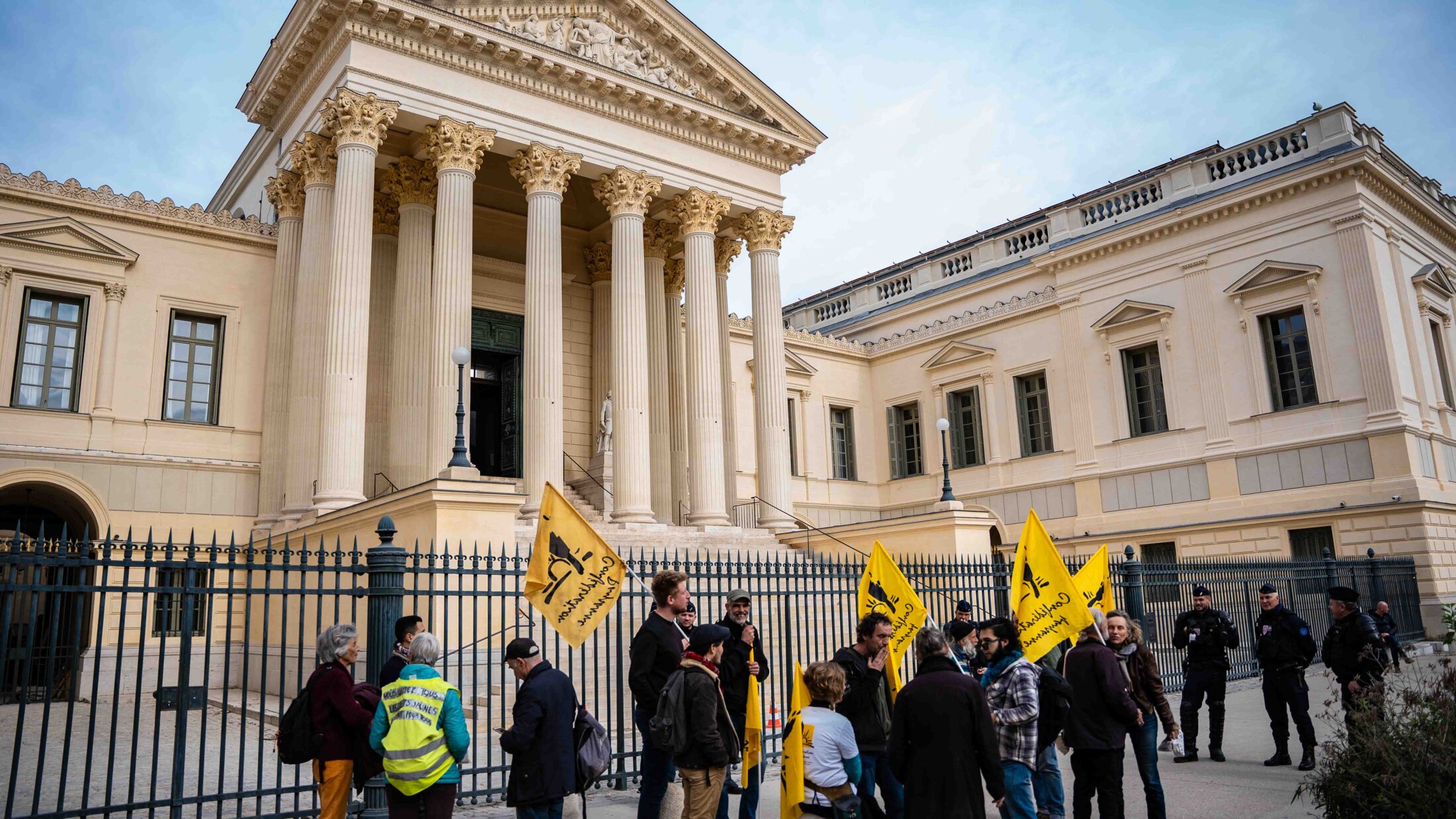 Pas les mêmes privilèges que la FNSEA, quelques porte drapeaux sont stoppés par des CRS devant le tribunal, une délégation de plusieurs syndiqués et soutiens a pu se rendre à la préfecture plus loin