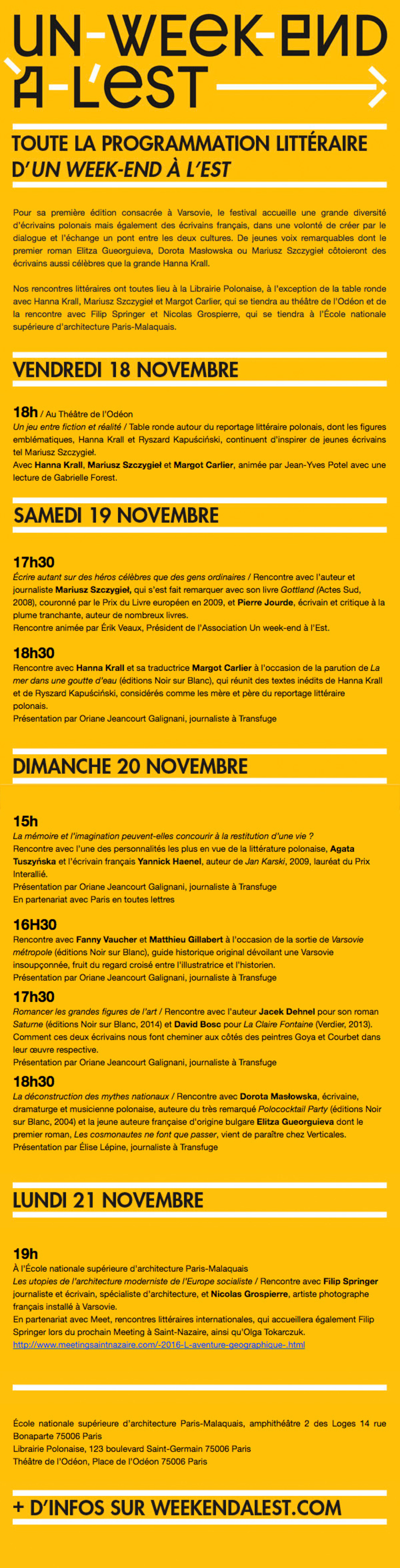 Pour sa première édition consacrée à Varsovie, le festival accueille une grande diversité d’écrivains polonais mais également des écrivains français, dans une volonté de créer par le dialogue et l’échange un pont entre les deux cultures. De jeunes voix remarquables, dont le premier roman Elitza Gueorguieva, côtoieront des écrivains aussi célèbres que la grande Hanna Krall.