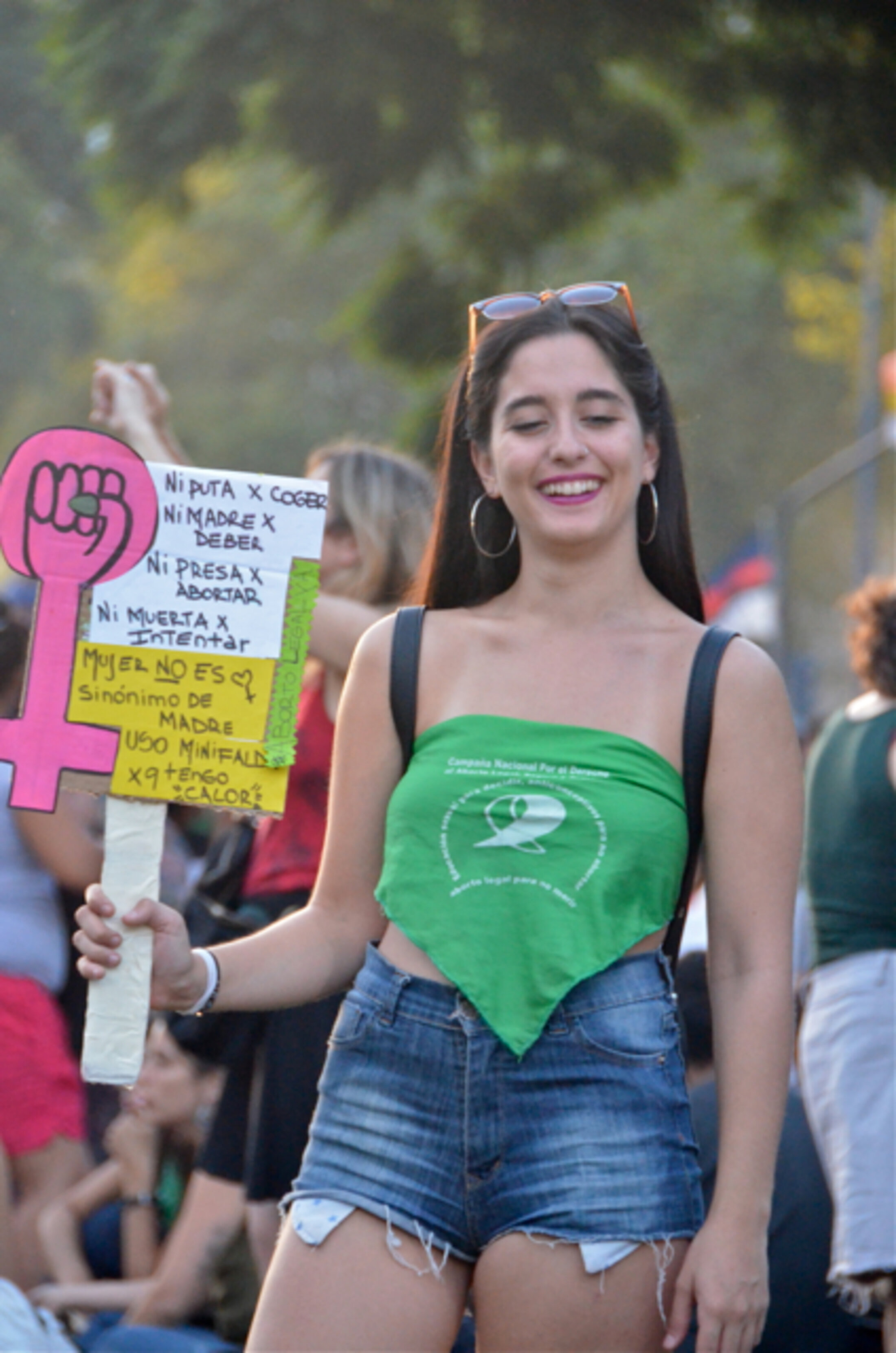 "Ni pute parce que je baise ni mère par devoir, ni emprisonnée parce que j'avorte ni morte pour avoir essayé". "Le mot femme n'est pas synonyme de mère. Je porte une minijupe parce que j'ai chaud".