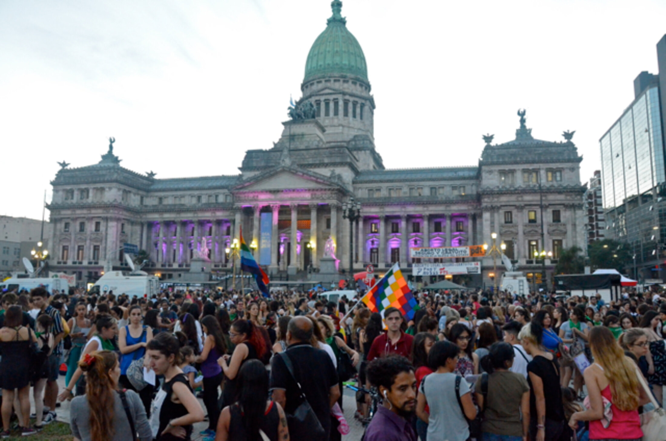 Une foule immense devant le Congreso de la Nación (Parlement). Le cortège de la « Campagne nationale pour un avortement légal, sûr et gratuit » fut l'âme de la marche, avec ses chansons pour l'avortement et contre le président Mauricio Macri.