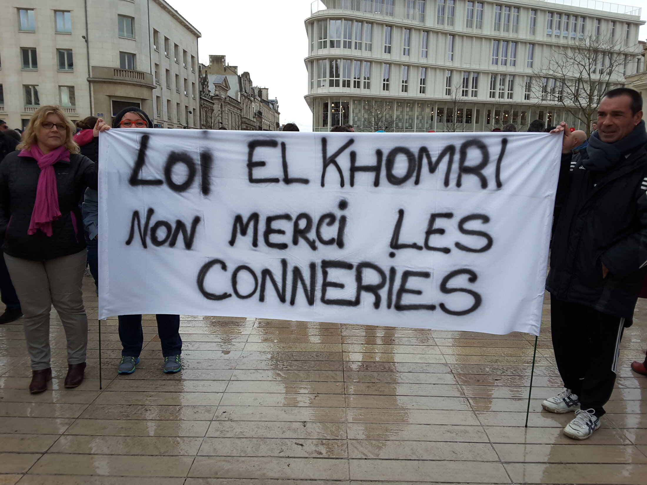 Pancarte porté par un manifestant le 9 mars 2016 à Poitiers, contre le projet de loi travail, pendant que peu à peu les gens envahissent la place de la mairie pour participer au rassemblement.