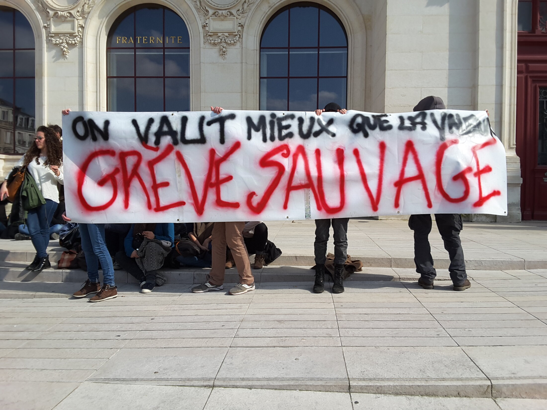 Etudiants tenant une banderole devant la mairie de Poitiers le 17 mars 2016, pendant que les opposants au projet de loi travail se rassemblent sur la place.