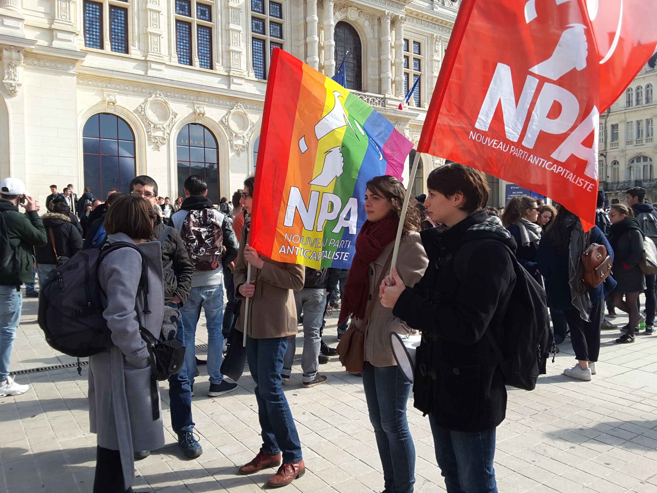Jeunes militantes NPA devant la mairie de Poitiers le 17 mars 2016, attendant le départ de la manifestation contre le projet de loi El Khomri.