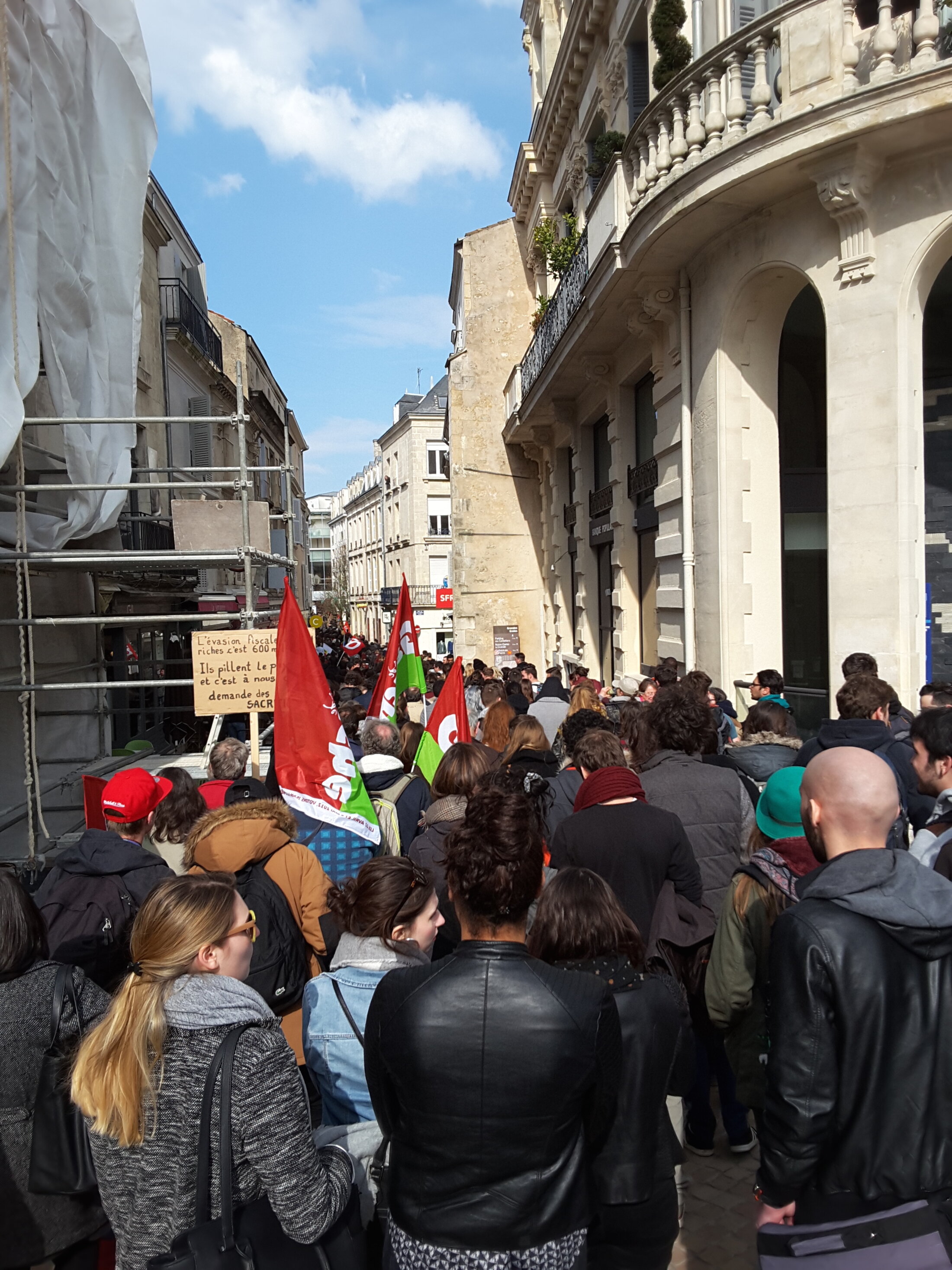 Le cortège s'engage dans la rue des Grandes Ecoles. Manifestation contre le projet de loi El Khomri, le 17 mars 2016 à Poitiers.