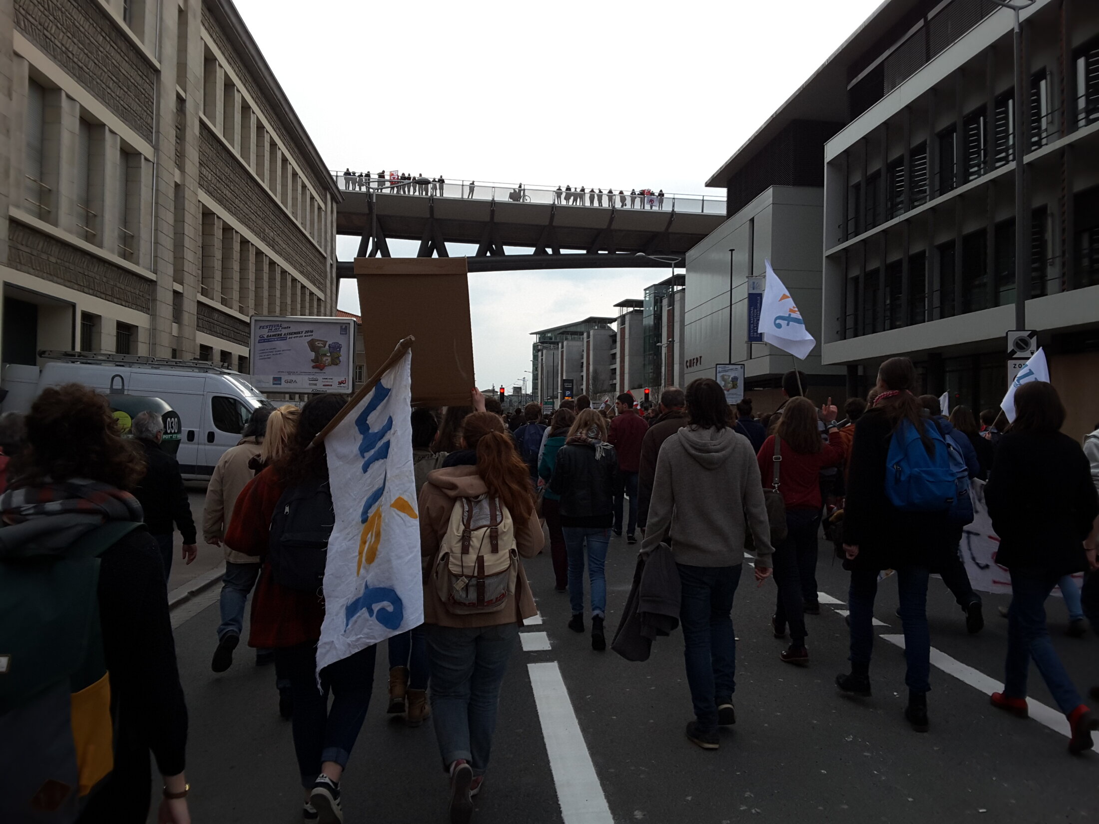 Les manifestants se mettent en mouvement vers le centre-ville piéton. Poitiers, le 17 mars 2016, manifestation contre le projet de loi travail.