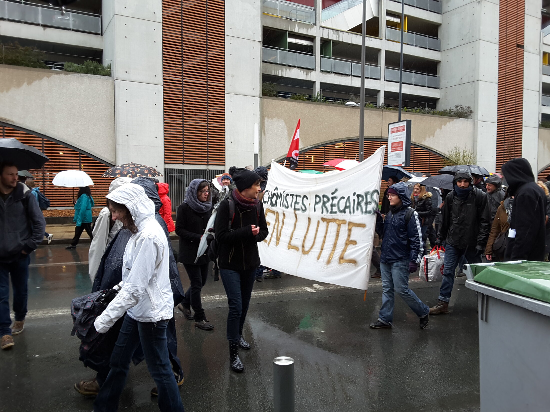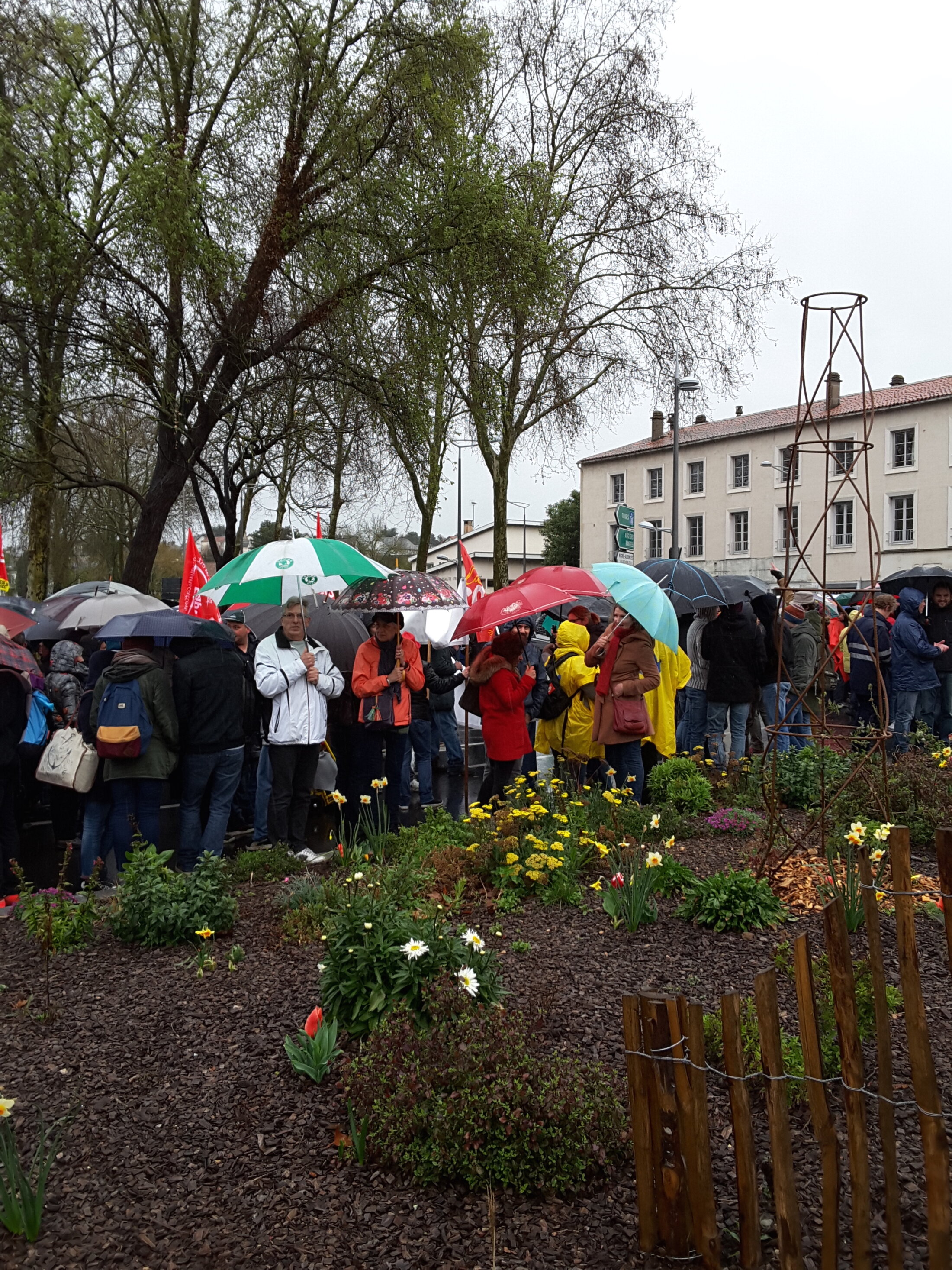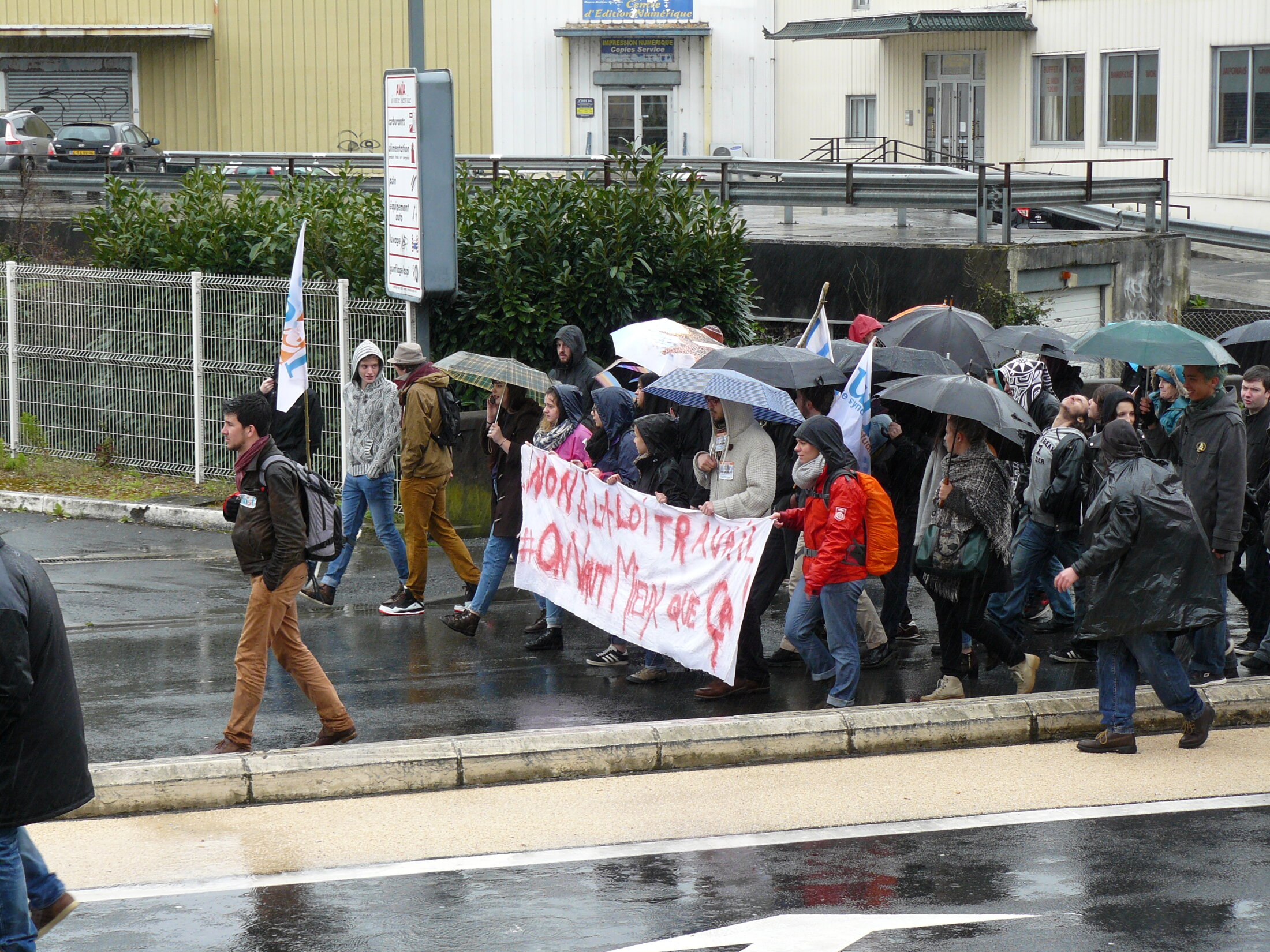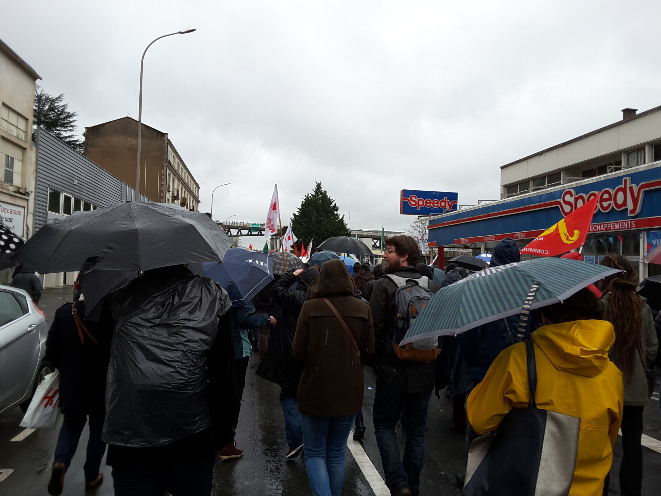Les manifestants attendent sous la pluie, Porte de Paris, le départ du cortège (manifestation contre la loi El Khomri, Poitiers le 31 mars 2016).