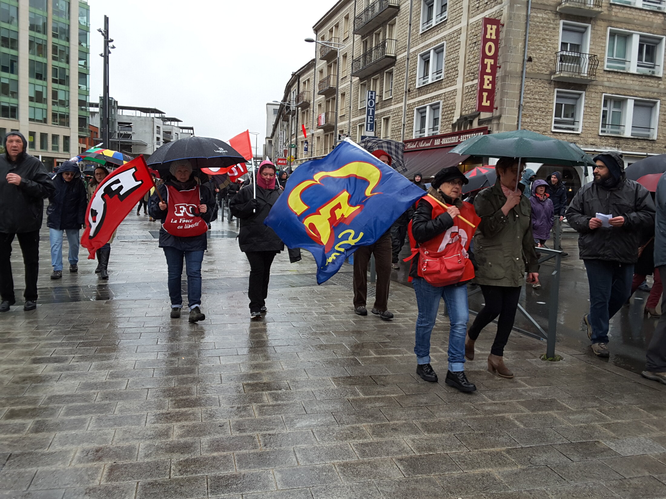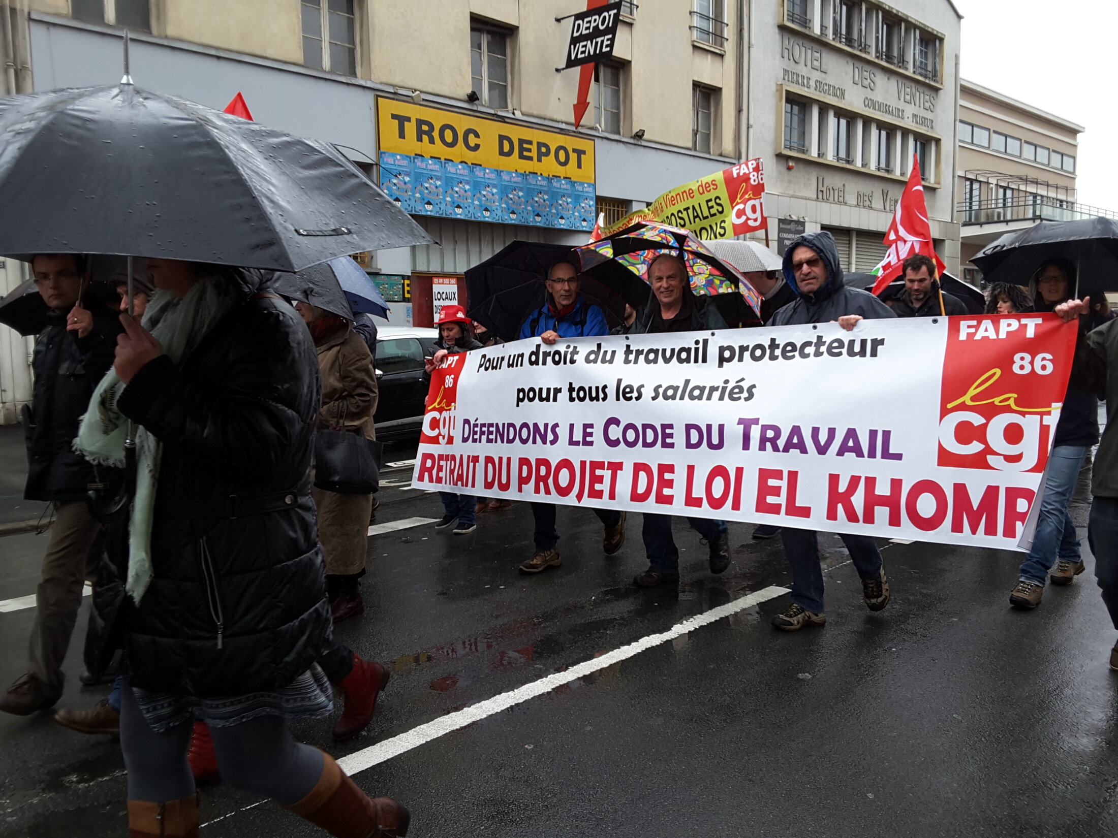 6 degrés, rafales glacées de vent et de pluie : et pourtant près de 7000 personnes ont manifesté pendant 3 heures dans les rues de Poitiers, répondant ainsi au 3ème rassemblement du mois mars contre le projet de loi El Khomri. Quelques photos prises au portable sous un parapluie et depuis une fenêtre...