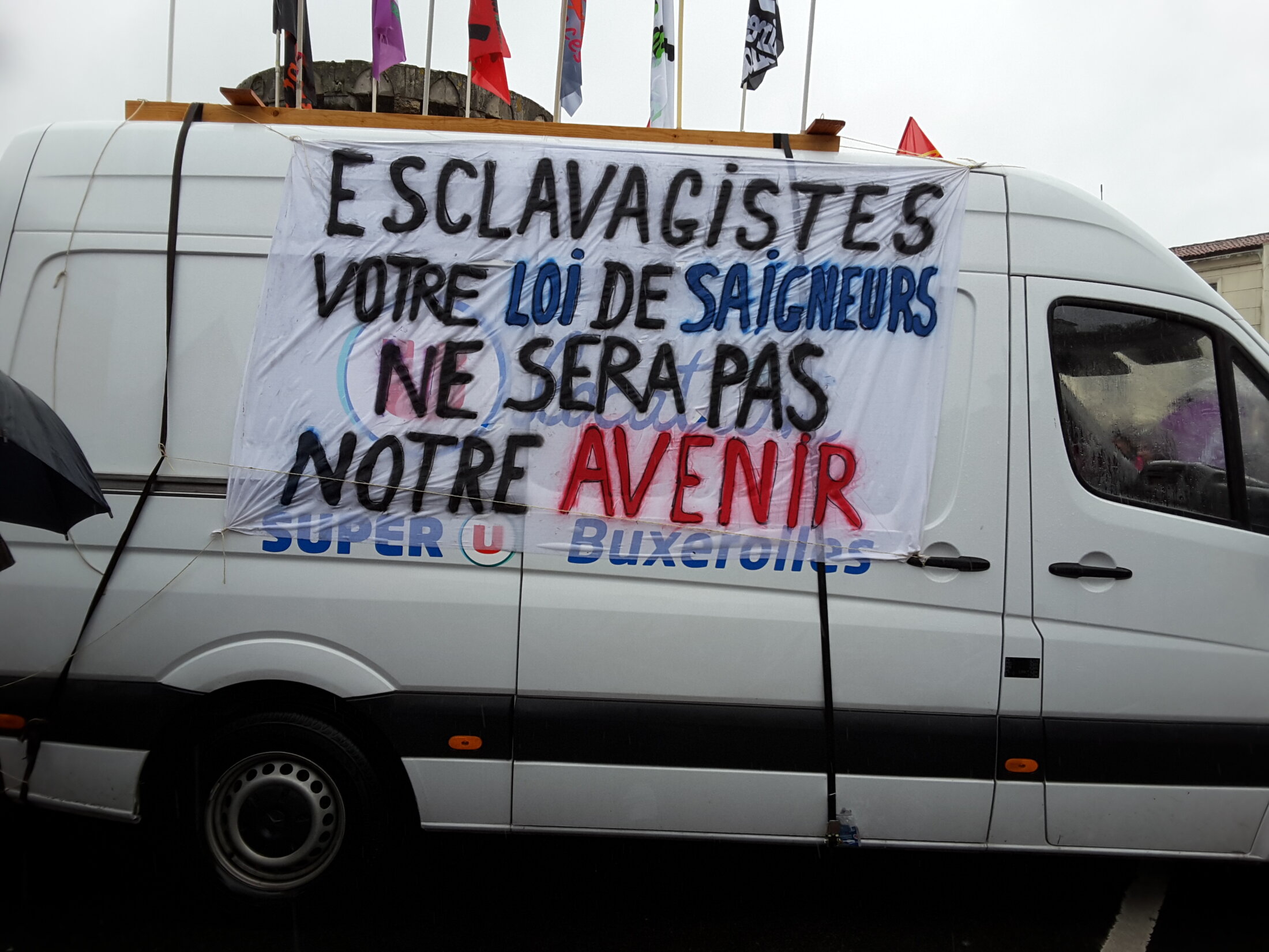Le camion de la CGT à Poitiers le 31 mars 2016 lors du rassemblement Porte de Paris, en attente du départ de la manifestation contre le projet de loi travail.