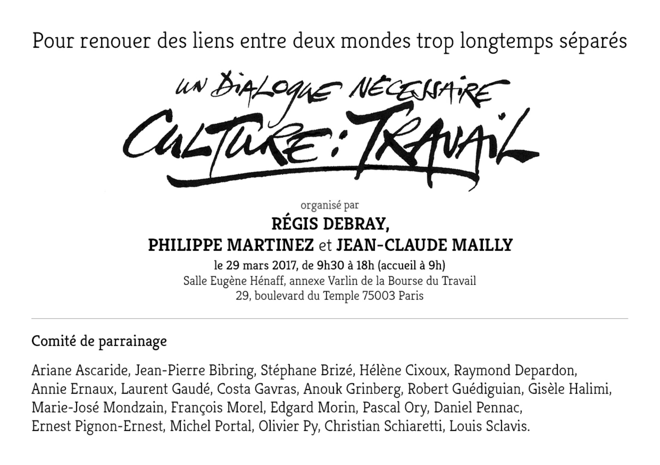 Une inscription préalable est nécessaire.Merci de bien vouloir confirmer votre présence avant le 15 mars, à l’adresse suivante :culturetravail@gmail.com